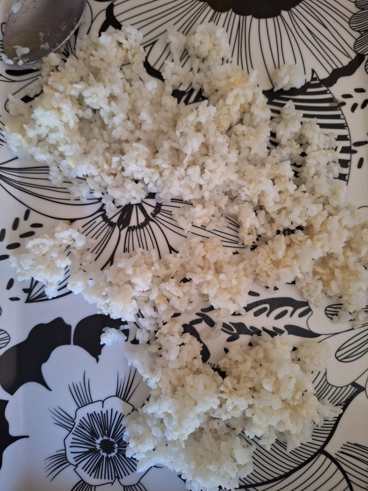 Vierte el arroz en una bandeja y ve añadiendo el aliño, separando los granos y enfriando con un abanico. Yo directamente lo dejo secar por sí solo y voy moviendo los granos.