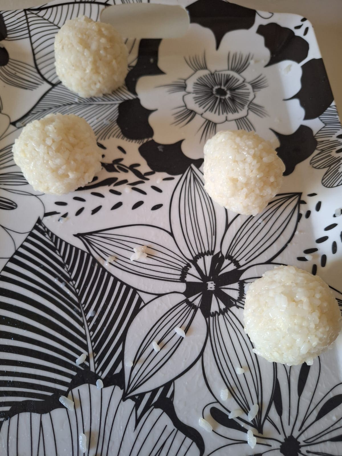Os recomiendo no poner demasiado relleno, yo me emocioné y luego me costaba un poco cerrar la bola y darle forma. Para rematar, una tirita de alga nori y ya tenemos listo nuestro onigiri.