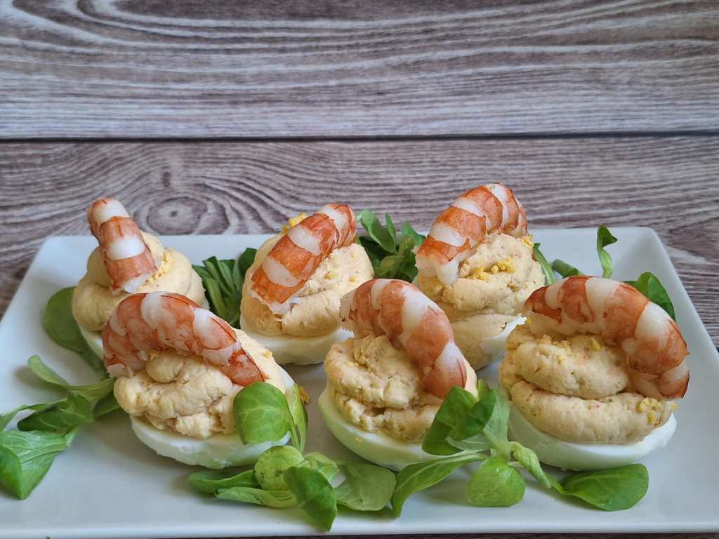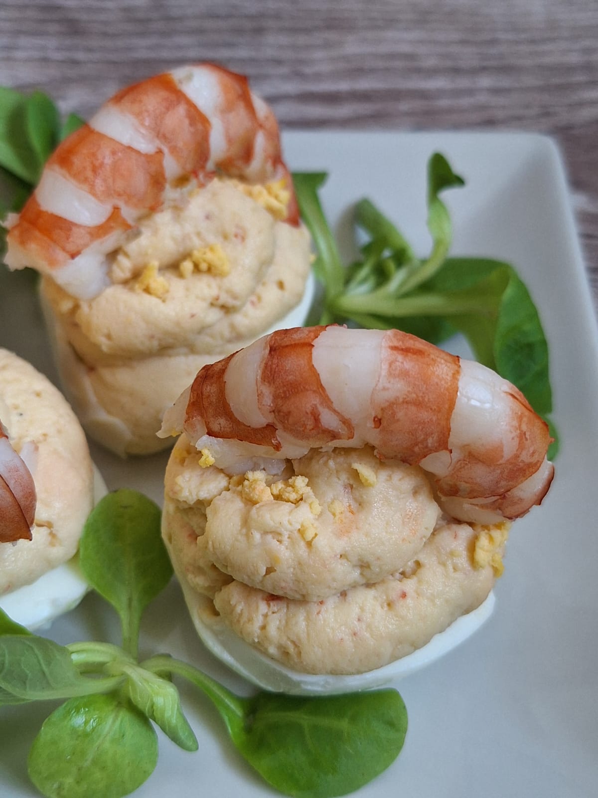 Prepara la mayonesa de huevo: en el vaso de la batidora vierte los huevos, la sal, (el vinagre/zumo de limón) y el aceite y emulsiona. Mezcla la con los langostinos y yemas. Coloca en una manga, rellena los huevos y decora con un langostino.
