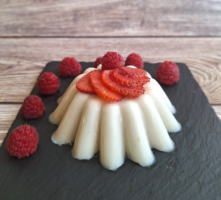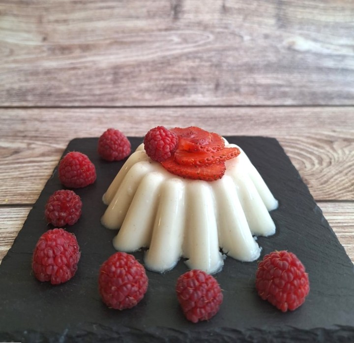El resultado es un postre delicioso, con un sabor delicado a coco y una textura muy liviana, similar a la panna cotta tradicional. He acompañado con frutos rojos porque era lo que tenía por casa y le daba un puntito de color y un contraste de sabor perfecto, pero podéis utilizar la fruta que más os guste. En algunos sitios he leído que las fresas son liberadoras de histamina, pero en mi dieta las tengo permitidas, así que podéis sustituirlas por otra fruta o, simplemente, servirla sólo con frambuesas.