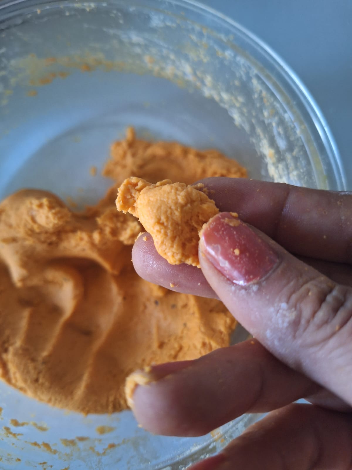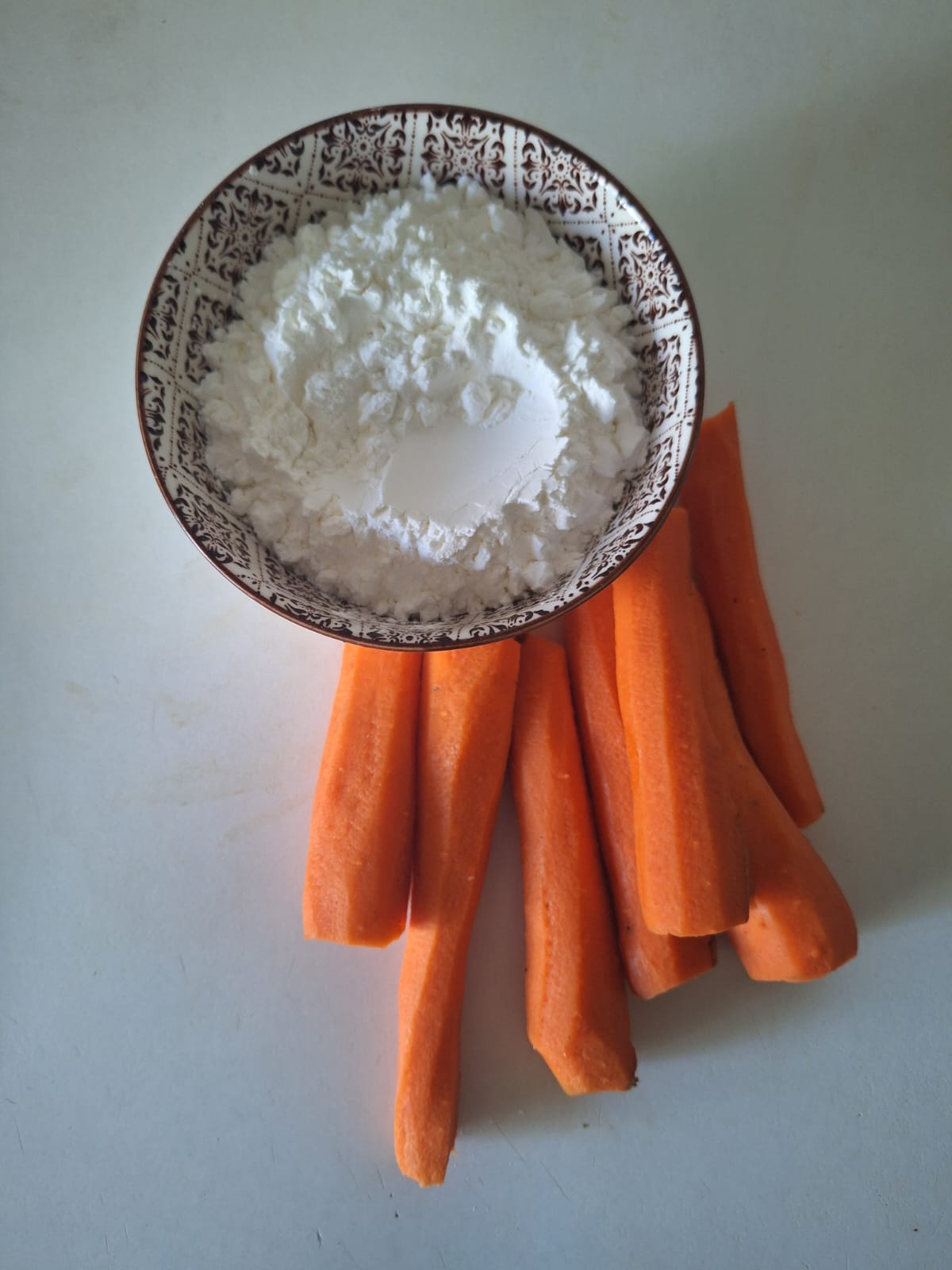 Añade la maicena poco a poco, mezclando con una lengua y finalmente con las manos, hasta obtener una masa manejable (no hace falta que quede completamente seca). Si te queda un poco húmeda, pero puedes manejarla barnizando tus manos con aceite, no añadas más maicena. Si te queda demasiado húmeda, agrega un poco más de maicena, todo dependerá de la humedad que tengan las zanahorias.