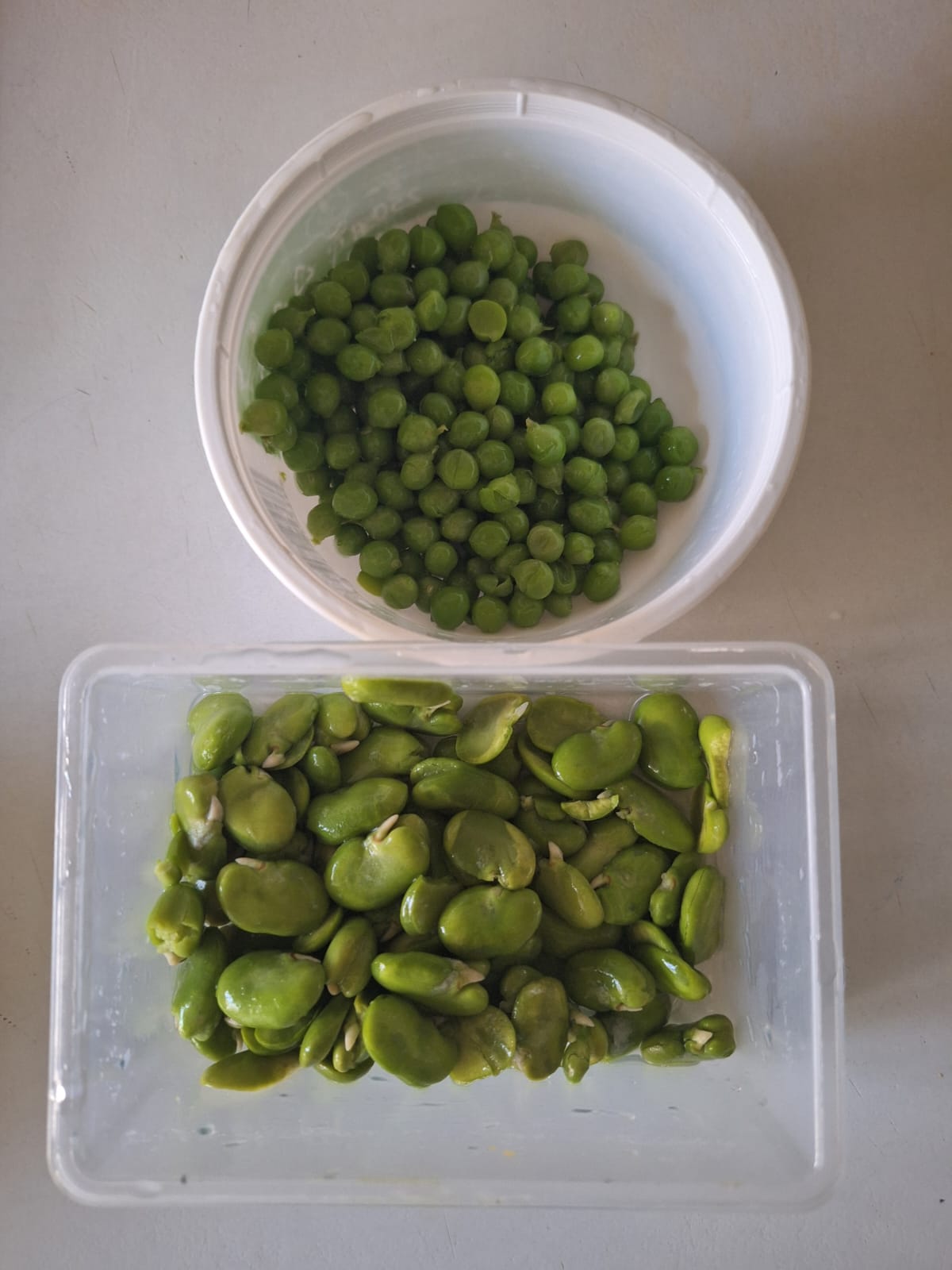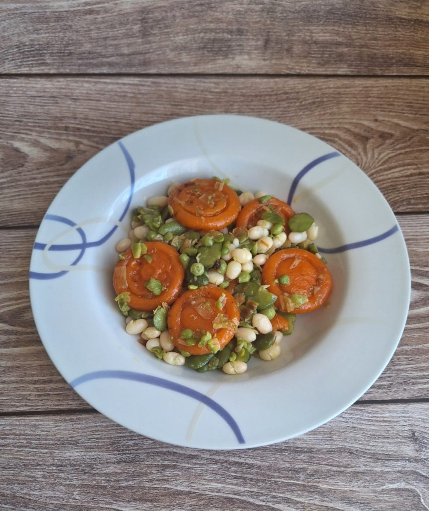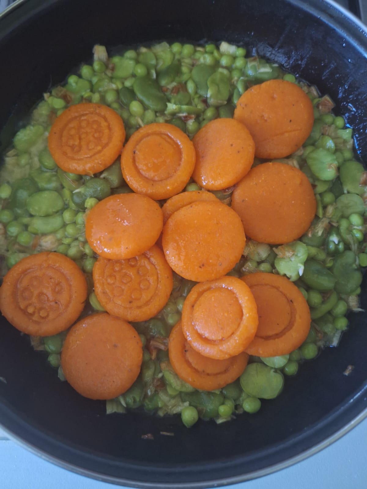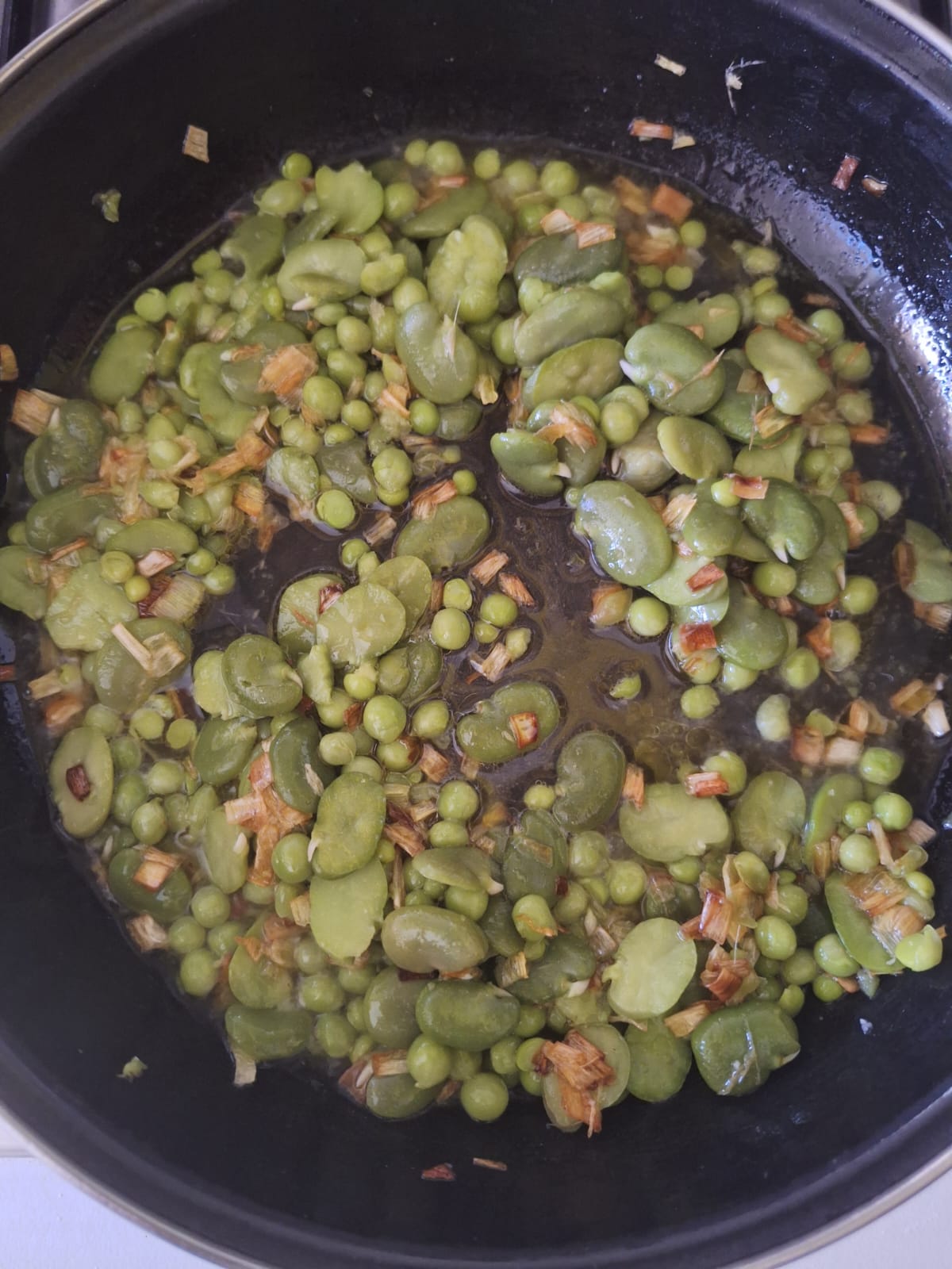 Podéis acompañar con una salsa, pero yo preferí tirar de verduritas de la mamma. Es cierto que la temporada de guisantes y habas ha terminado, pero las tengo congeladas, así que puedo disfrutar de ellas todo el año. Aquí libre albedrío.