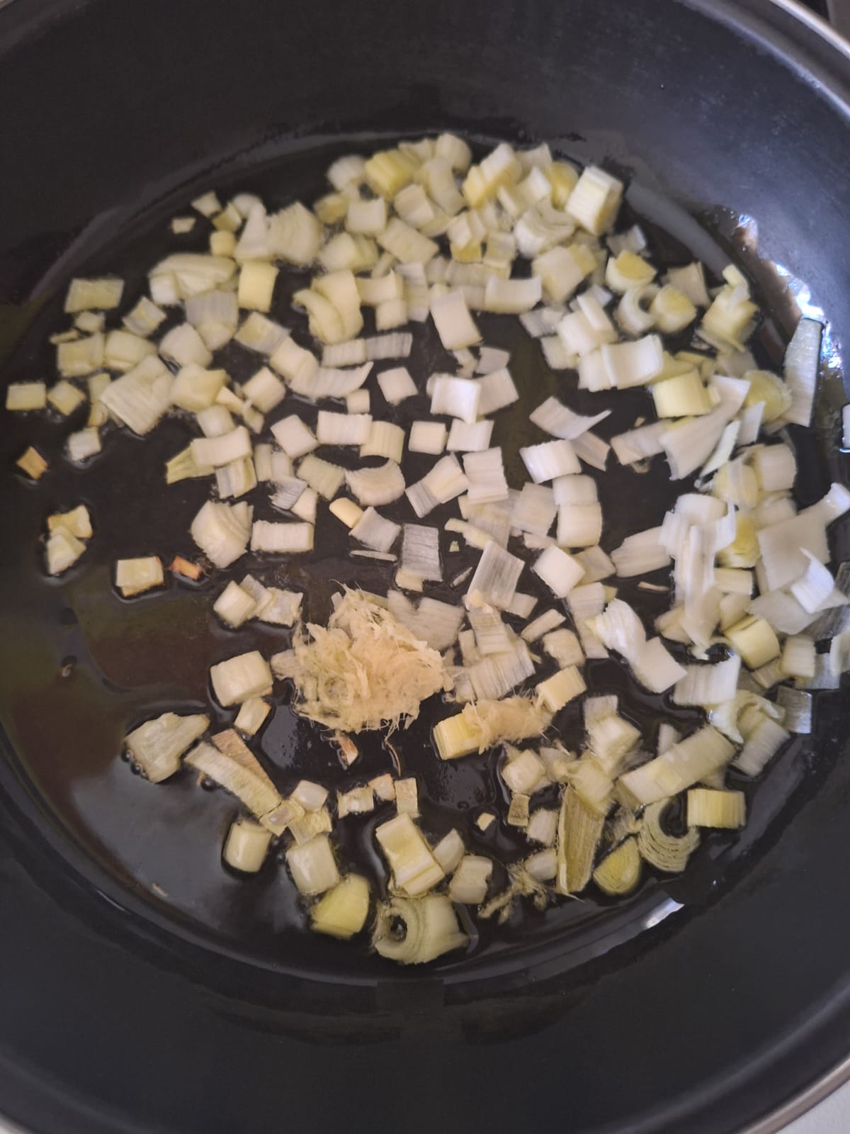 Cuece los guisantes y habas por separado (tienen diferente tiempo de cocción), escurre y reserva. Limpia el puerro, corta finamente y pocha en una sartén con un poco de aceite. Agrega el jengibre majado o cortado finamente. Una vez lo tengas agrega los guisantes y las habas, sazona y mezcla bien.