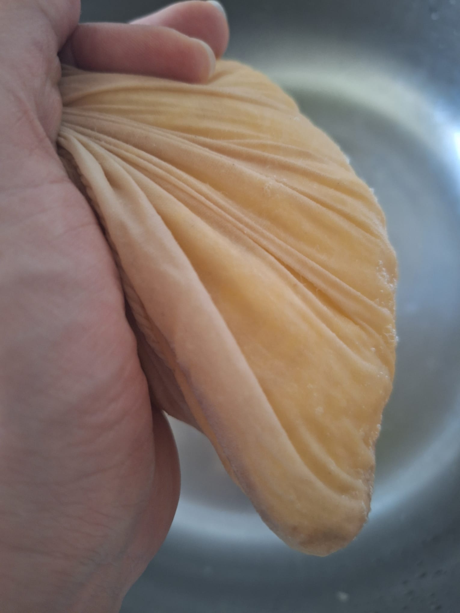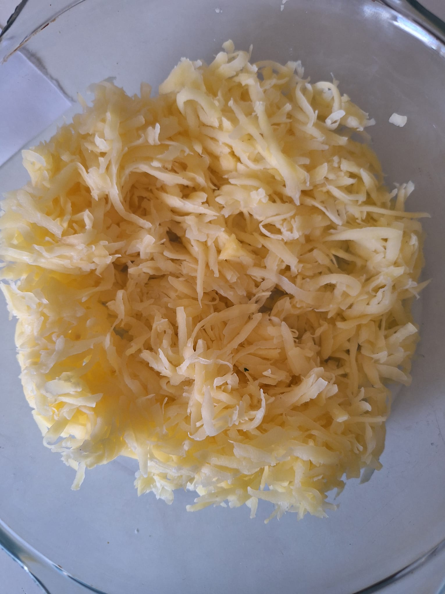 Pela las patatas y ralla con un rallador. Escurre toda el agua que puedas con ayuda de una bolsa de algodón (o un paño limpio).