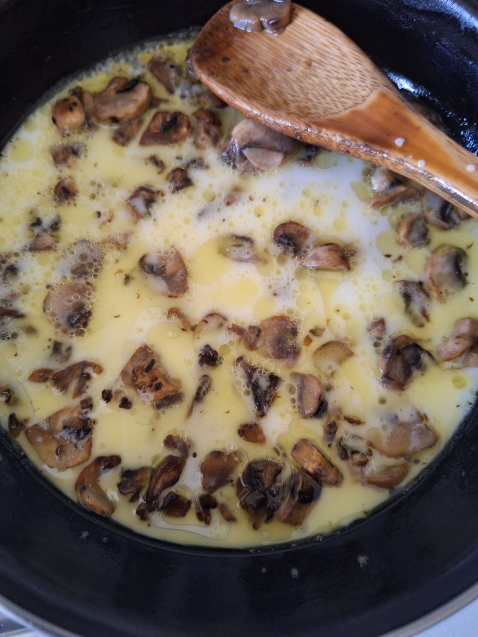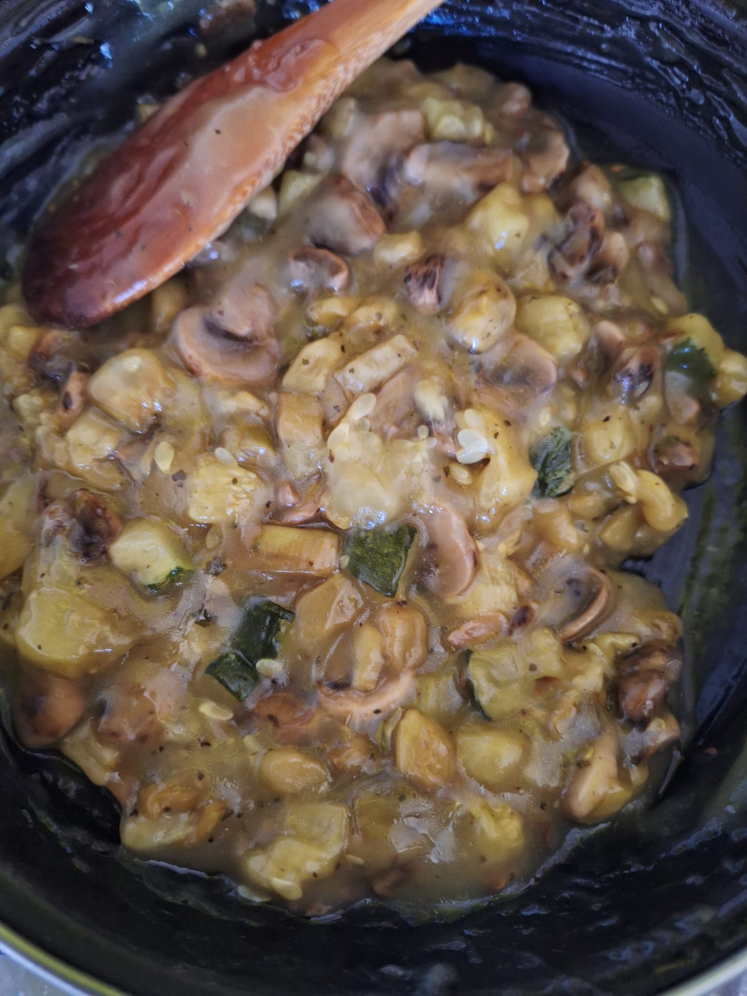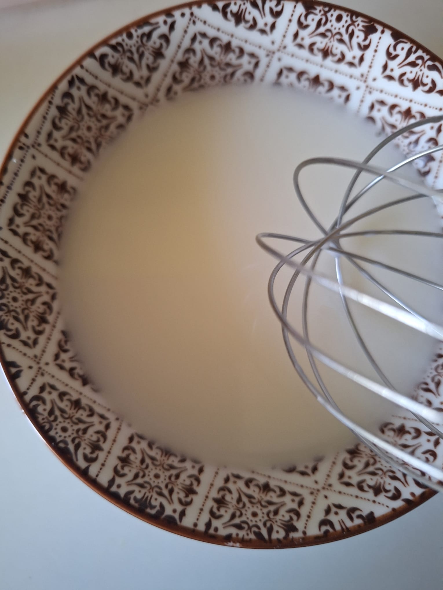 Disuelve una cucharada de maicena en la bebida de arroz. Cuando las verduras estén listas, incorpora a la sartén y mezcla hasta que empiece a espesar.