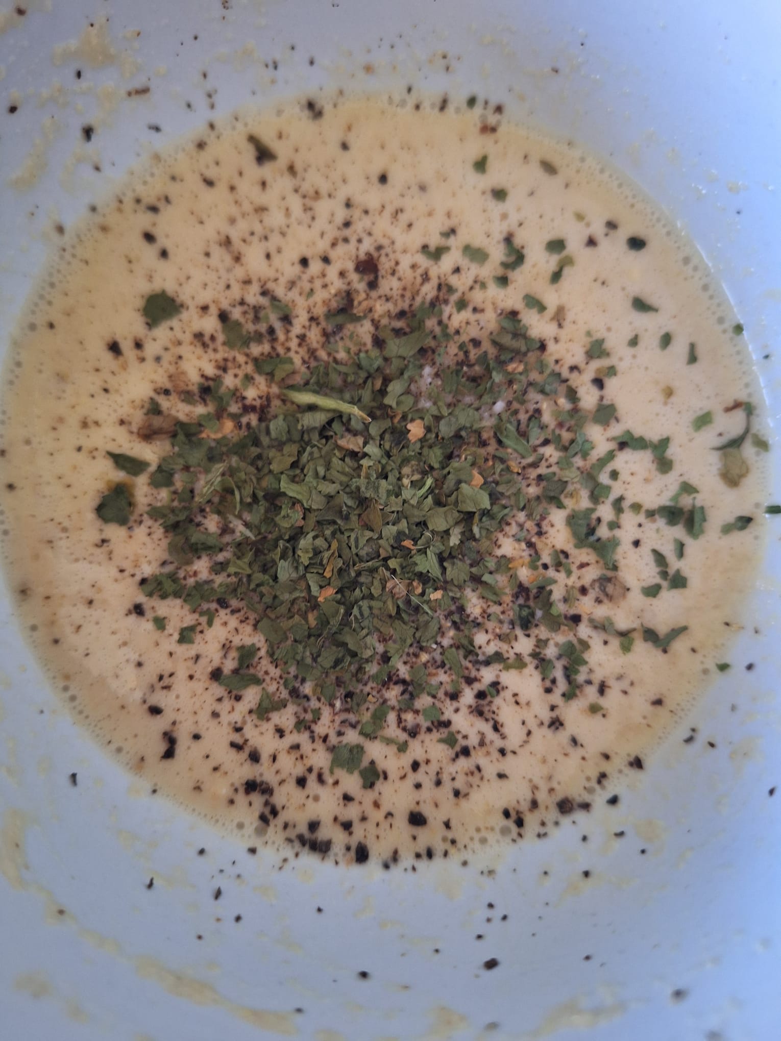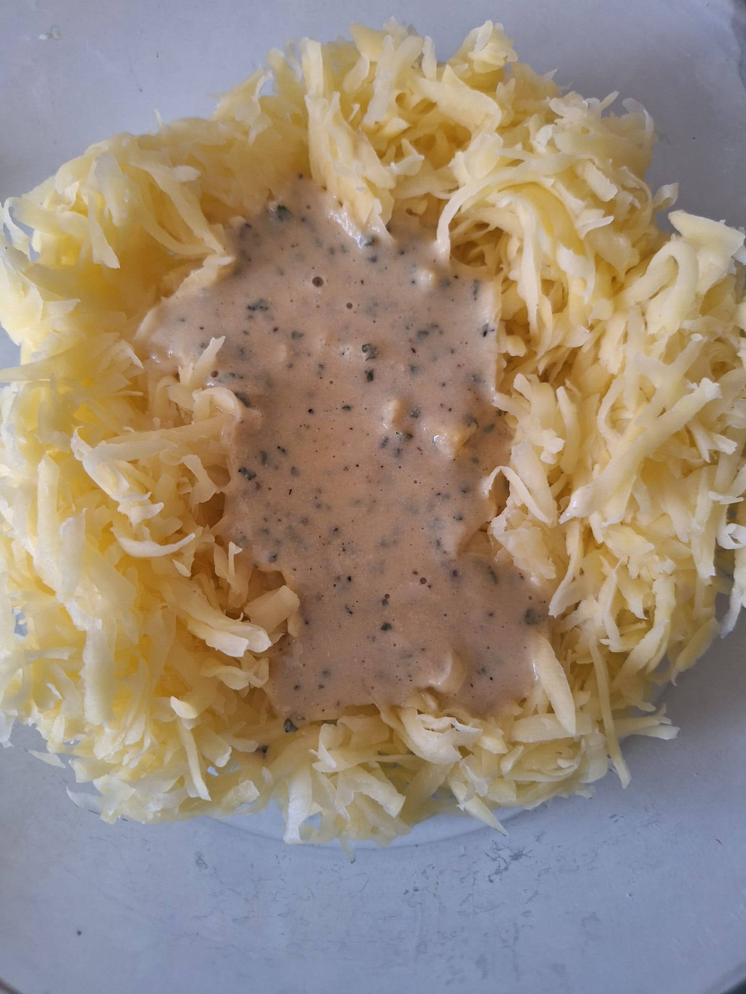 Mezcla la harina de garbanzos con el agua, la sal y las especias. Reposa 10 minutos para que adquiera consistencia. Mezcla con las patatas.