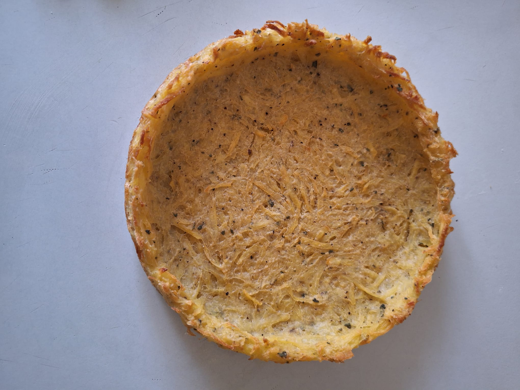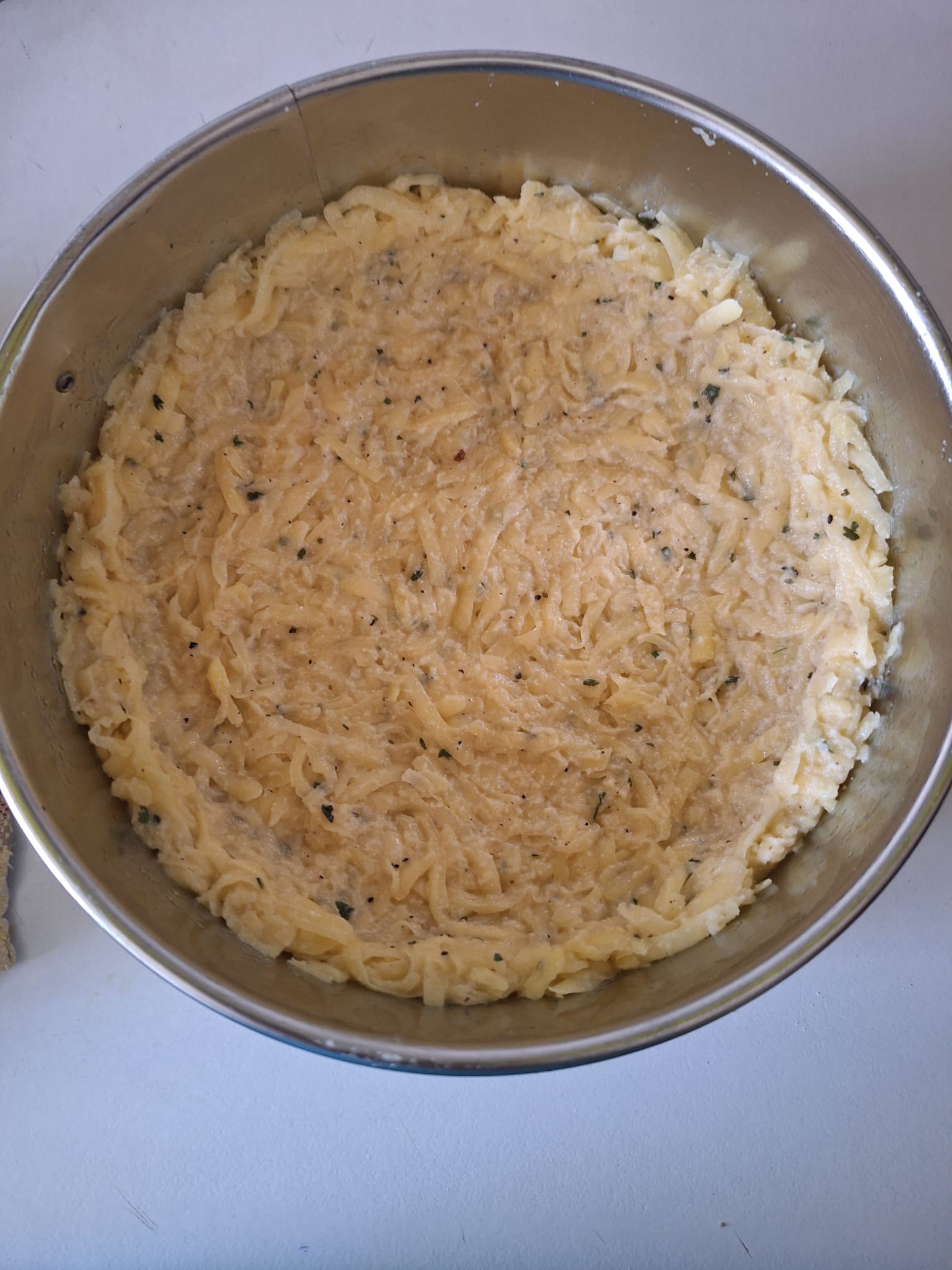 Engrasa un molde con aceite y vierte la mezcla de patata, presiona con los dedos para extender bien la base y formar los bordes. Hornea durante 40 min o hasta que la superficie se vea seca y doradita. Reserva.
