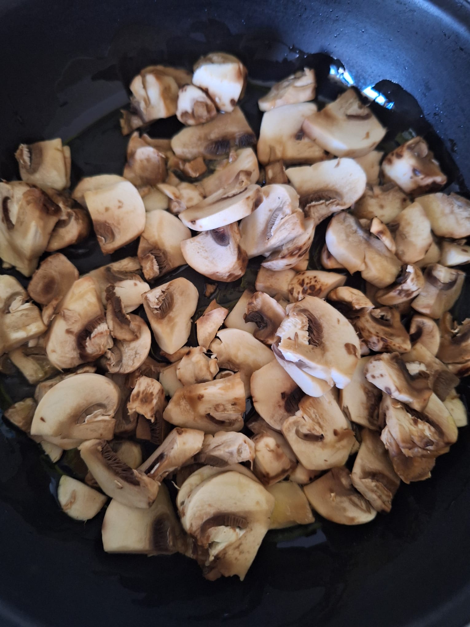 Lava el calabacín y la berenjena, corta en cubos pequeños y cocina en una sartén con un poco de aceite a fuego medio-bajo. Limpia los champiñones y corta en láminas. Agrega a lo anterior cuando estén medio cocinados.