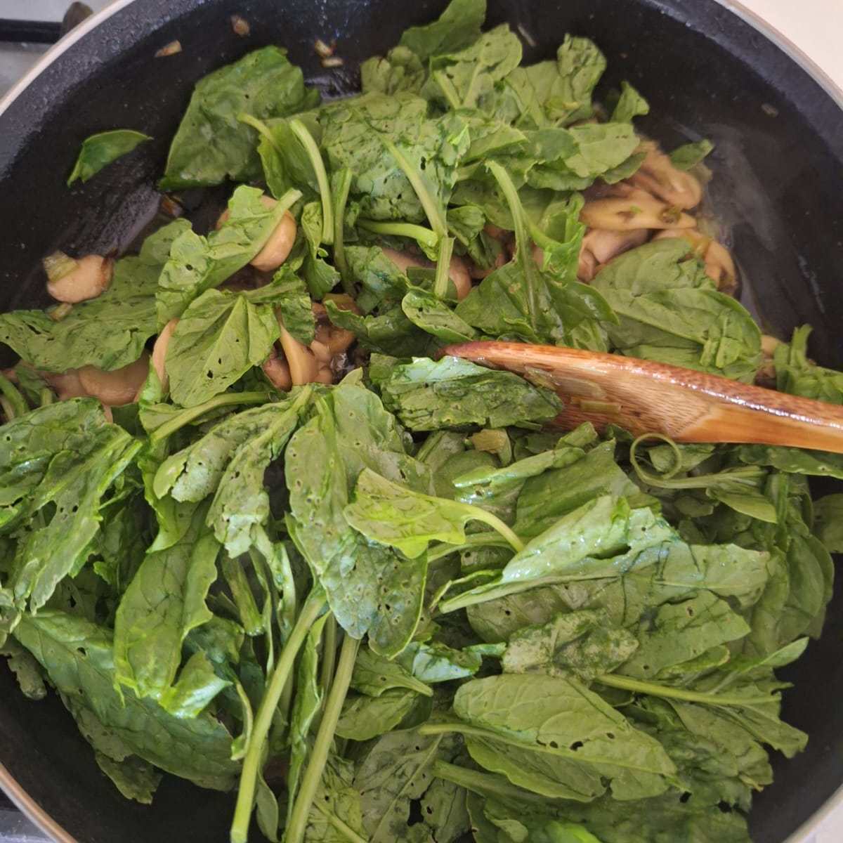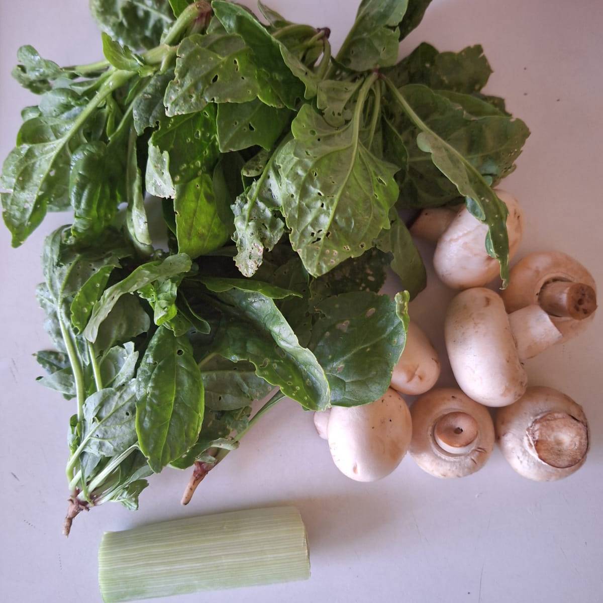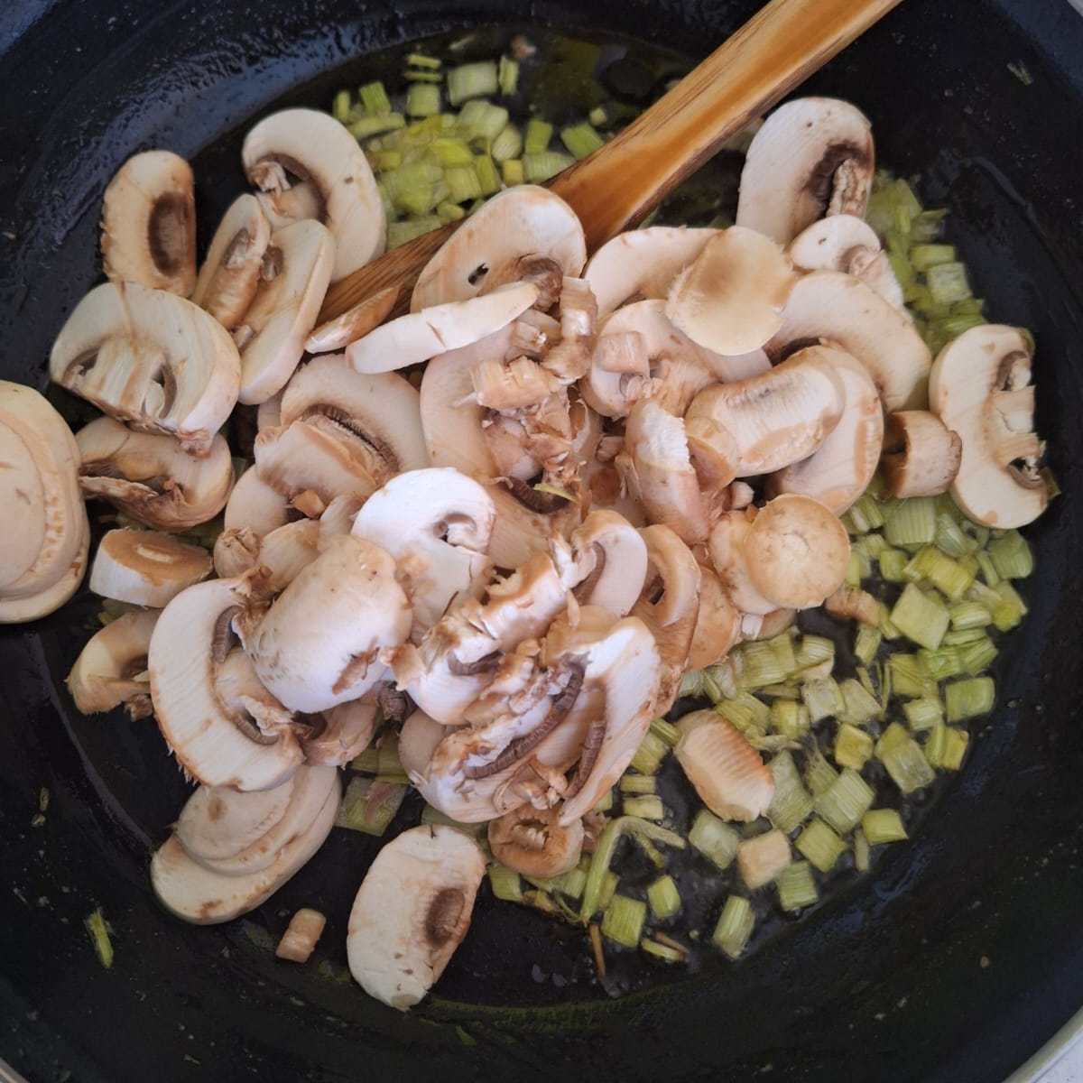 Mientras tanto prepara la guarnición. Lava el puerro y corta finamente, pocha en un poco de aceite. Limpia los champis, corta en láminas y agrega cuando el puerro empiece a transparentar. Lava las espinacas y corta en tiras. Cuando esté todo blandita añade las espinacas y deja reducir.
