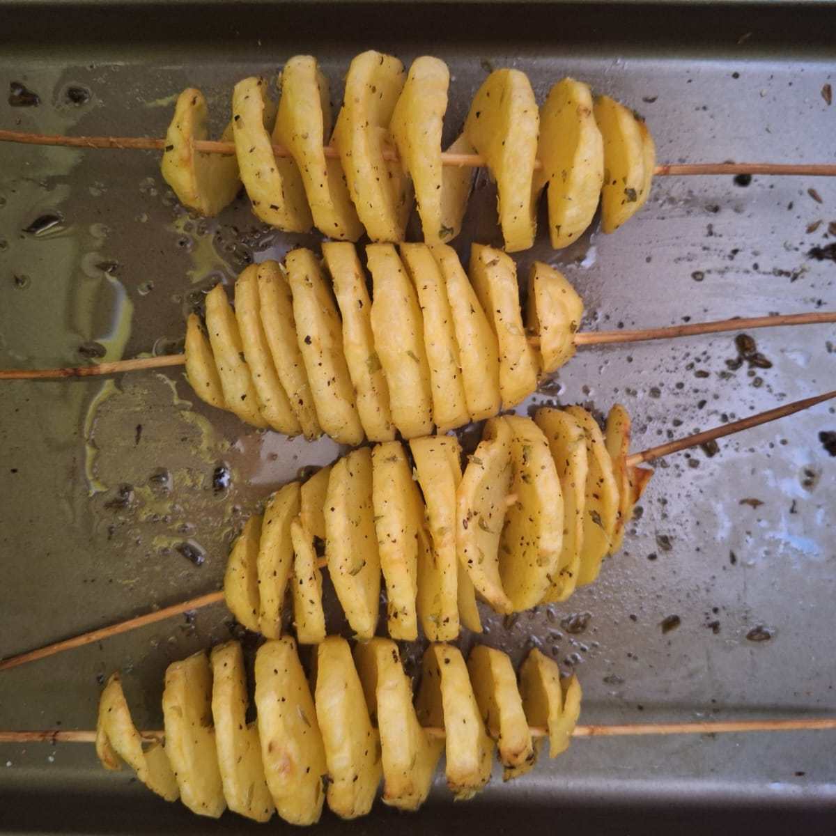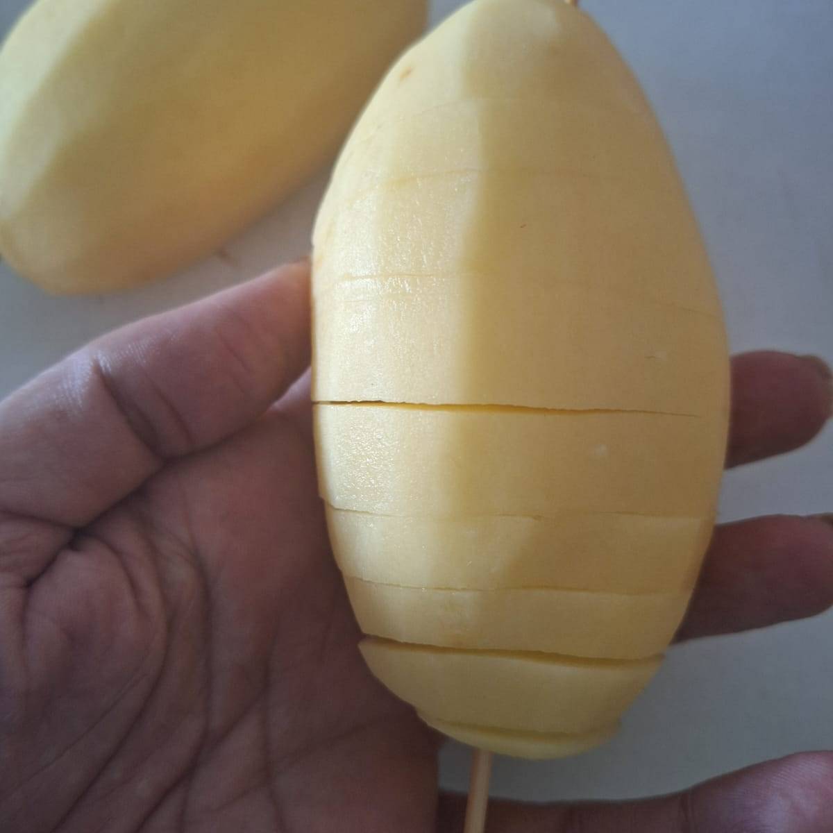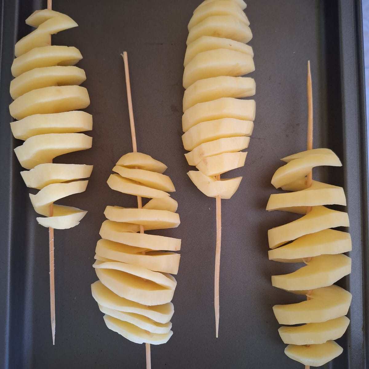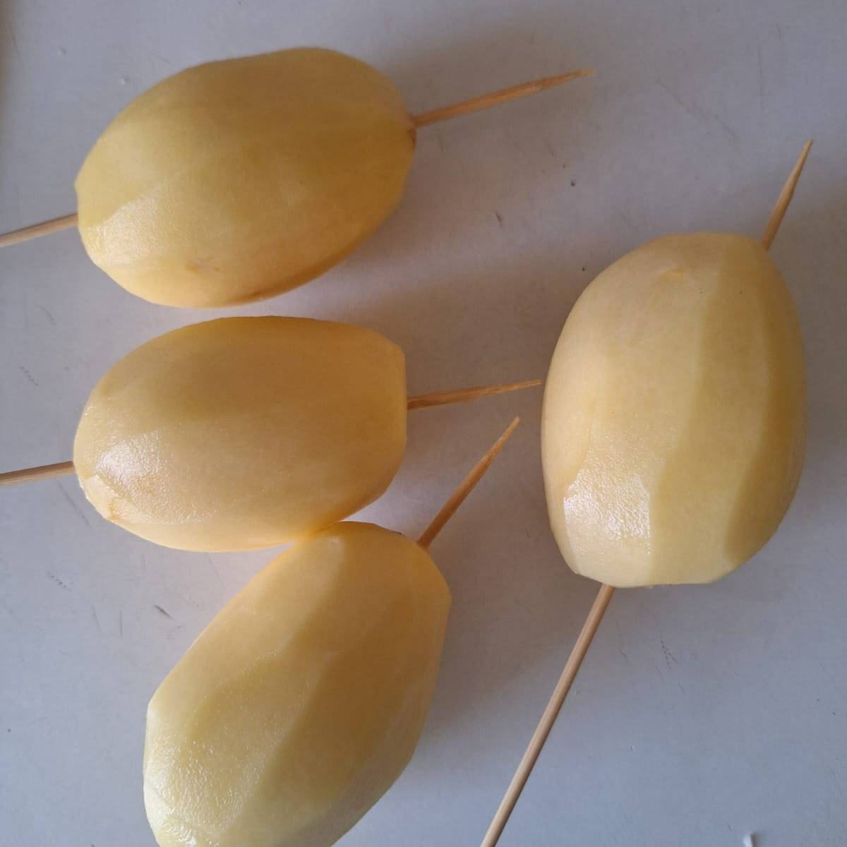 Pela las patatas e inserta un palillo de pincho moruno en el centro (puedes utilizar las patatas bien lavadas con piel). Con cuidado ve cortando en espiral, girando la patata e intentando hacer un corte de pequeño grosor.