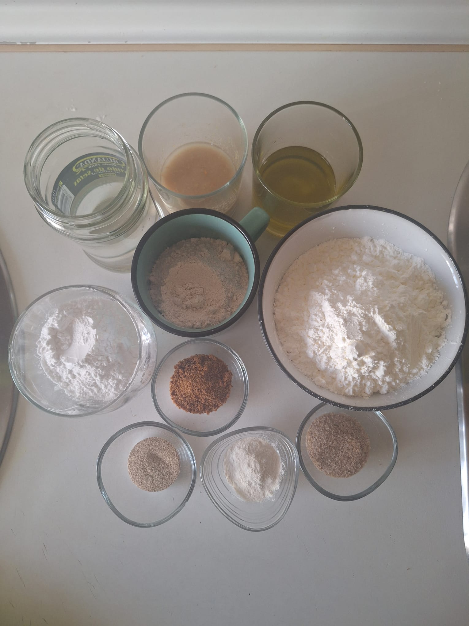 En la zona en la que vivo sólo encuentro pan sin gluten tipo «Bimbo» y, la verdad, me resulta muy artificial. Vivo a una hora en coche de una ciudad grande donde puedo encontrar otro tipo de panes, pero los que he probado hasta ahora tampoco me han convencido demasiado. He probado con mix de harinas y el resultado ha sido muy bueno, pero me parece muy caro y realmente no sé qué es lo que llevan. Así que decidí hacer mi kit de supervivencia y ponerme manos a la obra. No os voy a decir la de intentos que he hecho, ni la cantidad de producto que he tenido que tirar a la basura. Me duele en el alma.
