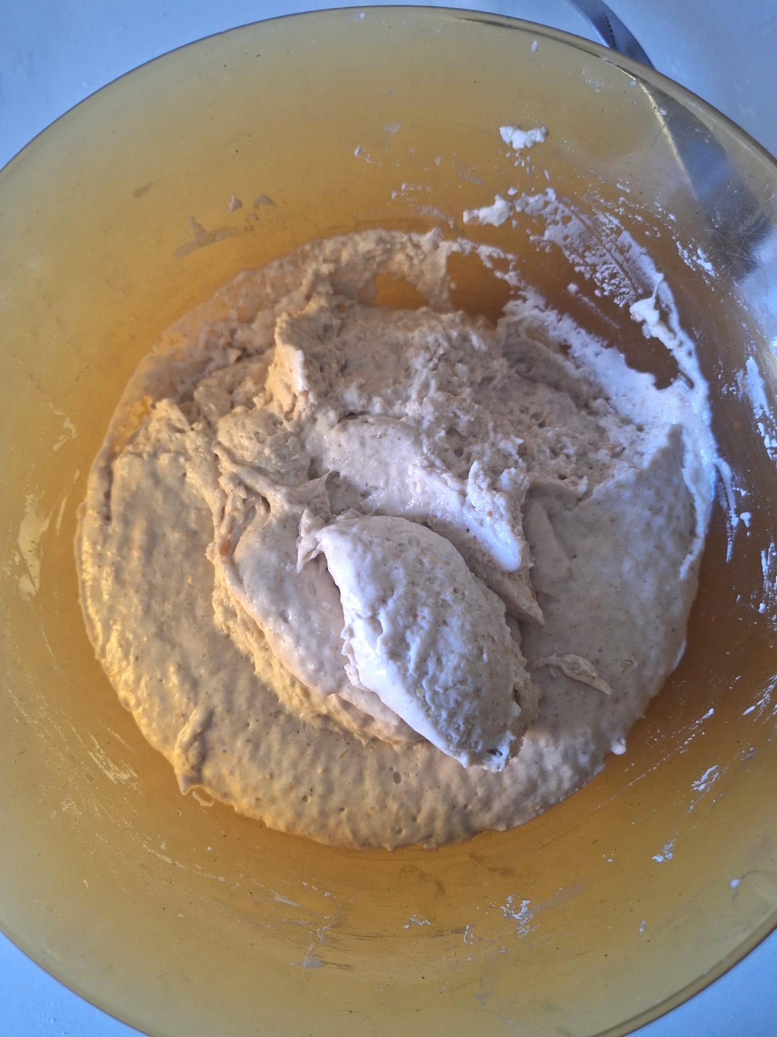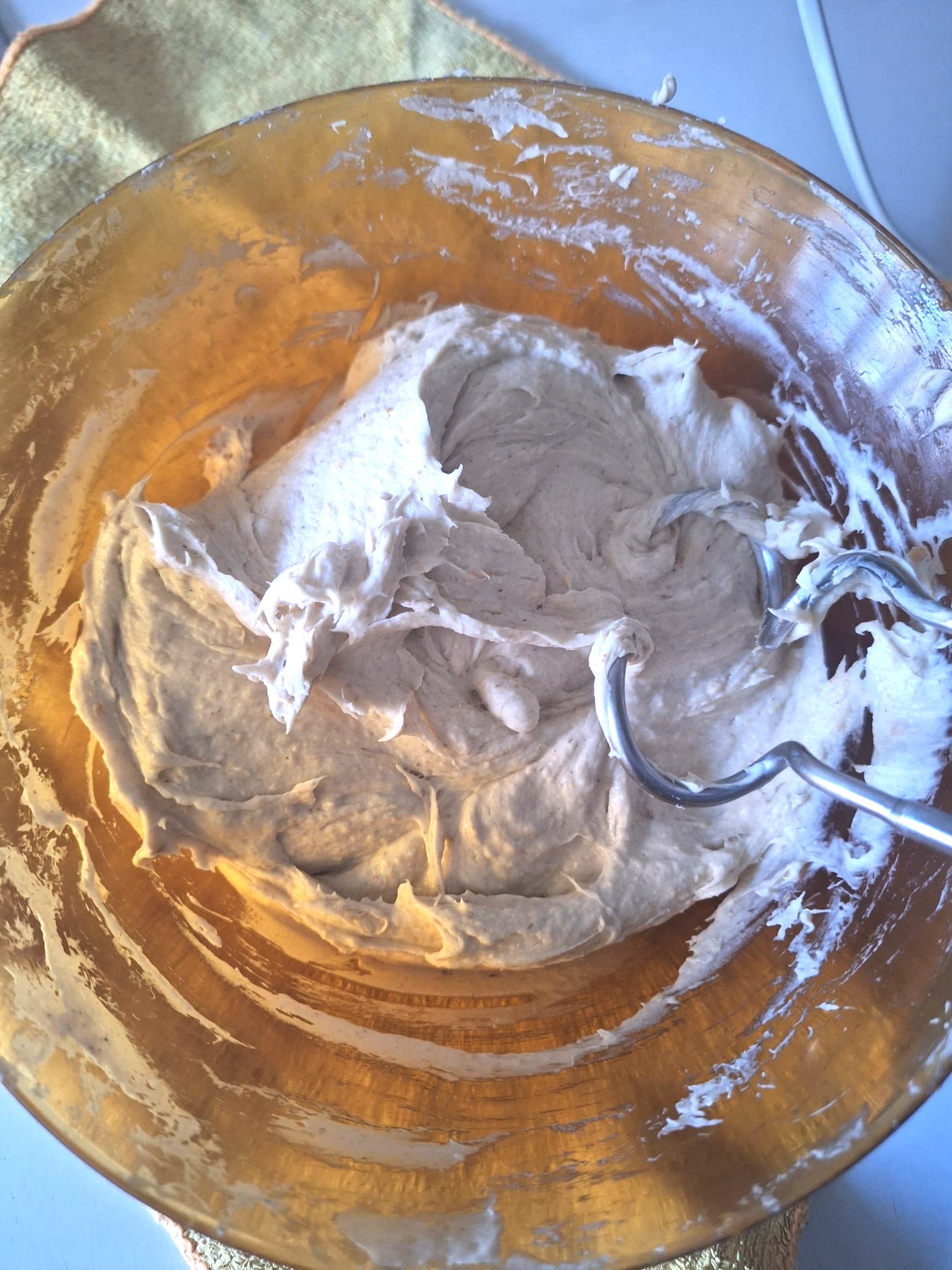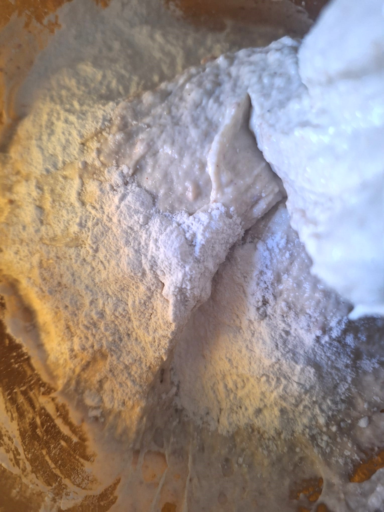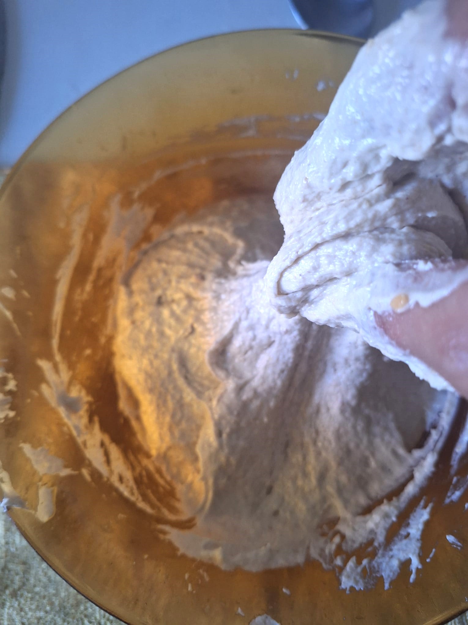 Una vez tengas todo integrado, amasa. La textura es bastante pegajosa así que, si tienes un robot de cocina, te recomiendo que lo utilices con el gancho. Si tienes arte y ganas, puedes amasar sobre la mesa con ayuda de una rasqueta.
