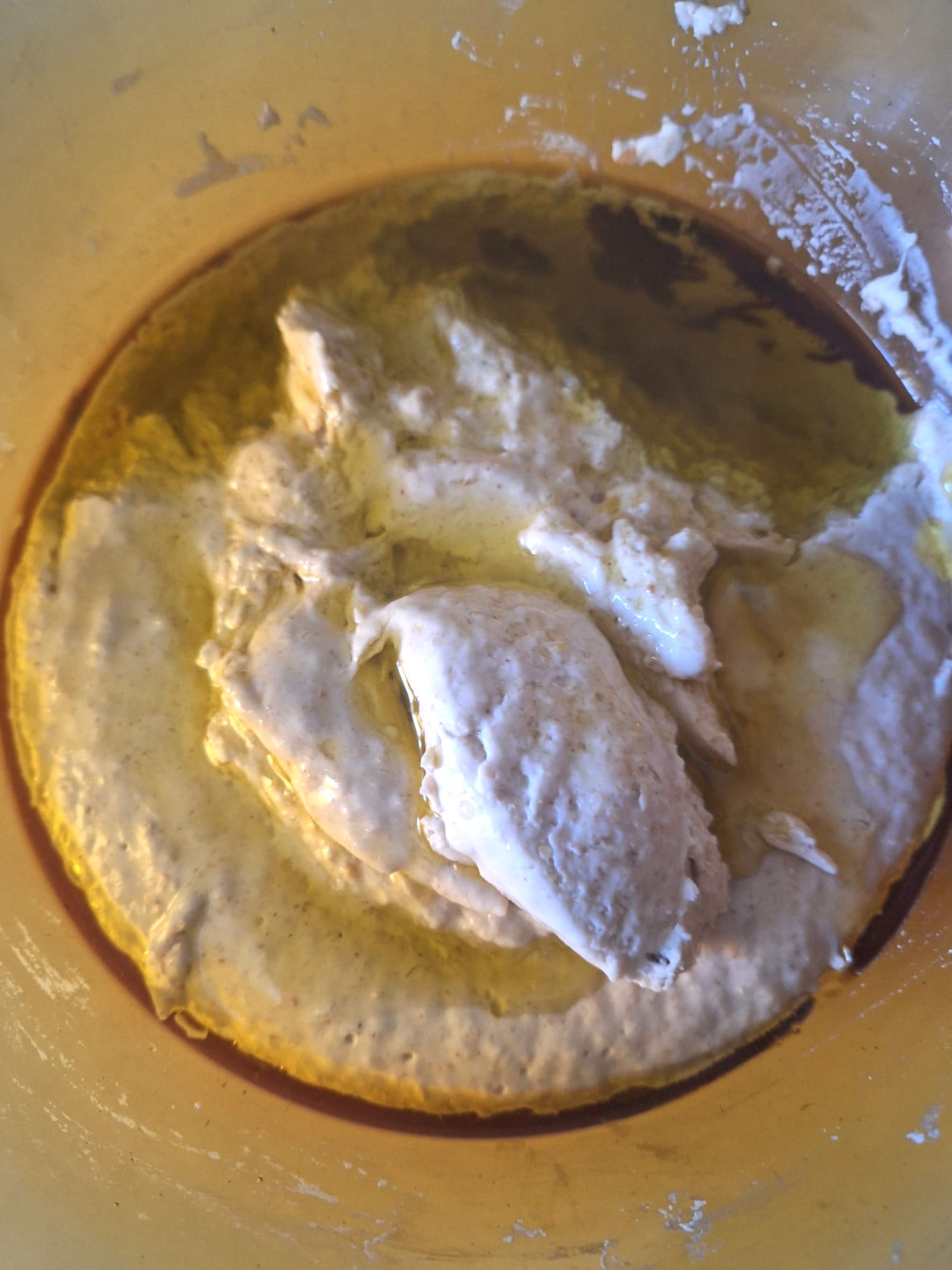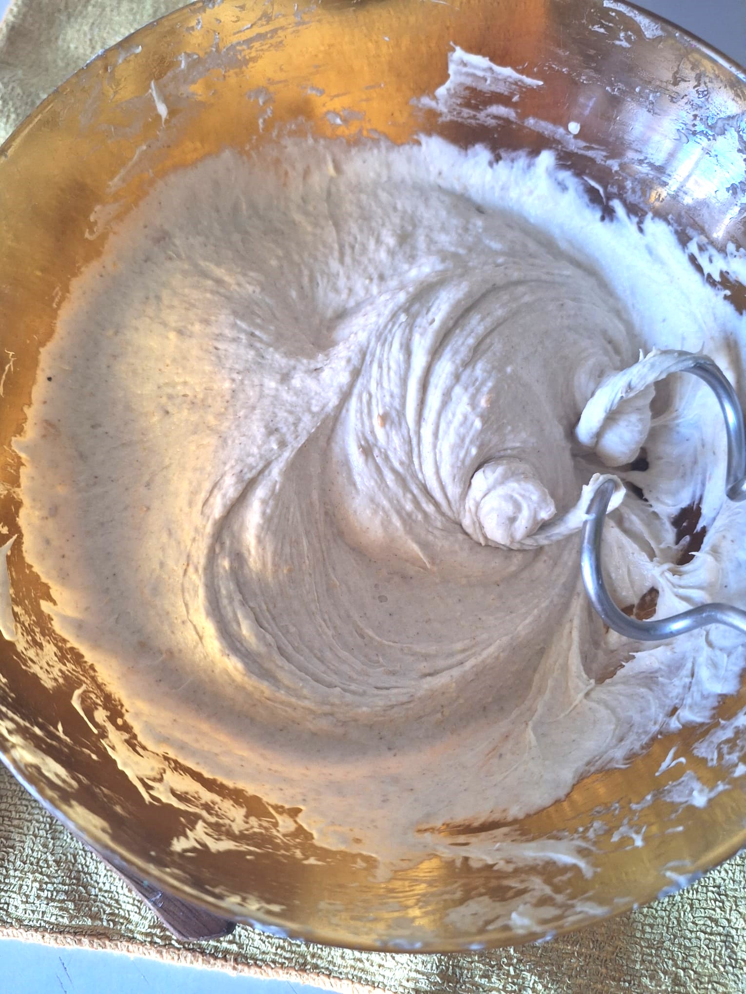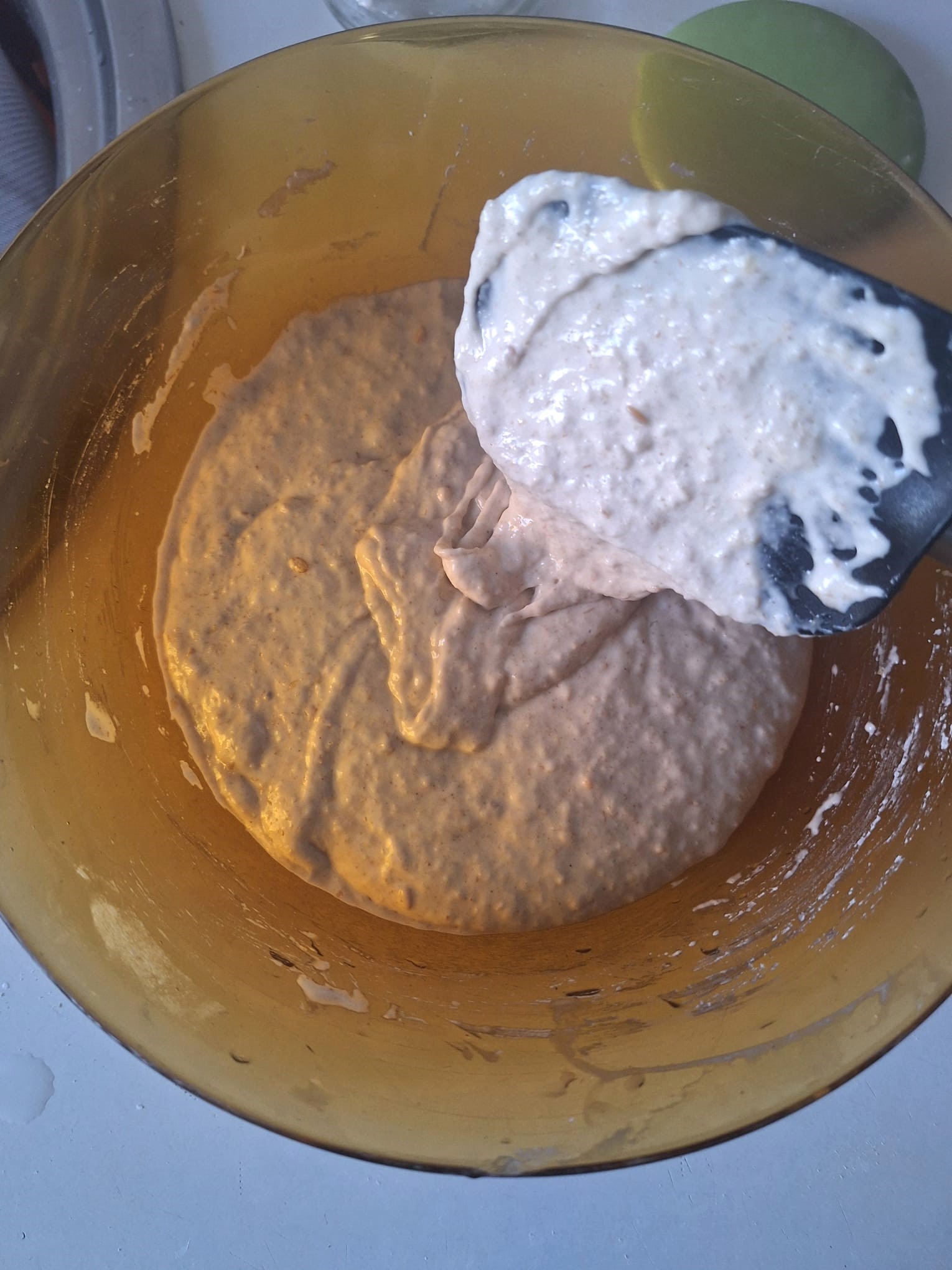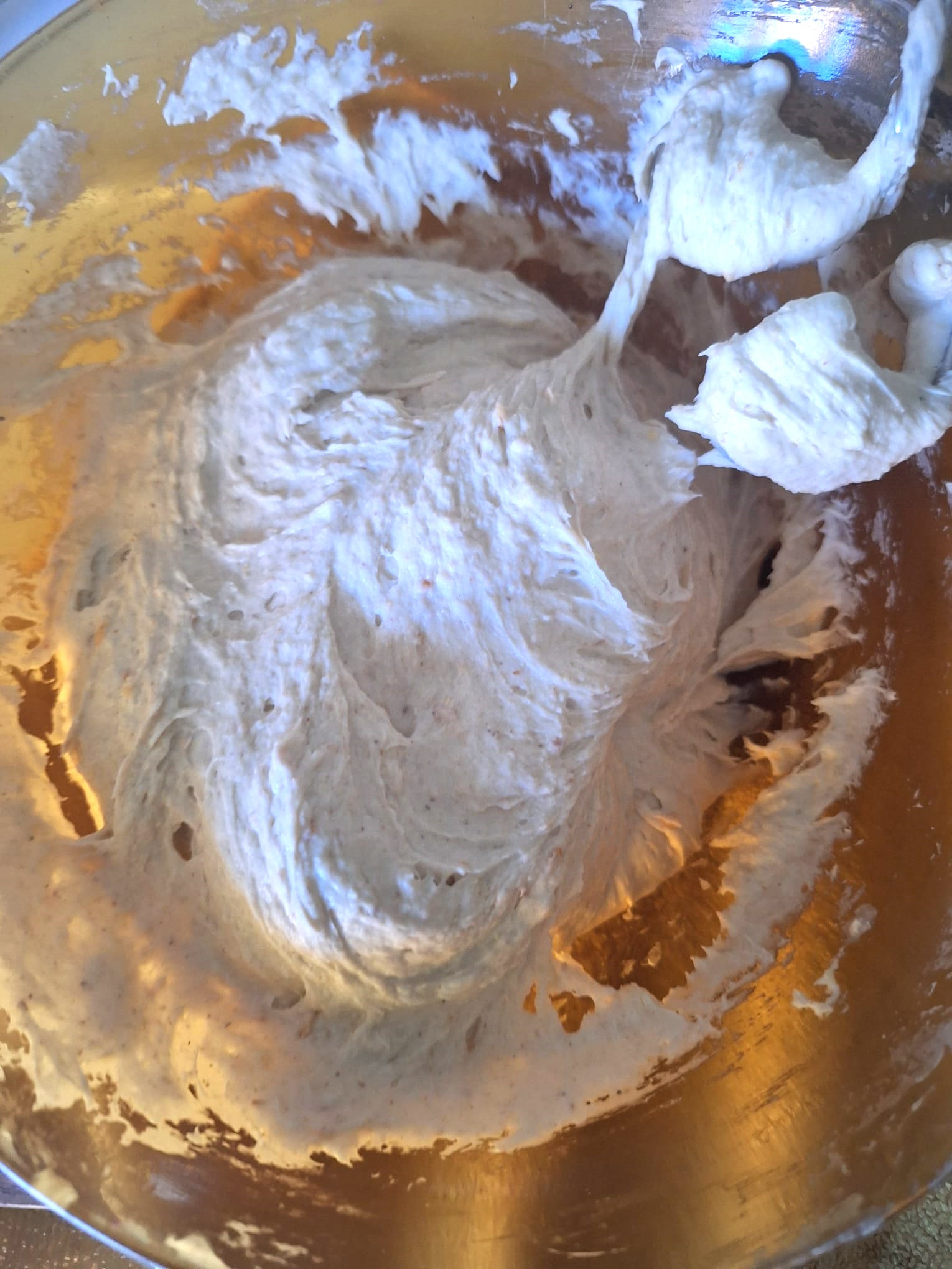 Una vez tengas todo integrado, amasa. La textura es bastante pegajosa así que, si tienes un robot de cocina, te recomiendo que lo utilices con el gancho. Si tienes arte y ganas, puedes amasar sobre la mesa con ayuda de una rasqueta.