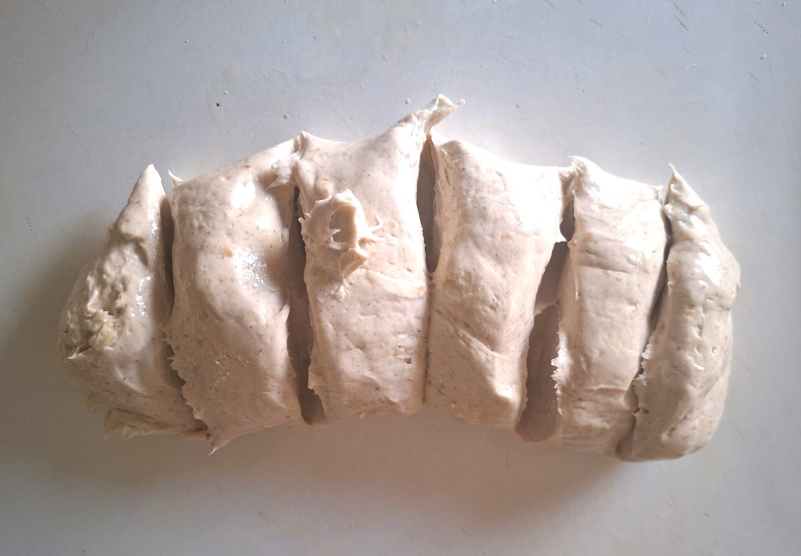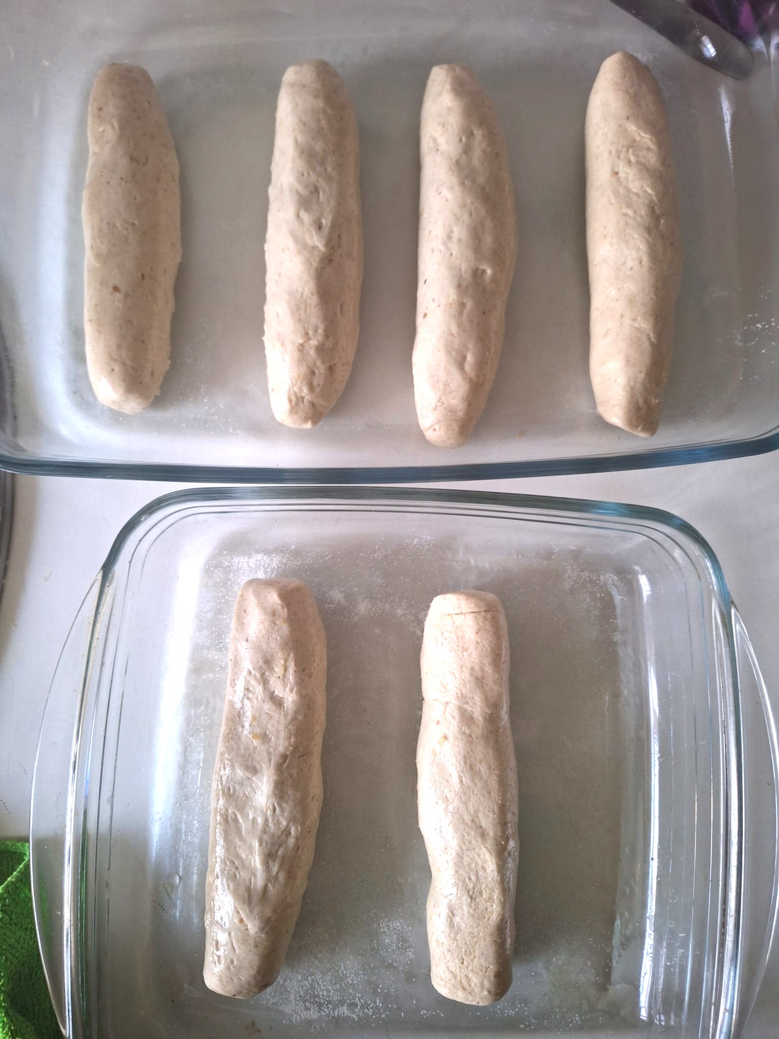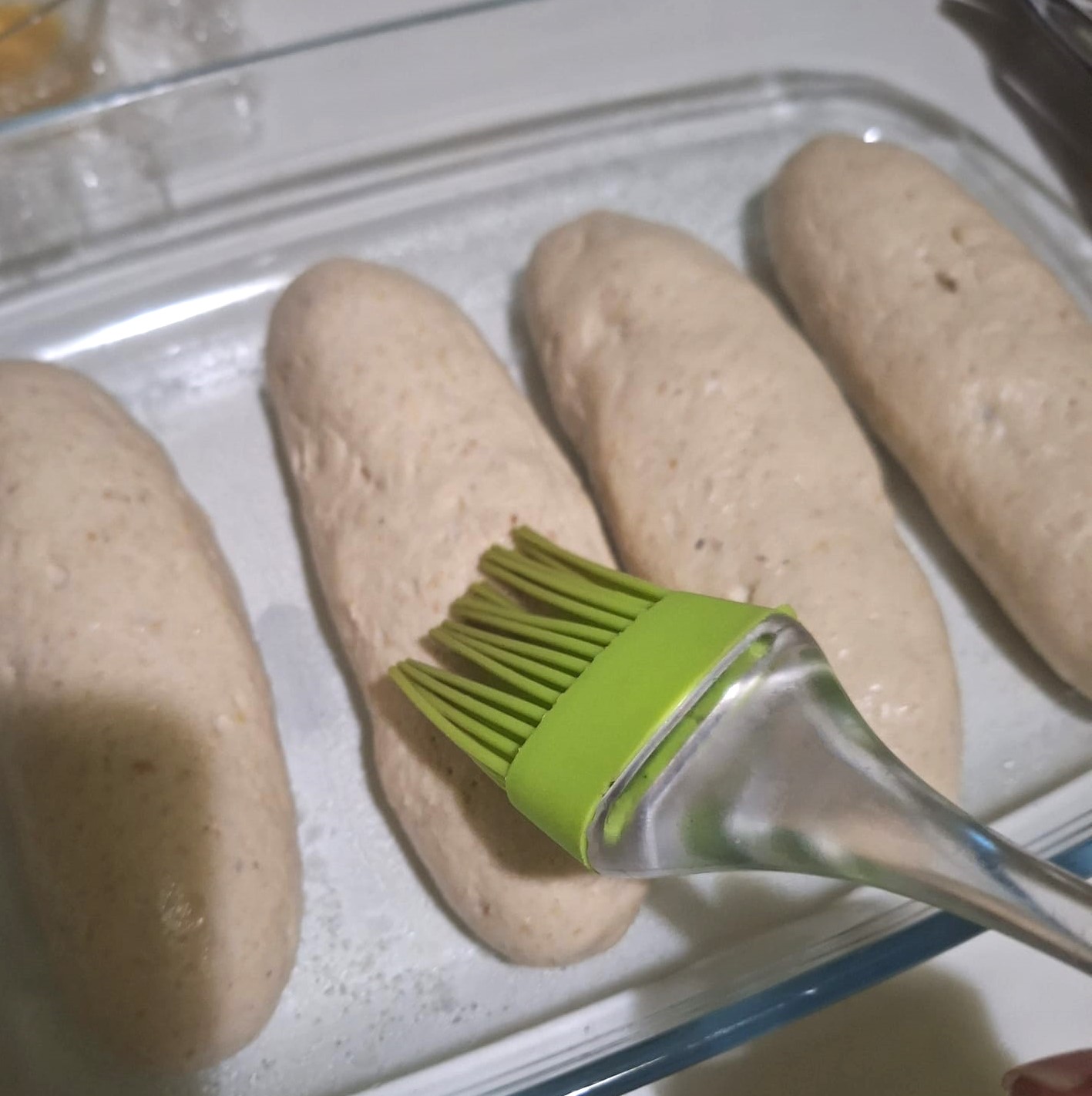 Con ayuda de una rasqueta aceitada (yo utilicé una lengua de cocina) recoge la masa de los bordes del recipiente y haz una bolita. Vierte sobre una superficie engrasada con aceite y engrasa también tus manos. Haz un cilindro alargado y divide en porciones. La masa es muy pegajosa, así que intenta tener siempre las manos engrasadas y ve dando forma de hotdog, manejando la masa con cuidado porque es muy blandita. Coloca papel vegetal sobre la bandeja de horno y deja allí los hotdogs. Cubre con film y deja levar hasta doblar su volumen (1-2 horas).