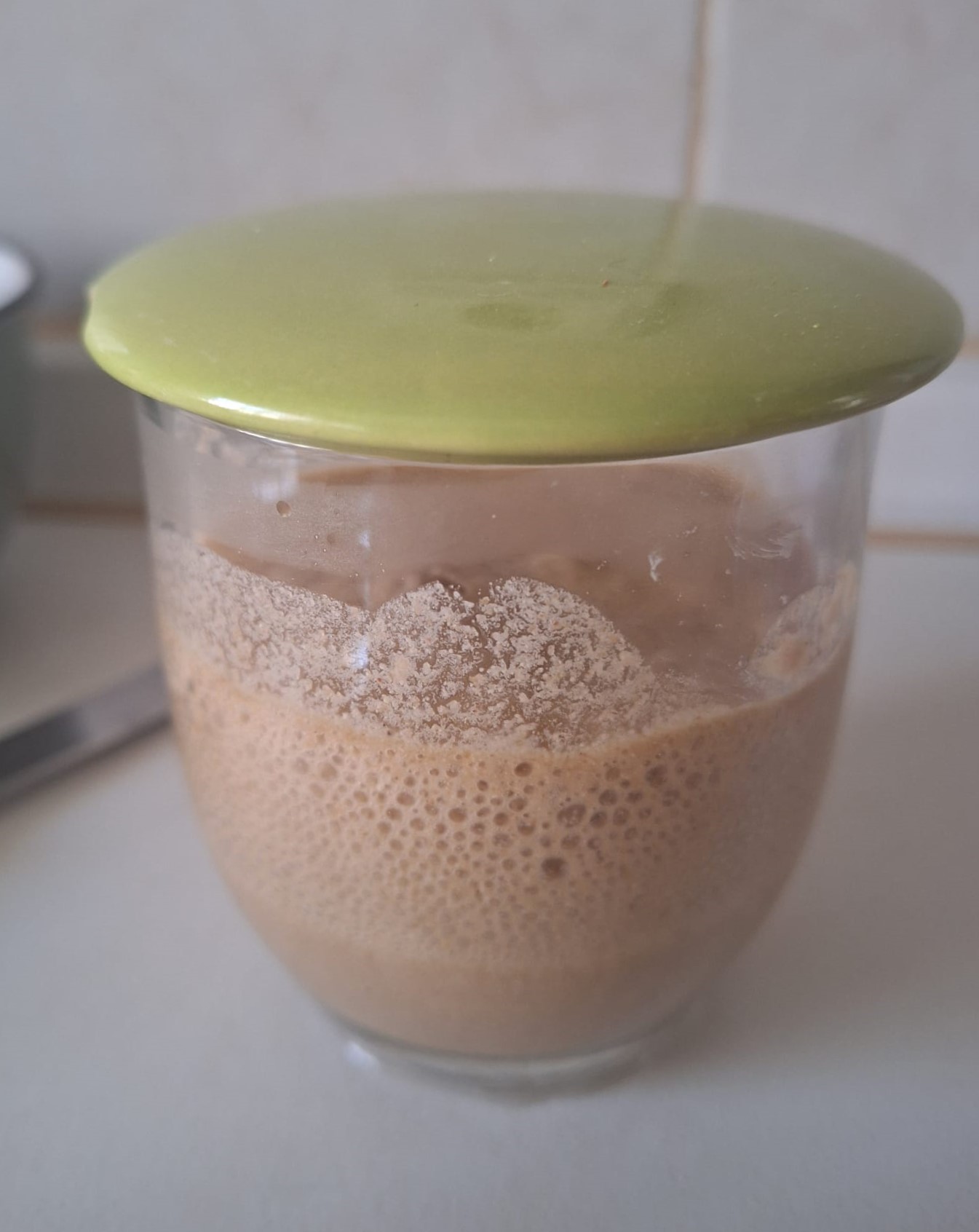 Agrega el prefermento, el resto del agua y el huevo de lino. Integra todos los ingredientes intentando que no quede ninguna parte seca (¡ojo al fondo del recipiente!). Deja reposar 10 minutos para que las harinas se hidraten y el psyllium haga su efecto (queda textura de mousse)