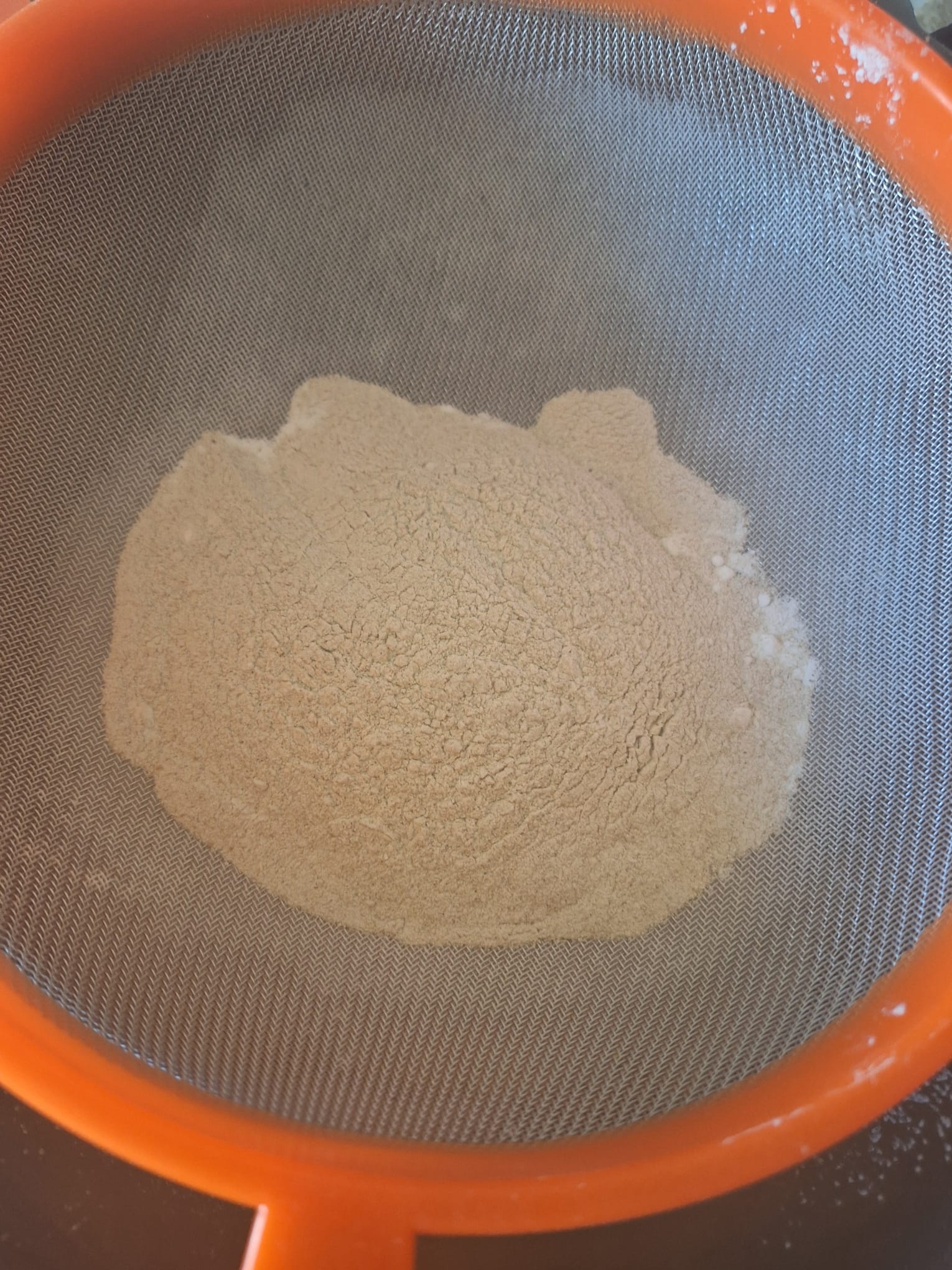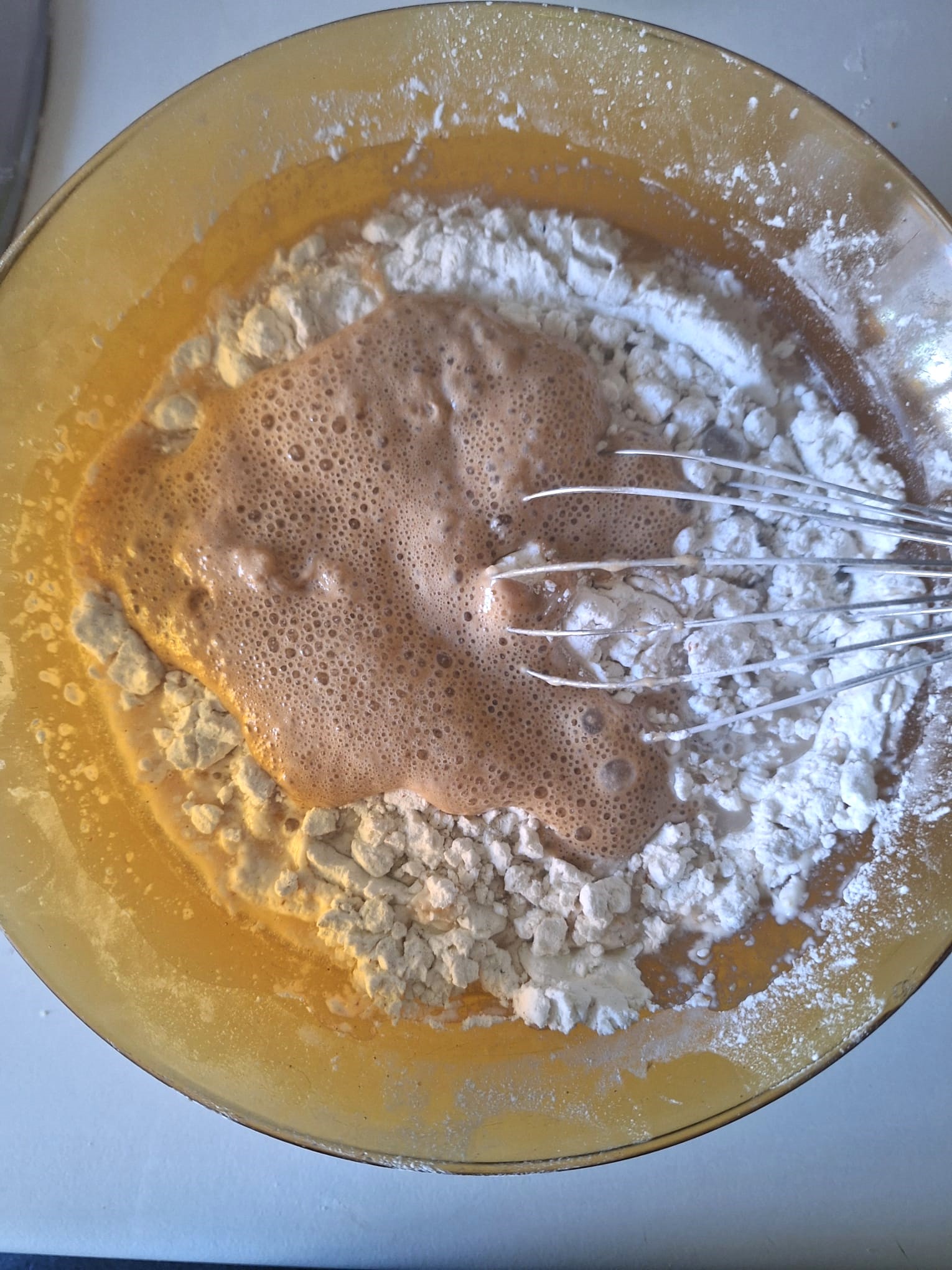 Prepara un prefermento, mezclando 50 ml del agua (tibia) de la receta, la panela y dos cucharadas de la harina de sarraceno. Mezcla bien y deja reposar hasta que doble su volumen.