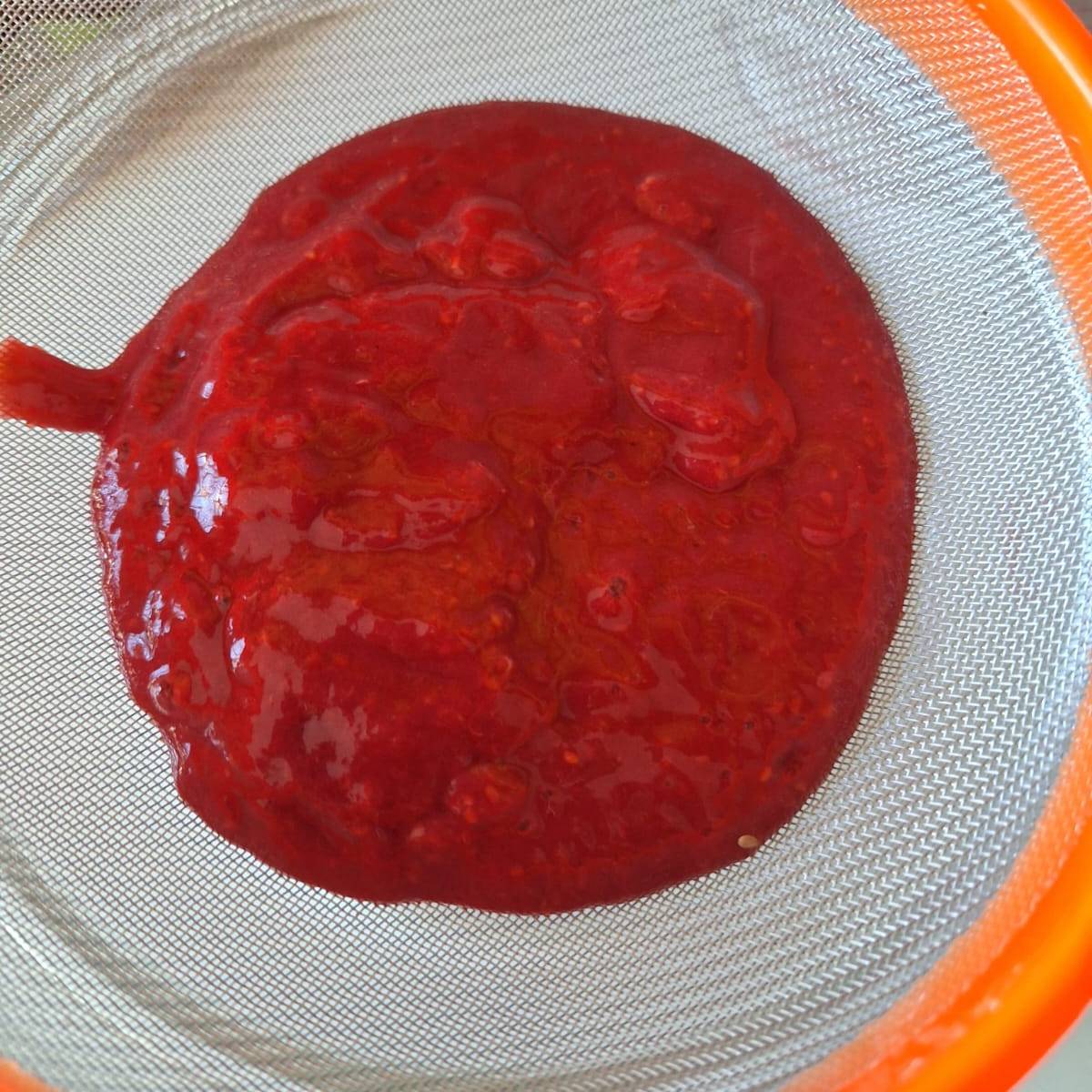 Lava las frambuesas y tritura hasta obtener un puré. Retira las semillas con un chino o con un colador (y mucha paciencia).