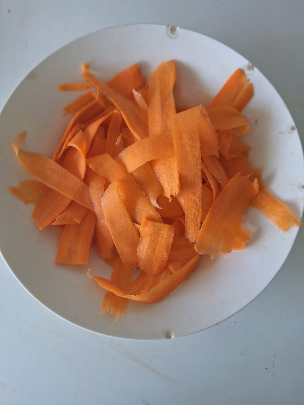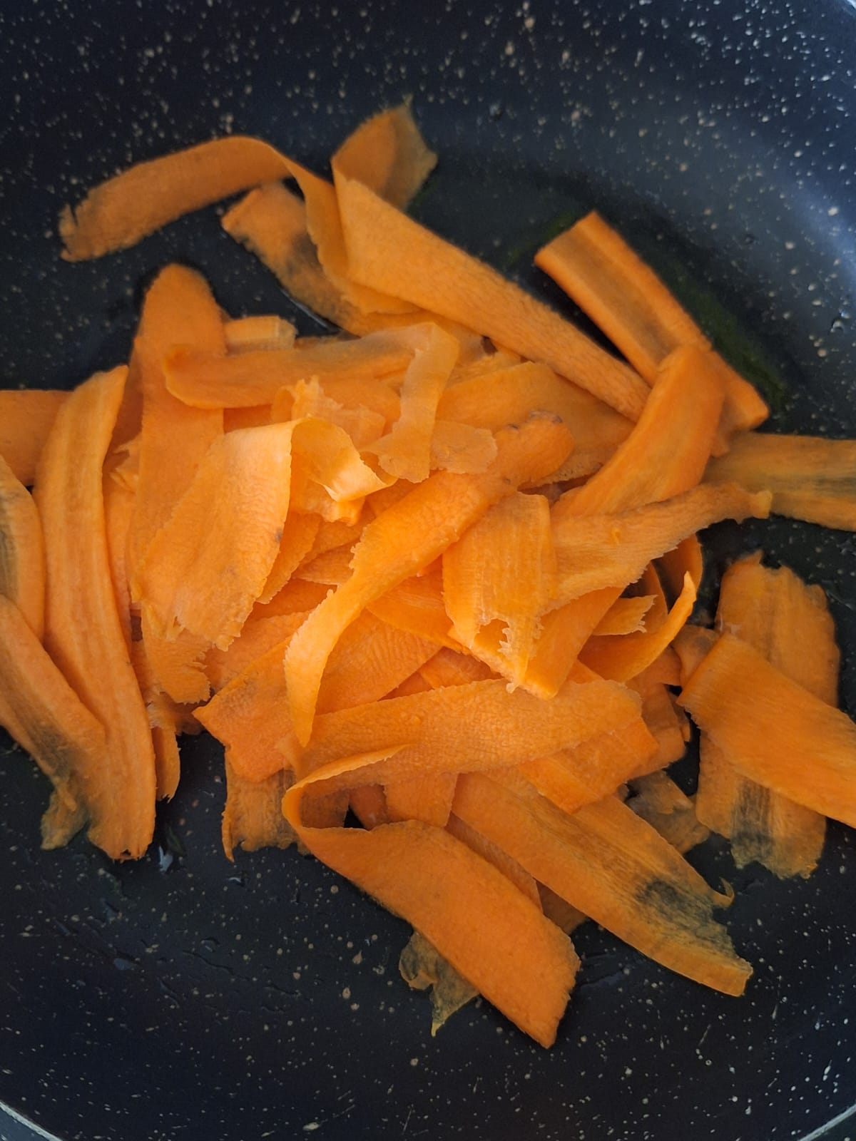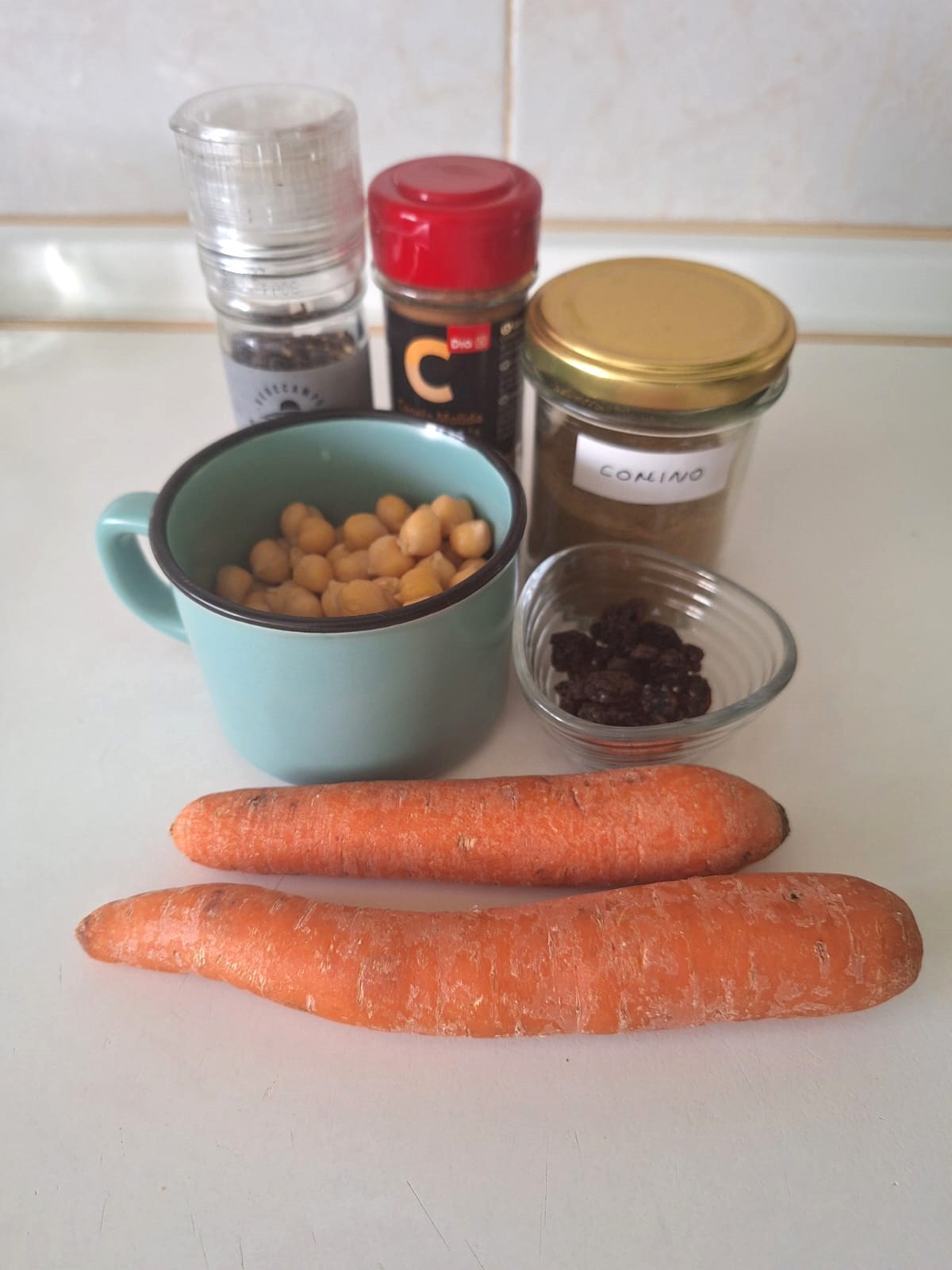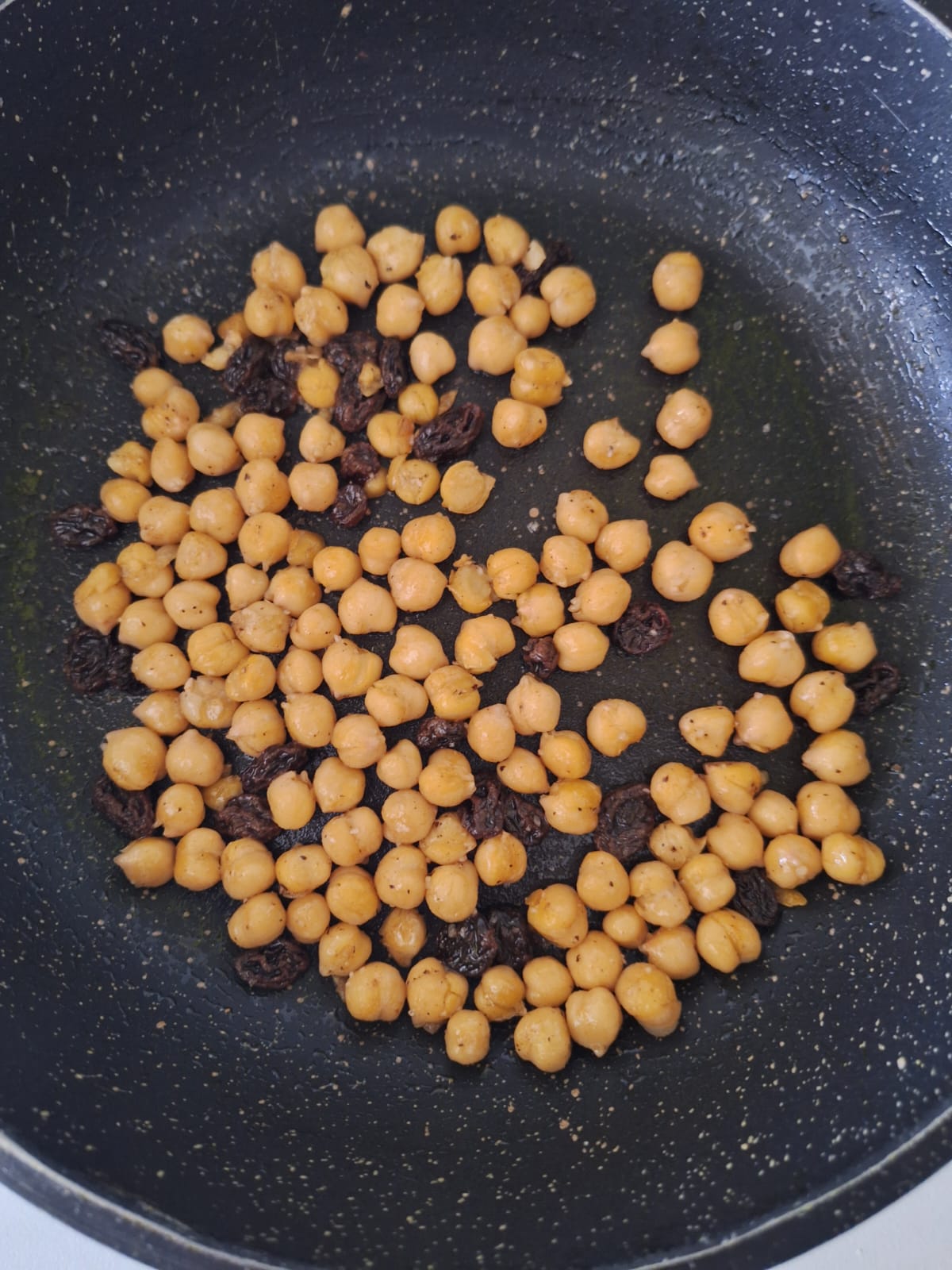 Pela la zanahoria y corta en tiras con un rallador. Saltea en un poco de aceite, lo justo para que pierda la rigidez. En la misma sartén calienta los garbanzos, agrega las especias y las pasas y mezcla bien.