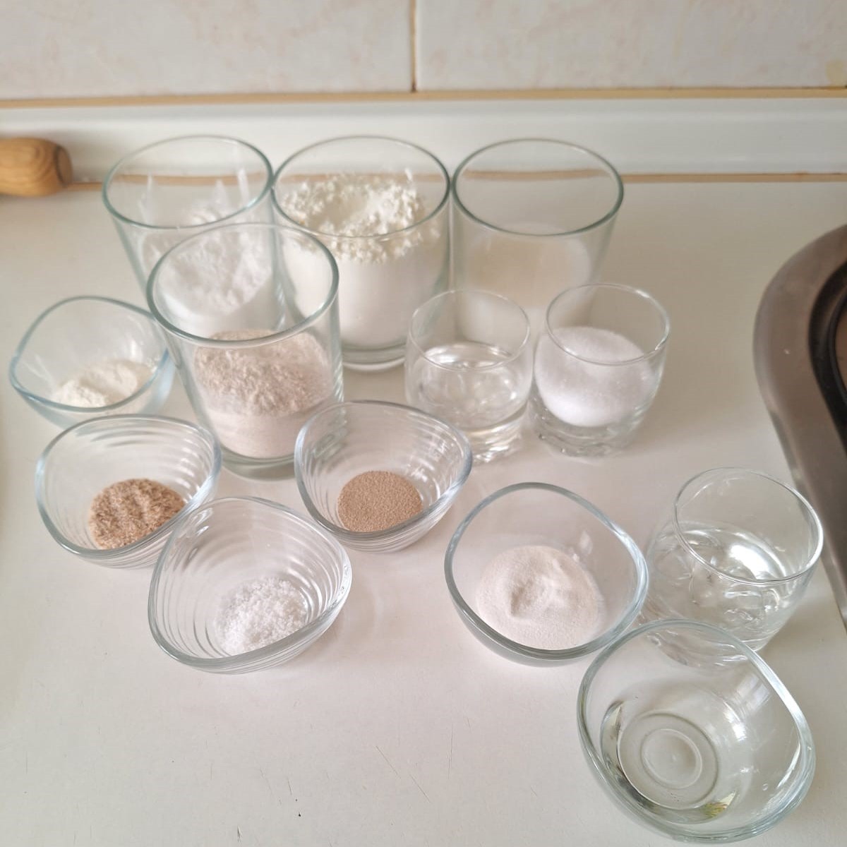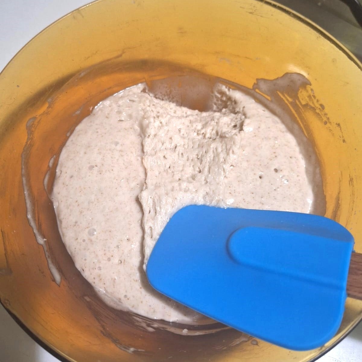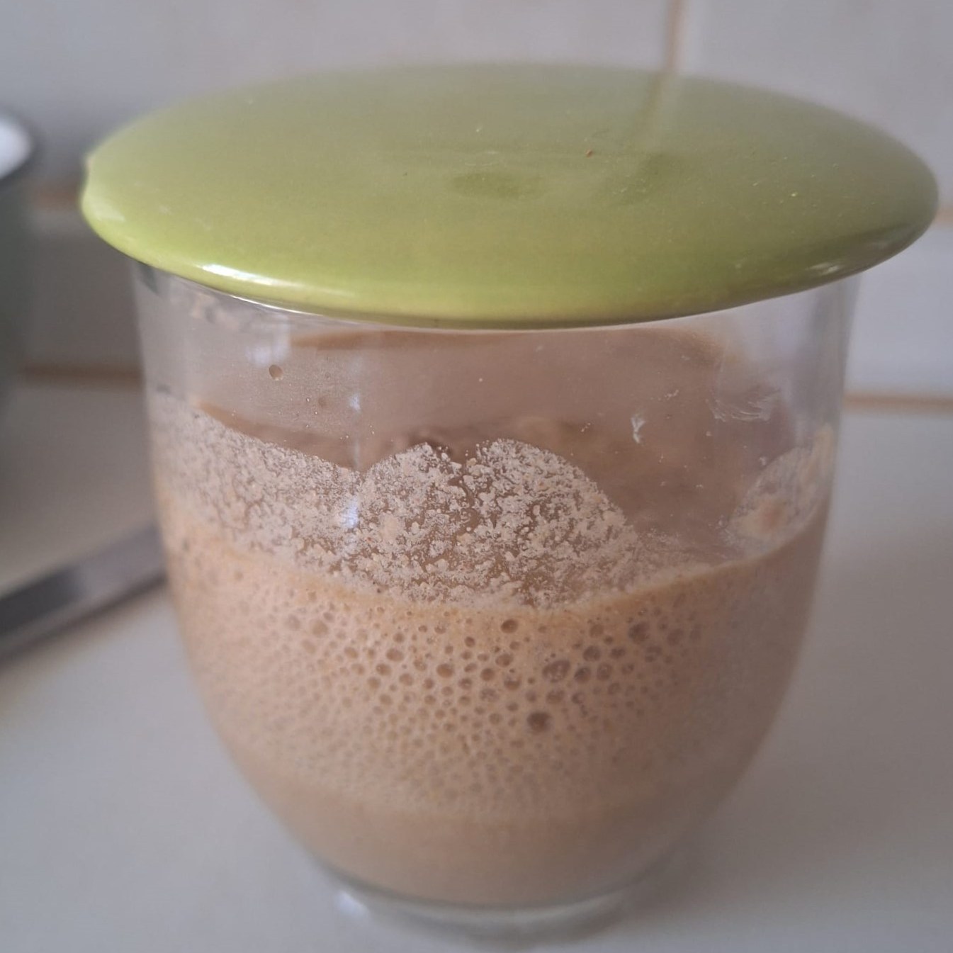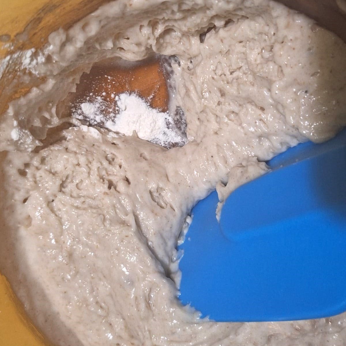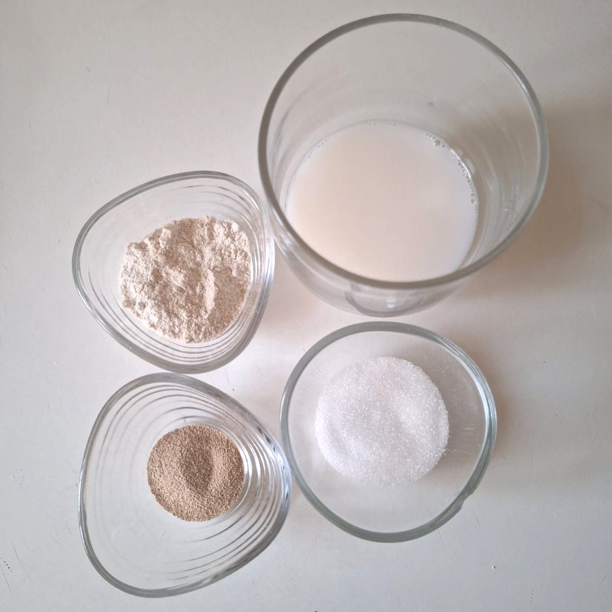 Prepara el prefermento con la leche tibia, el azúcar, la levadura y la harina de trigo sarraceno. Mezcla bien, tapa y deja reposar hasta doblar volumen.