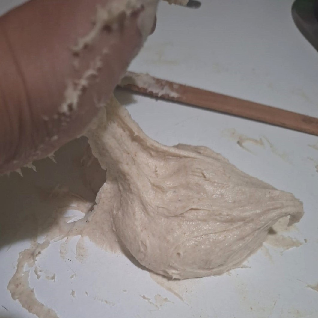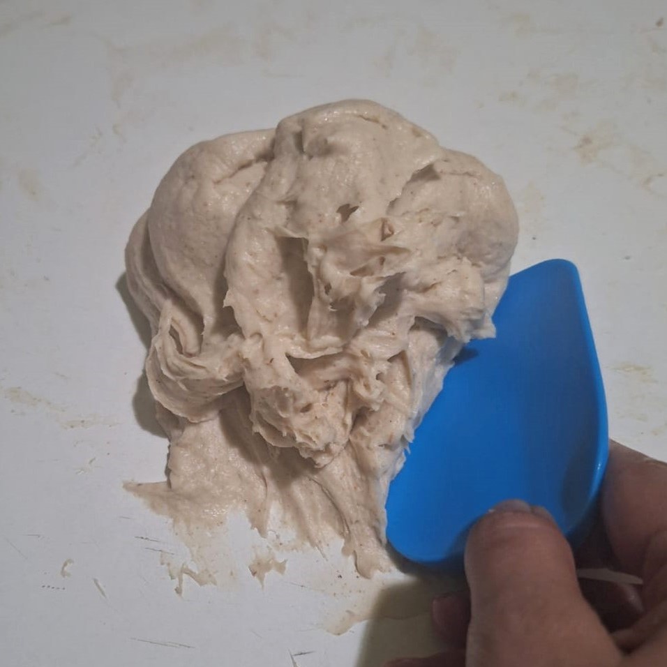 Tras este tiempo la masa tendrá una textura similar a la mousse. Agrega la goma xantana y mezcla con cuidado para que no se disperse. Recoge toda la masa haciendo una bola y vierte sobre la superficie de trabajo. Con ayuda de una rasqueta amasa durante 15 minutos. Se volverá muy pegajosa. Recoge la masa con la espátula aceitada y forma una bola.