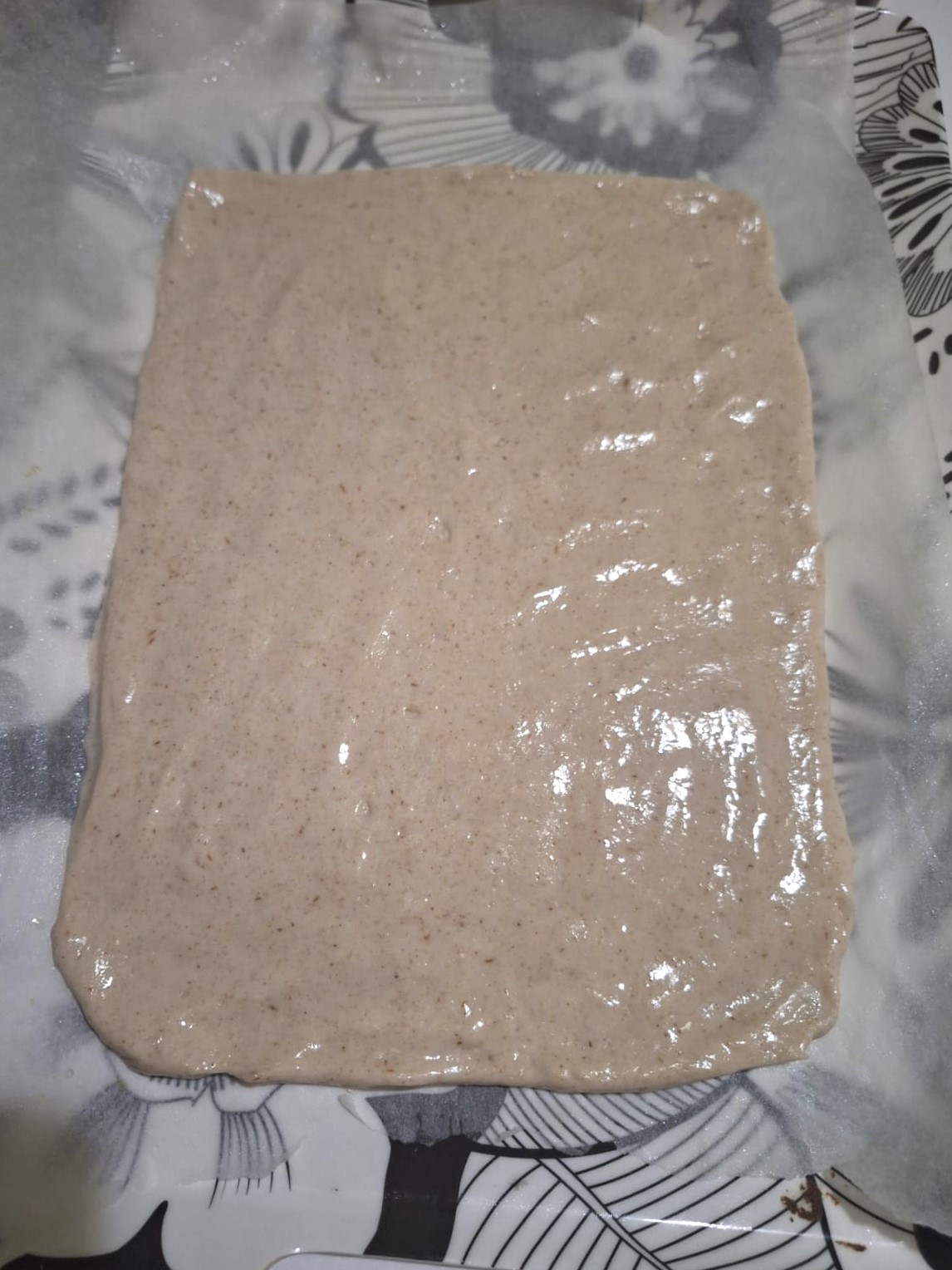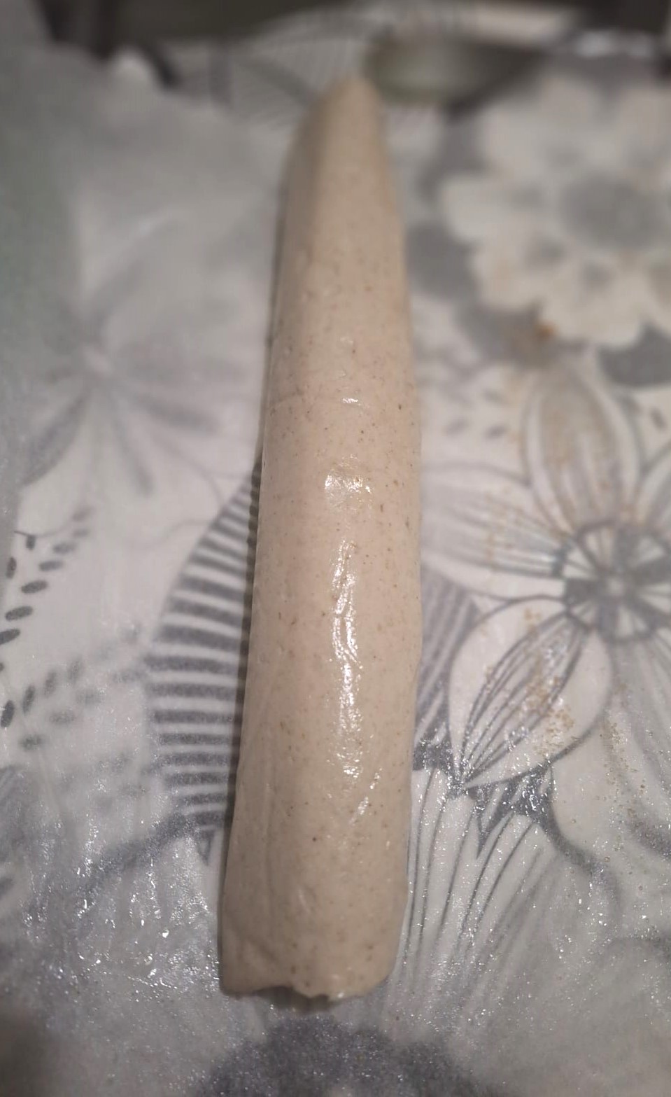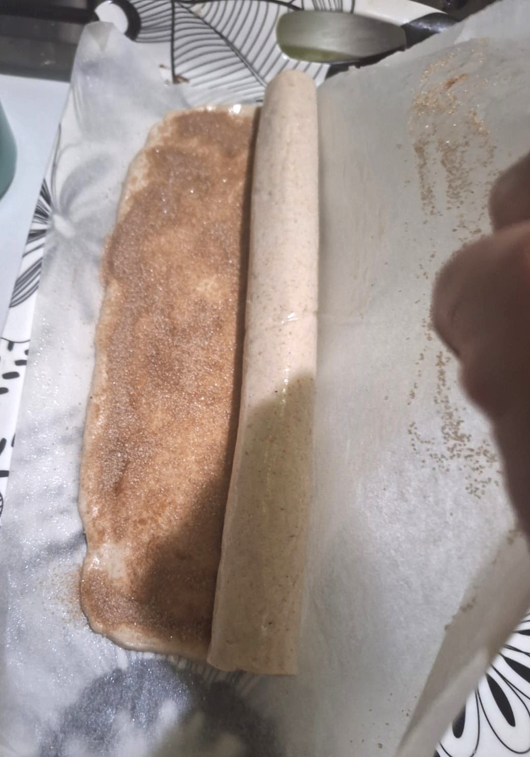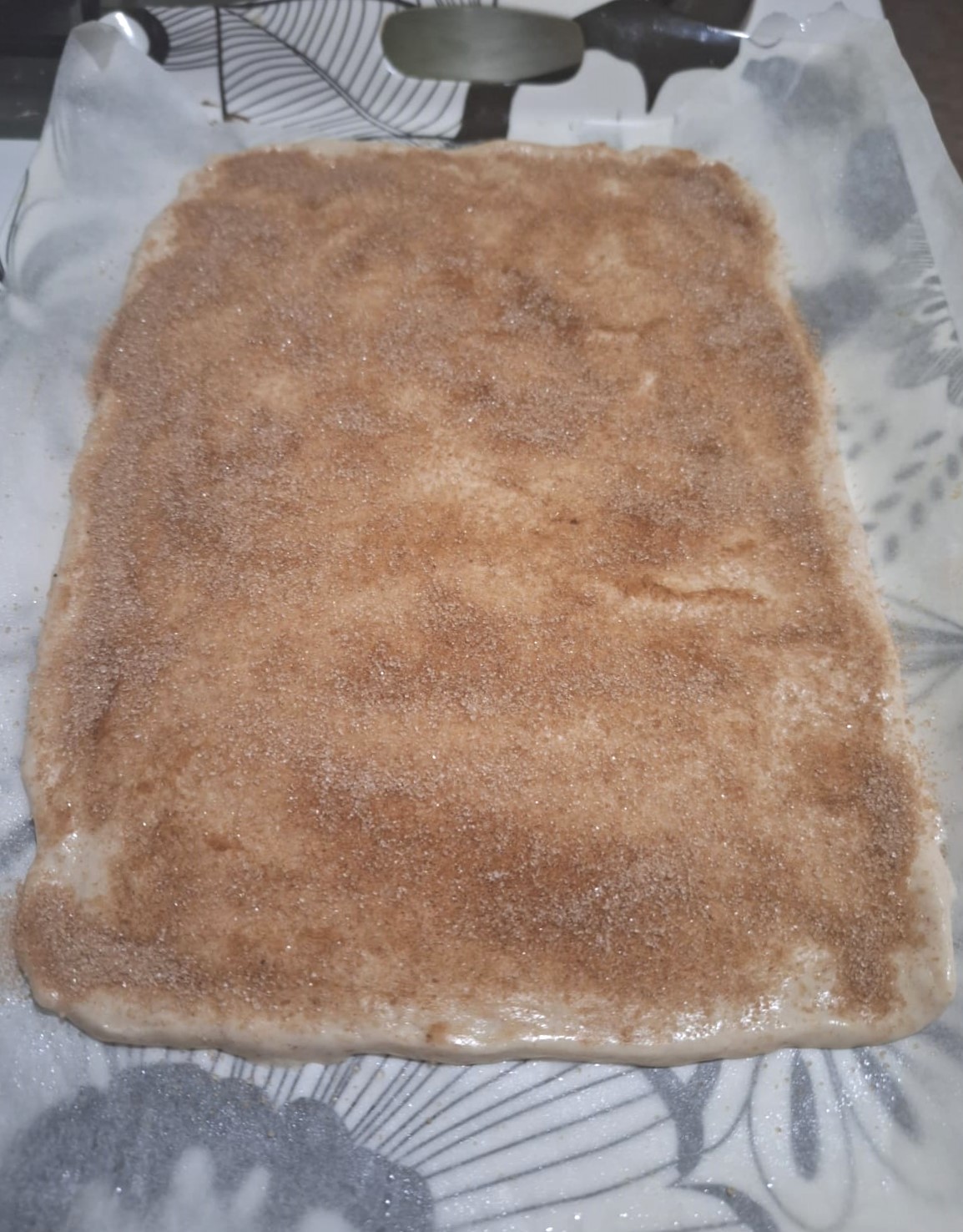 Coloca sobre un papel vegetal engrasado y extiende la masa con los dedos haciendo un rectángulo. Mezcla el eritritol con la canela y esparce sobre la superficie. No añado mantequilla porque la masa estará engrasada de extenderla. Con ayuda del propio papel ve enrollando, cierra el extremo y da la vuelta.