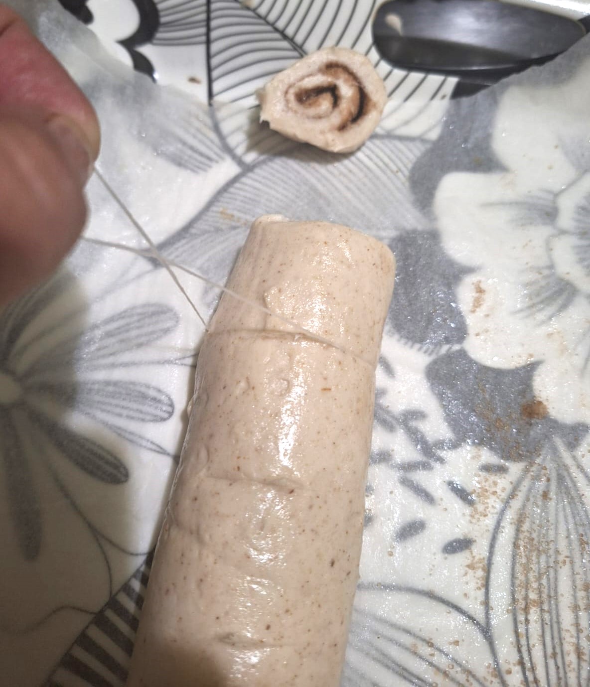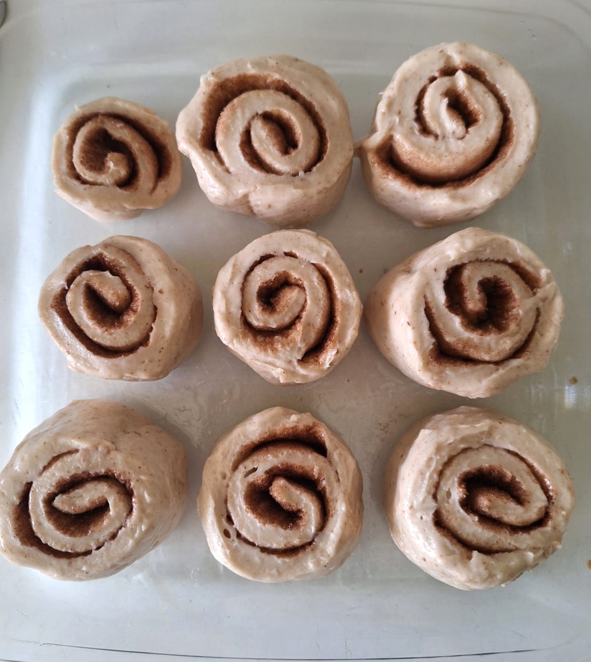 Corta en porciones de dos dedos de grosor con hilo dental (es la mejor forma de hacerlo). Engrasa una bandeja o molde de horno y ve colocando los rollitos dejando un espacio de separación. Cubre y deja fermentar hasta duplicar tamaño.