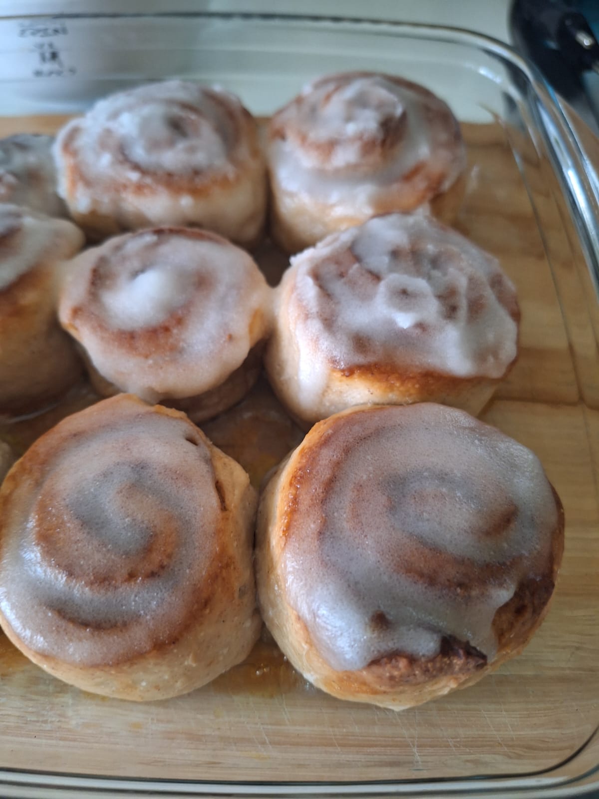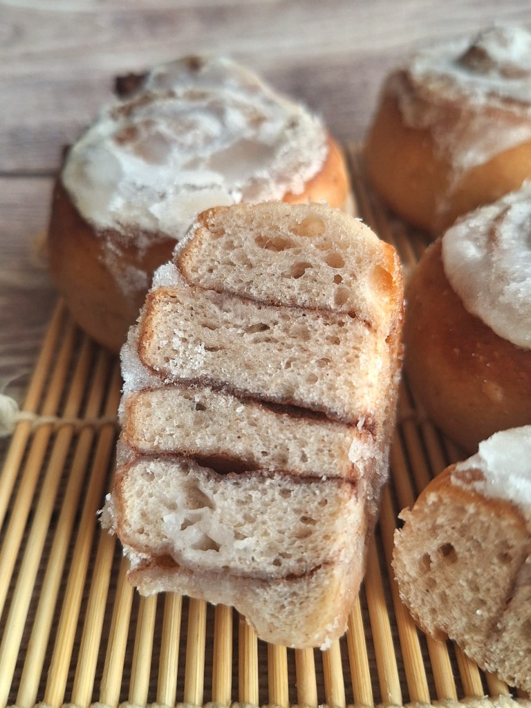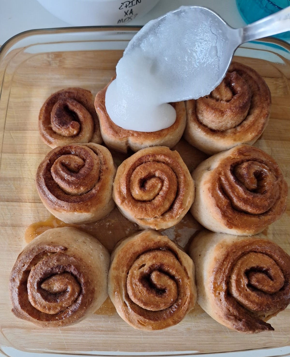 Prepara el glaseado mezclando el eritritol (molido con molinillo de café), la leche (añade poco a poco) y el aceite (!se me olvidó echarlo!!!). Vierte sobre los rollitos aún calientes y deja enfriar por completo.
