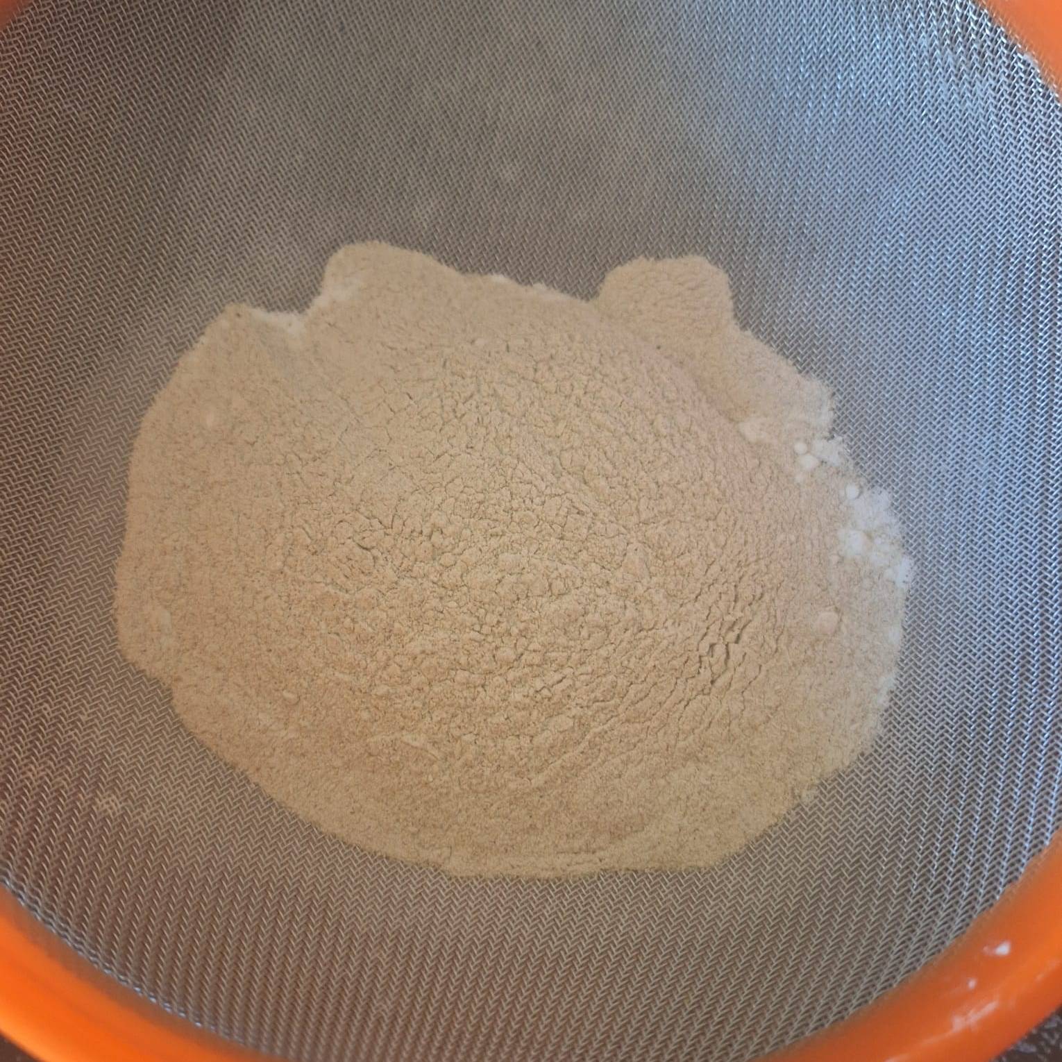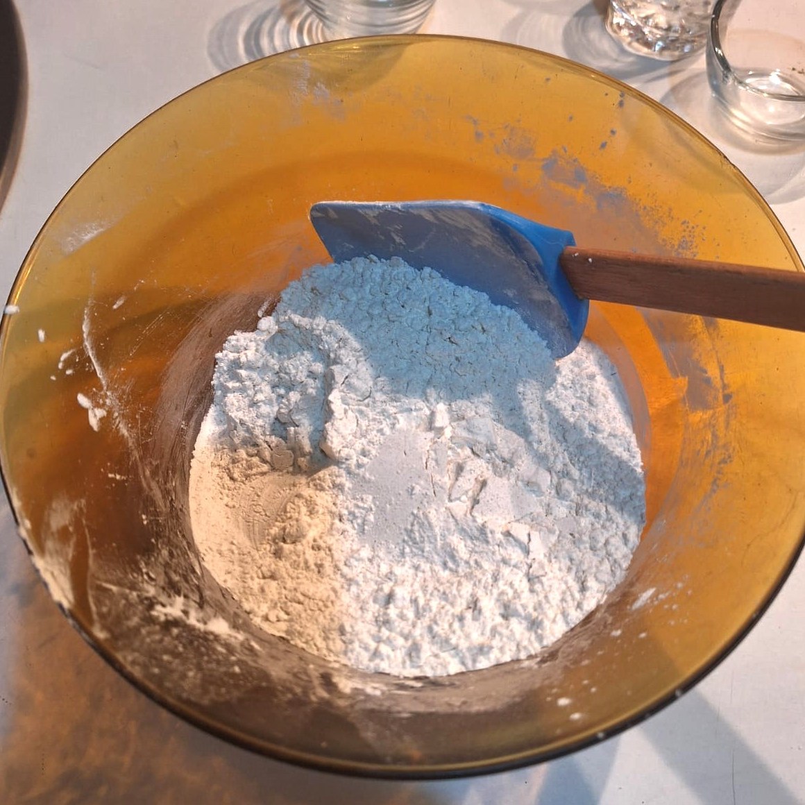 Vierte en un recipiente amplio todos los ingredientes secos tamizados, menos la goma xantana. Es decir, la harina de trigo sarraceno, el almidón de maíz y tipioca, la sal, el eritritol y el psyllium. Mezcla muy bien.