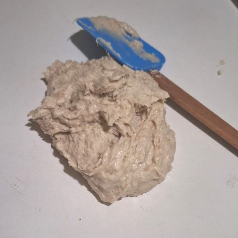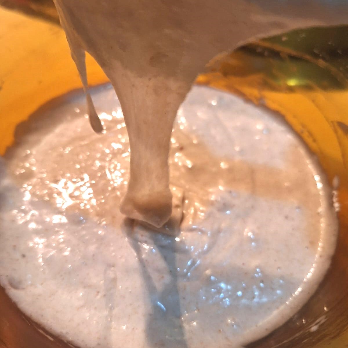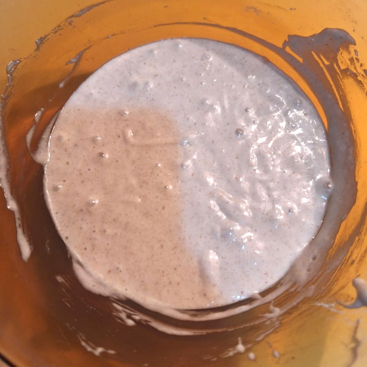 Agrega los líquidos a los secos: prefermento, leche, sustituto del huevo y aceite de coco. Integra intentando que no queden partes secas. Verás que es una masa muy líquida. Cubre y deja reposar 1 hora.