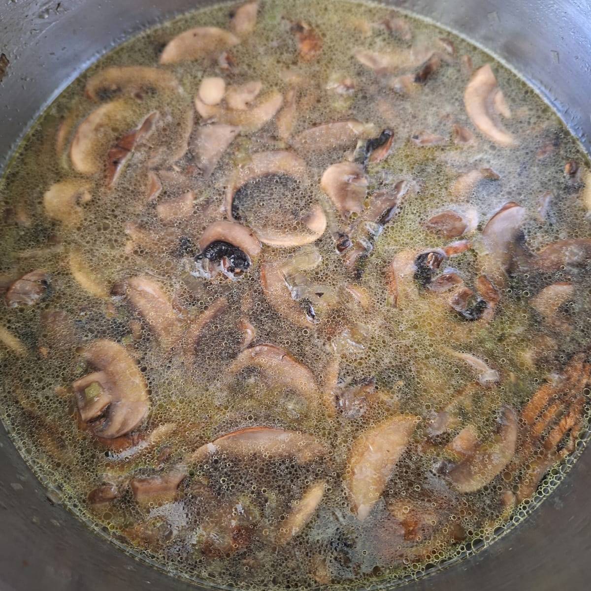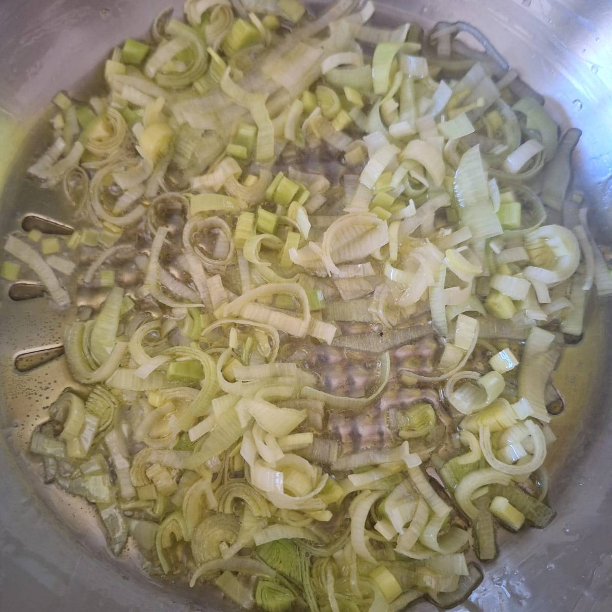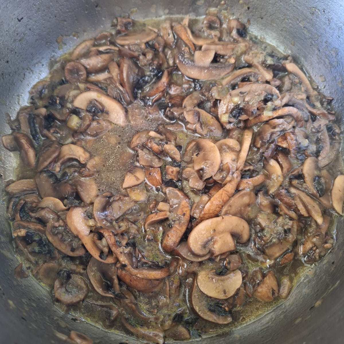 Limpia el puerro y pica finamente. Limpia los champiñones y corta en láminas. En un poco de aceite pocha el puerro. Cuando empiece a transparentar agrega los champiñones y rehoga unos minutos. Sazona y añade el agua.