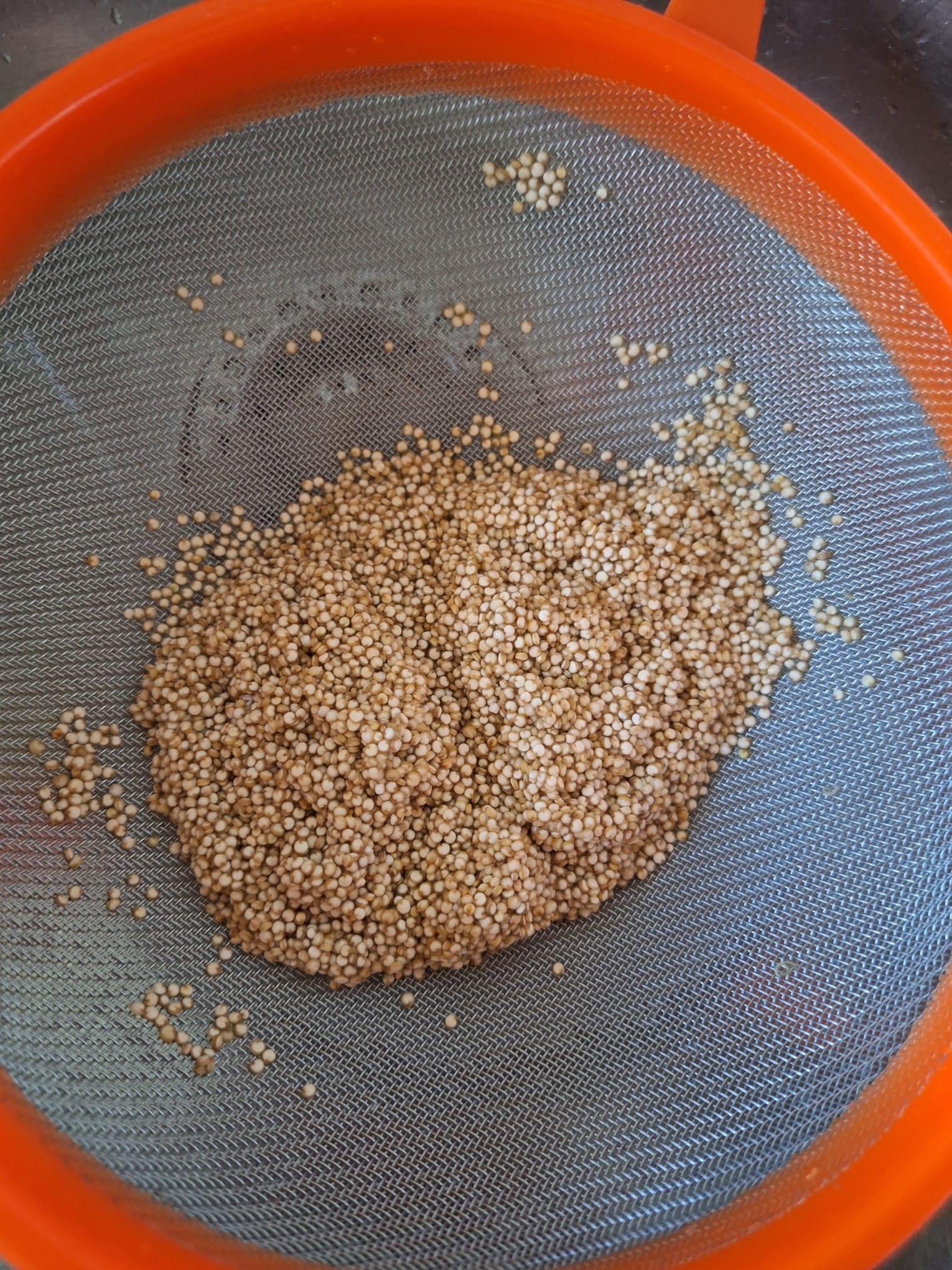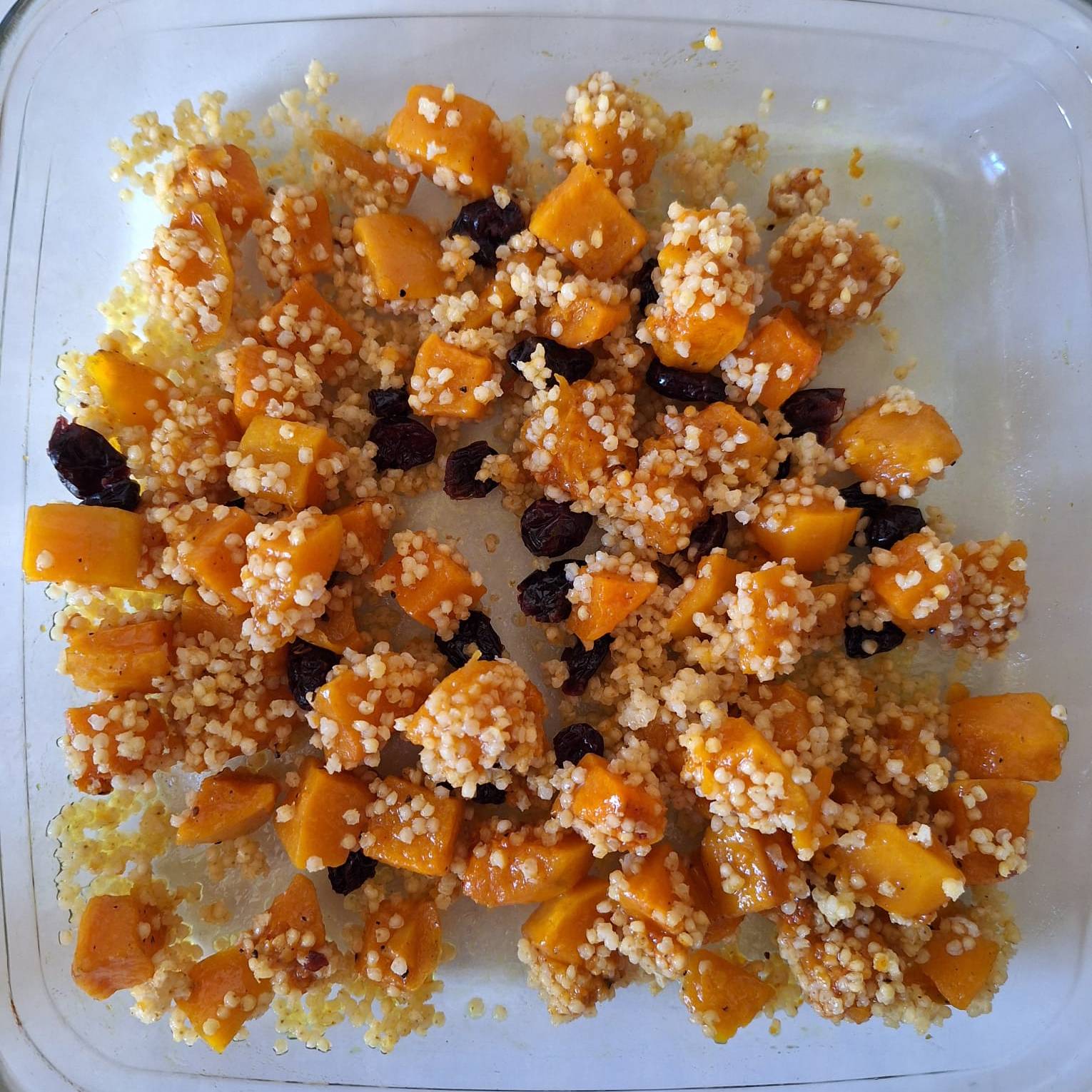 Mezcla la calabaza, el mijo y la kale con la vinagreta. Agrega los arándanos y las semillas de calabaza e integra todo bien.