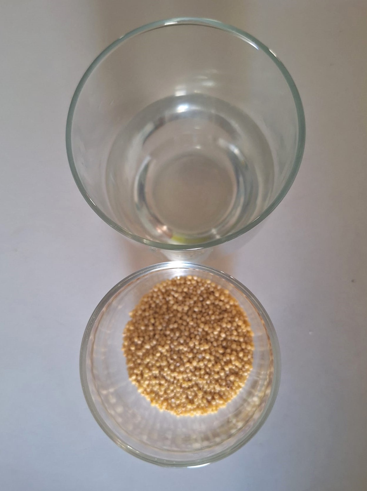 Cocina el mijo: lava hasta que el agua salga limpia. Escurre y vierte en una sartén sin aceite. Calienta a fuego bajo hasta que se seque. Agrega el agua y lleva a ebullición, cubre con una tapadera, baja el fuego al mínimo y cocina 15-20 minutos, hasta que absorba el agua. Destapa, separa los granos con un tenedor y deja templar.