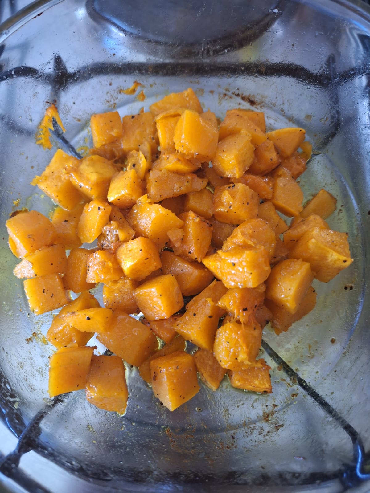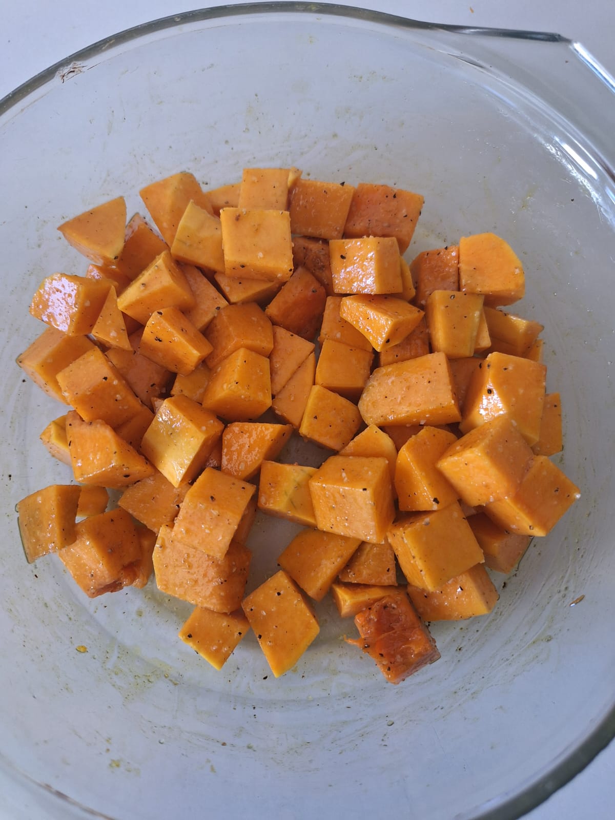 Pela la calabaza, corta en cubos medianos y aliña con las especias y un poco de aceite de oliva. Hornea a 180ºC durante 40 minutos o hasta que esté blandita. Reserva.