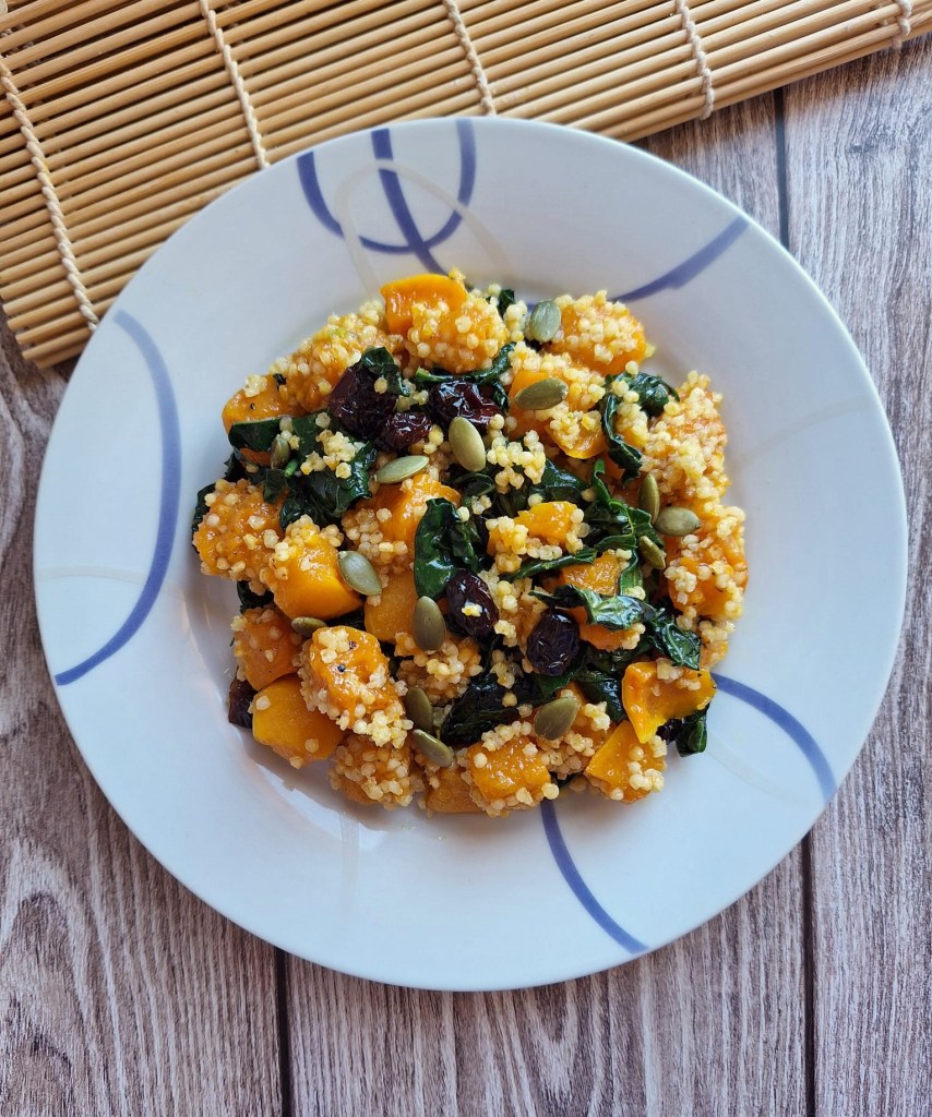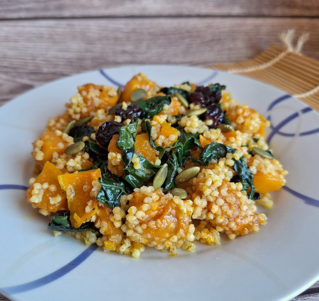 !Buenos días cauliflagüers! Otra semana más que comienza y vamos a seguir con la rutina de incorporar ensaladas a nuestra alimentación. Hoy le toca el turno a una ensalada templada, con calabaza (que está en plena temporada), col kale (que empieza a verse en el mercado) y mijo (un pseudocereal sin gluten muy nutritivo).