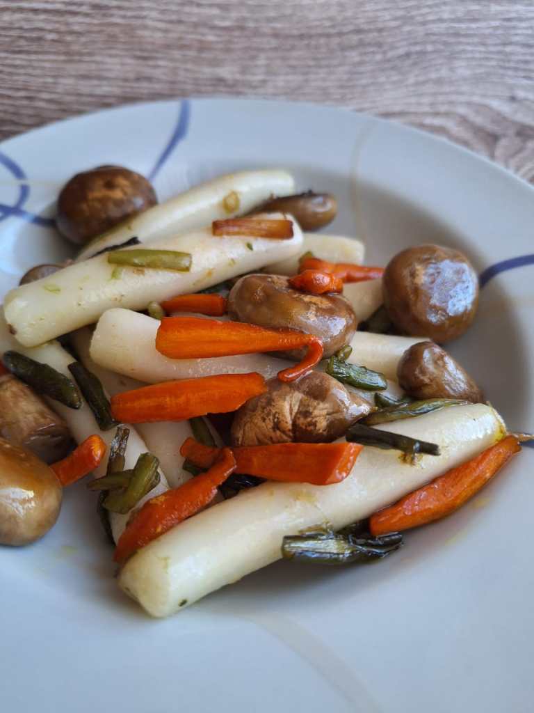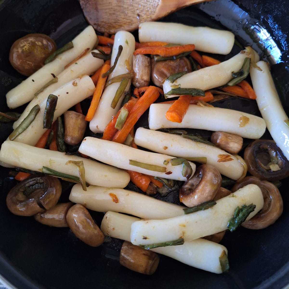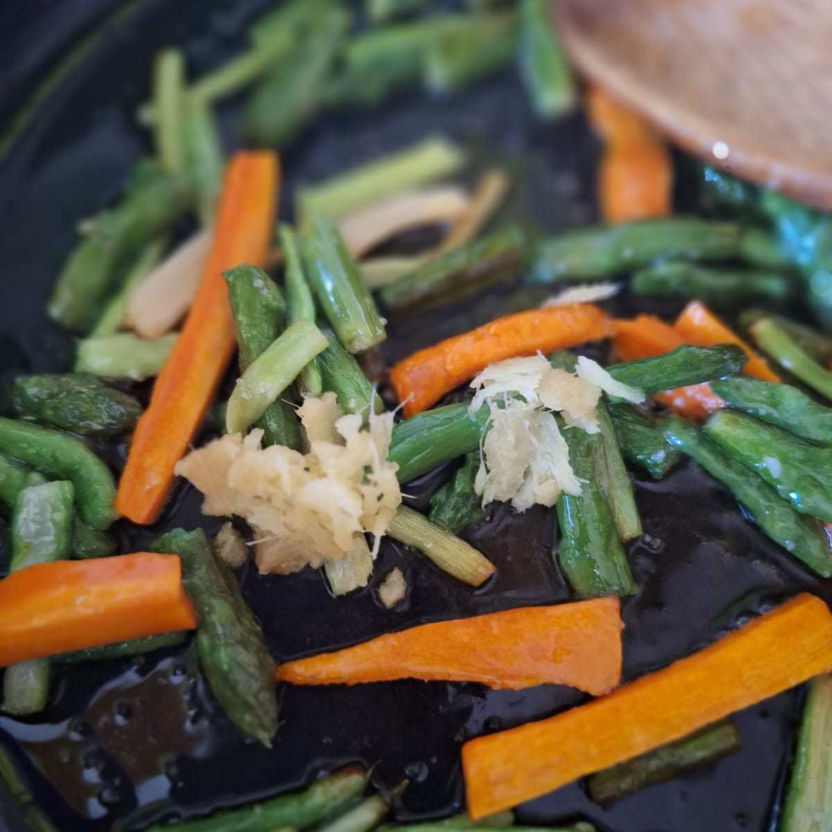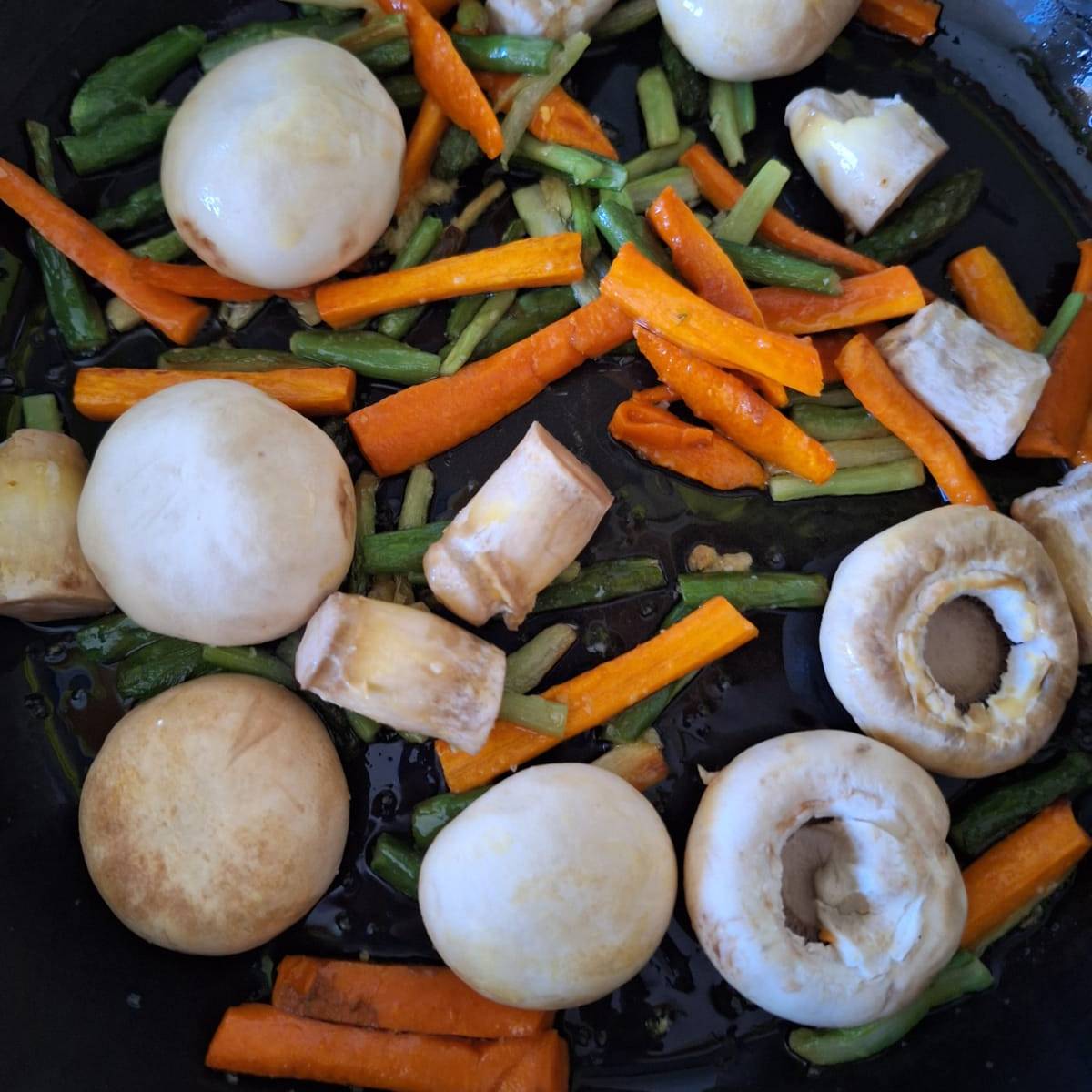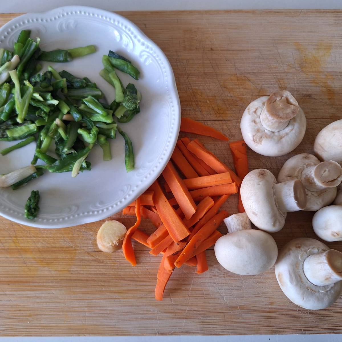Limpia los trigueros y corta en trozos medianos. Pela la zanahoria y corta en bastones. Limpia los champiñones y retira el pedúnculo. Maja el jengibre.