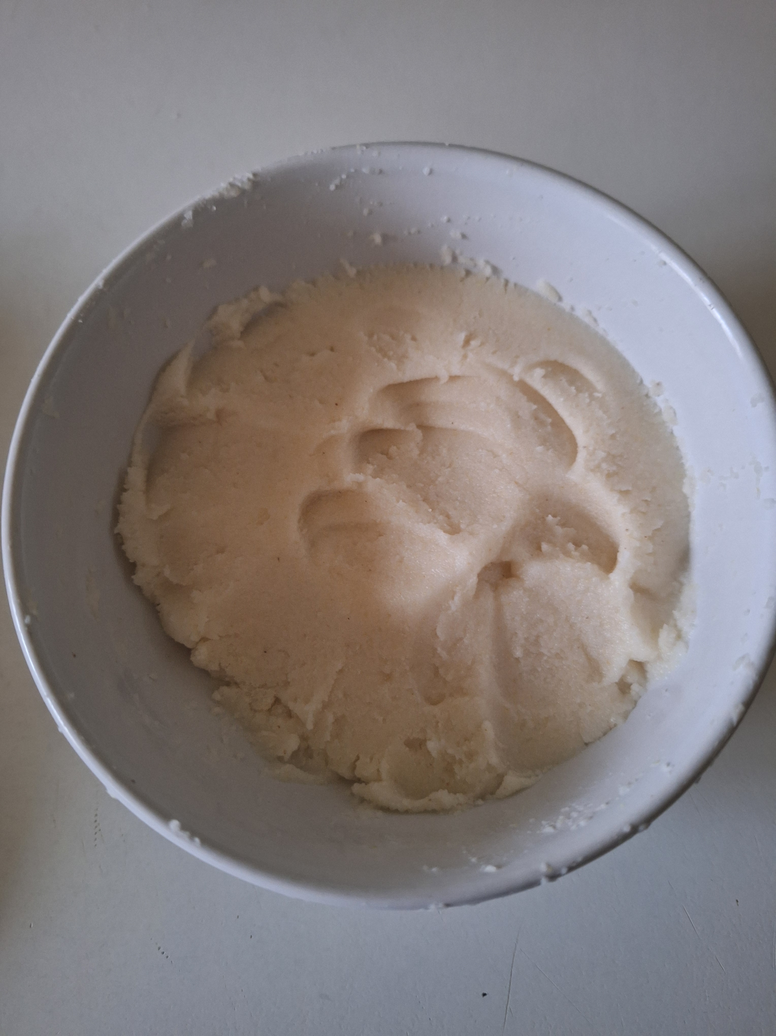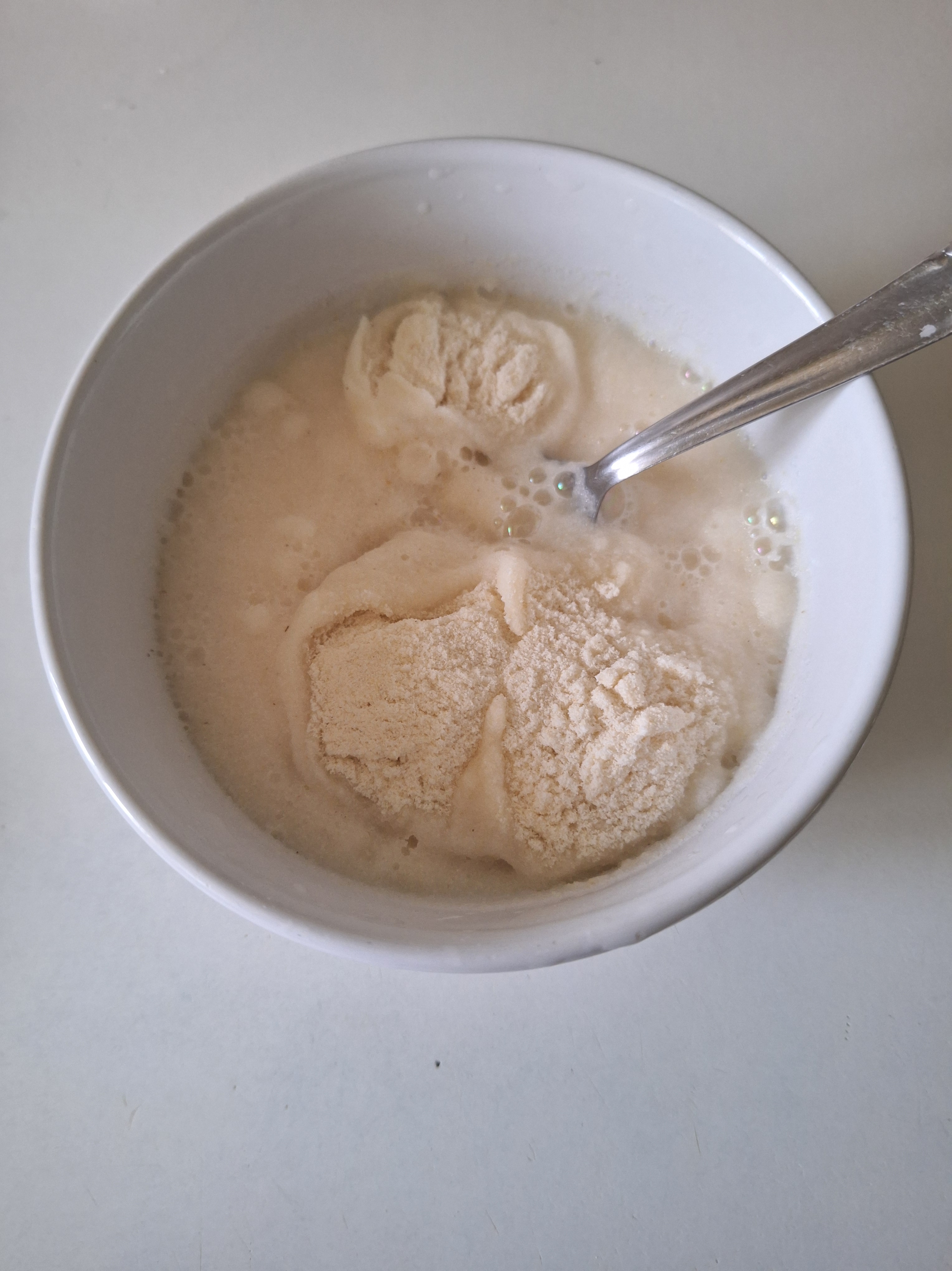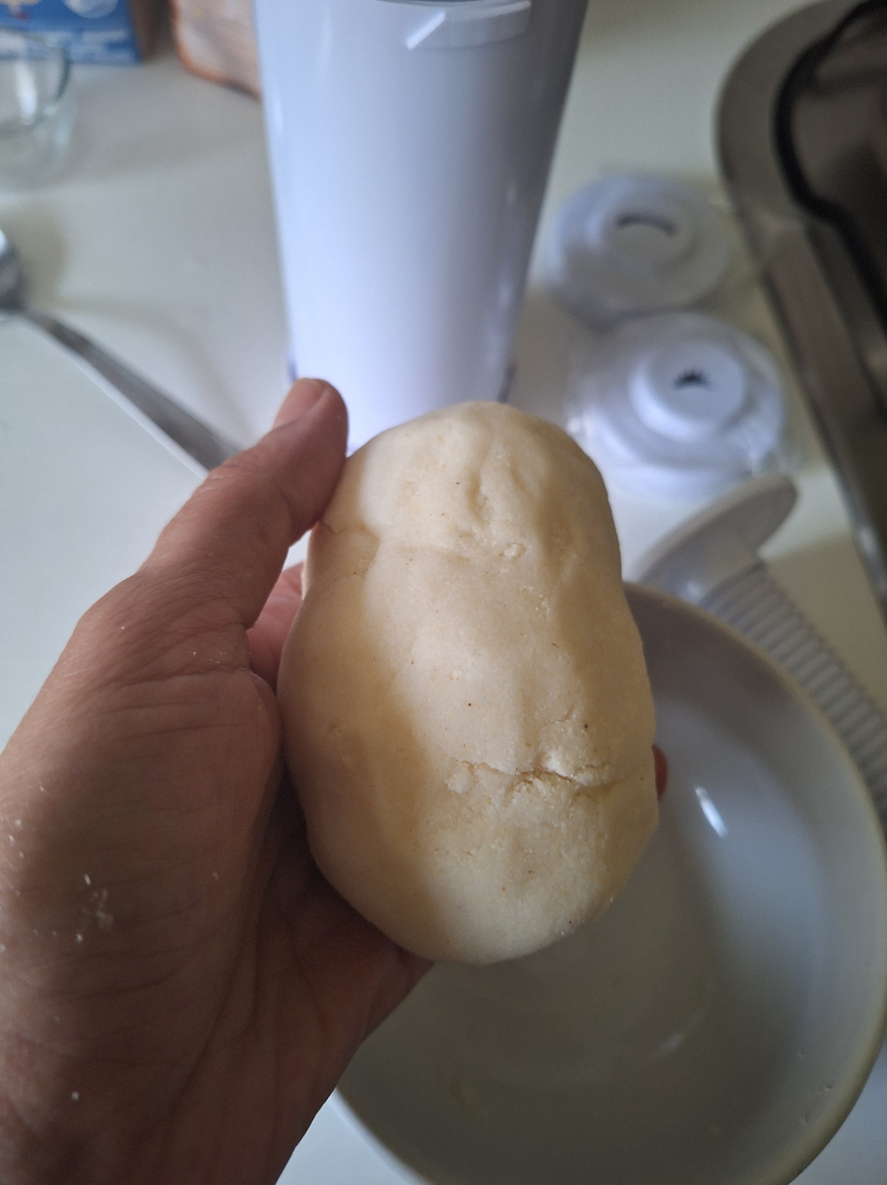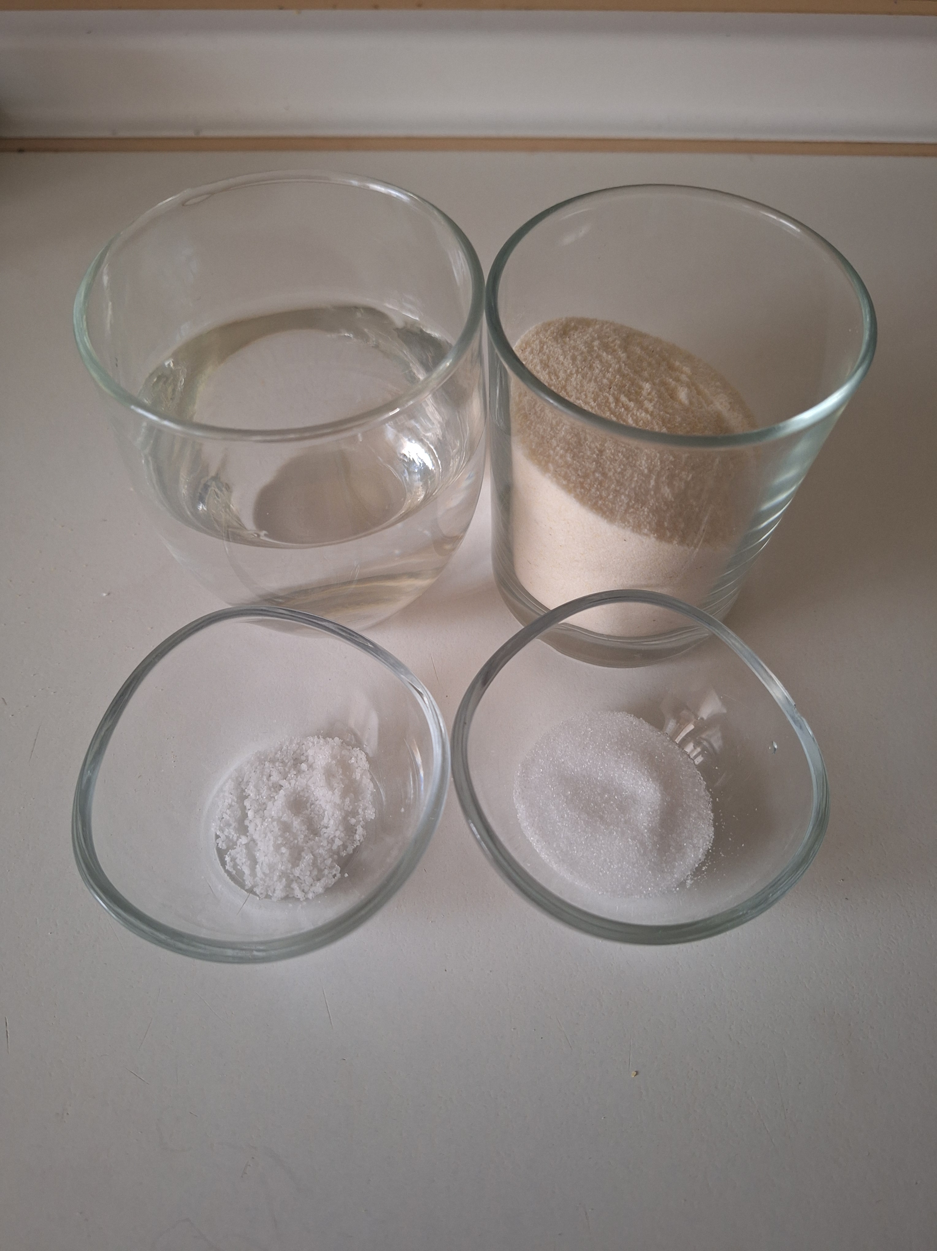 Disuelve la sal y el eritritol en el agua tibia. Después agrega a la harina y mezcla bien para que no queden partes secas. Deja reposar la masa unos 10 minutos para que se hidrate. Haz un cilindro con la masa e introduce en la churrera, intenta que queden huecos de aire para que no explote.