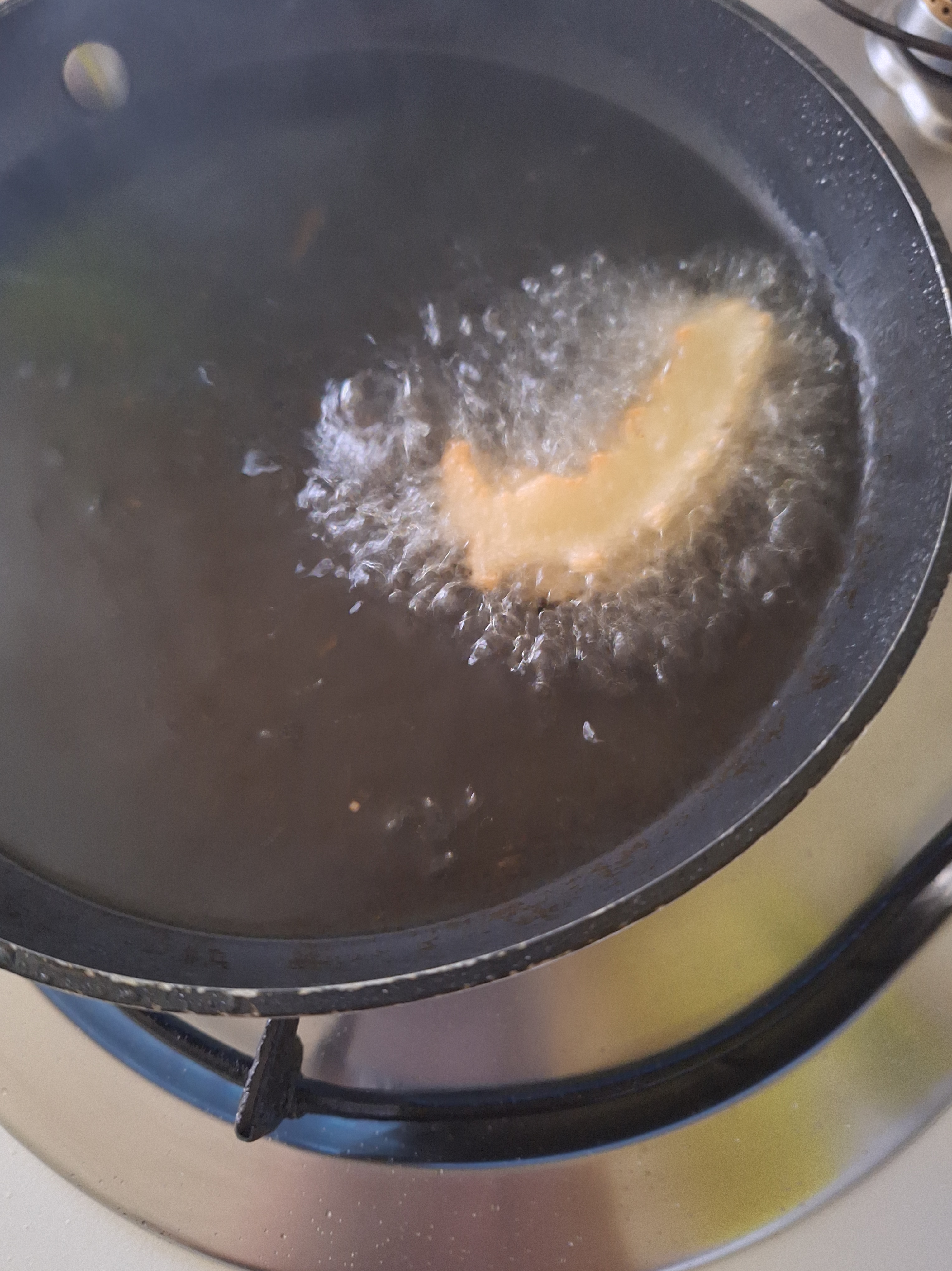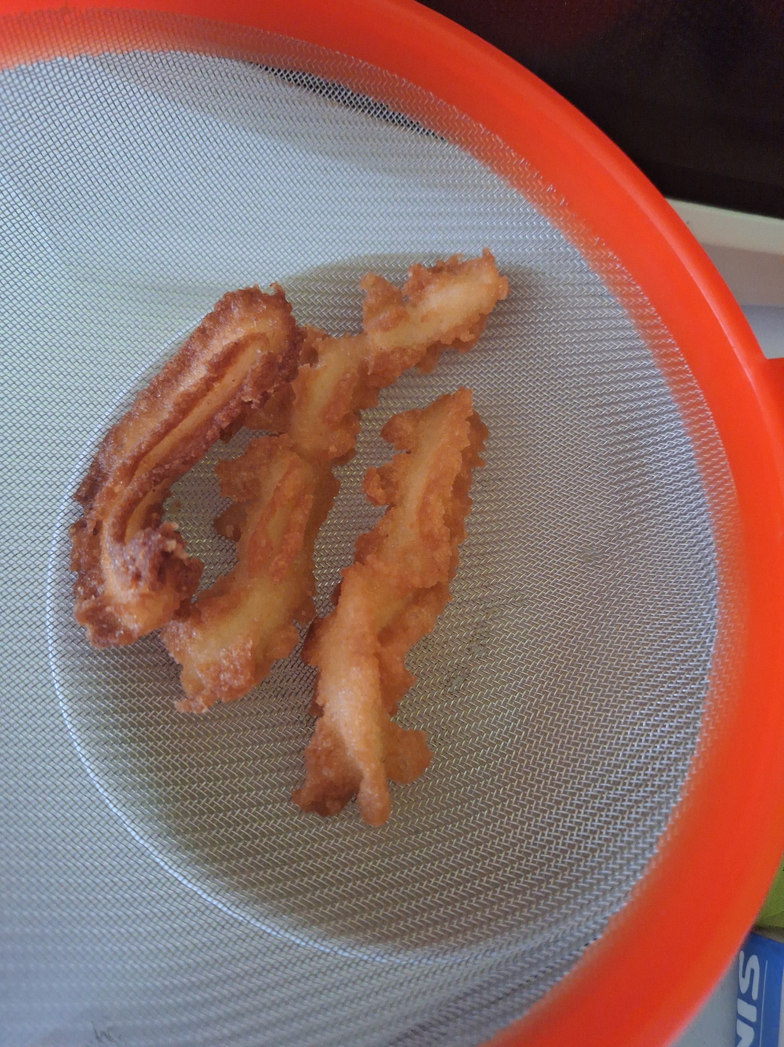 Calienta abundante aceite en una sartén y cuando esté bien caliente ve añadiendo los churros. No hagas muchos a la vez porque cuando introduces uno nuevo el resto suele acercarse y pegarse. Deja que se doren por todas partes, saca y elimina el exceso de aceite (con papel de cocina o sobre un colador, este truqui de Glutendence me ha gustado más).