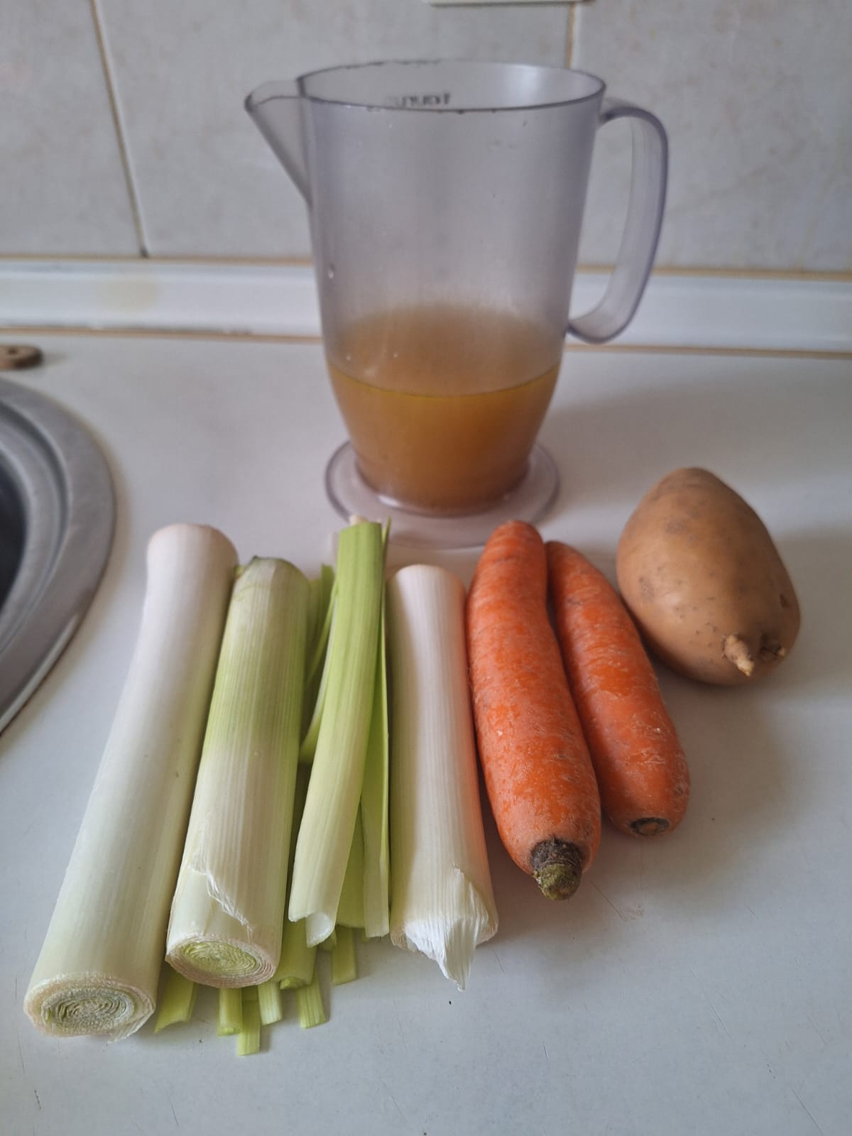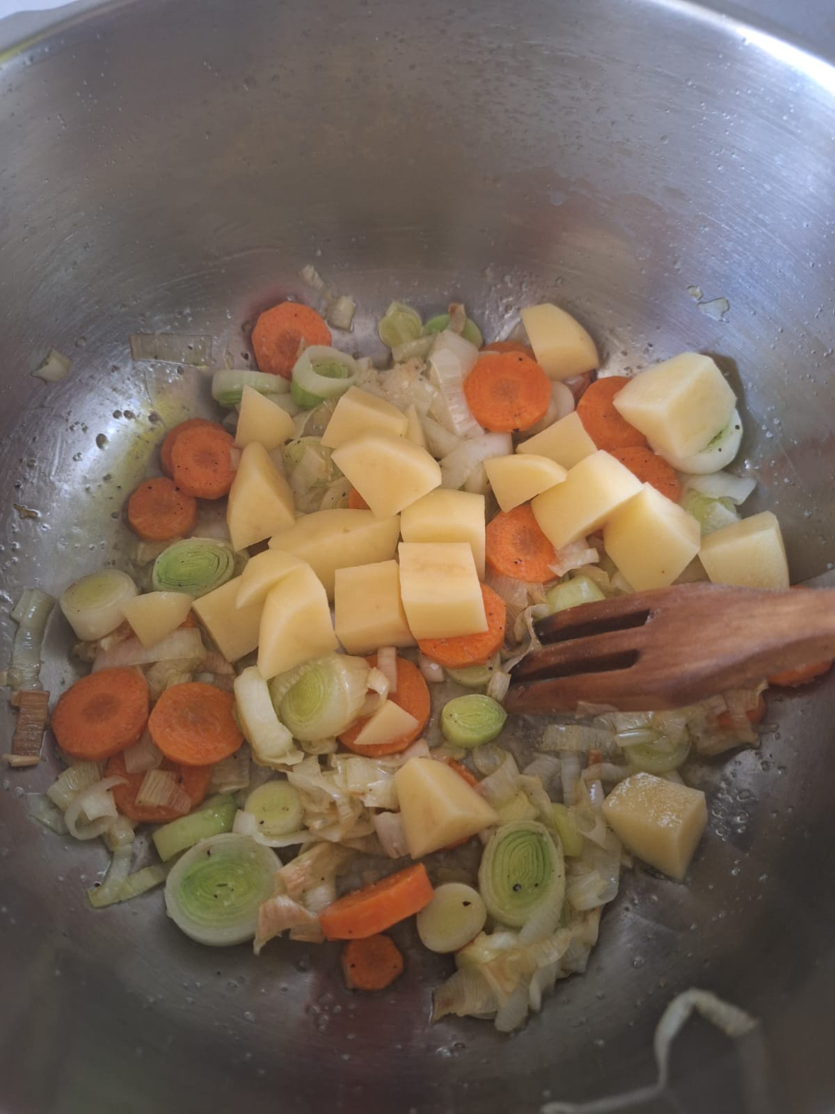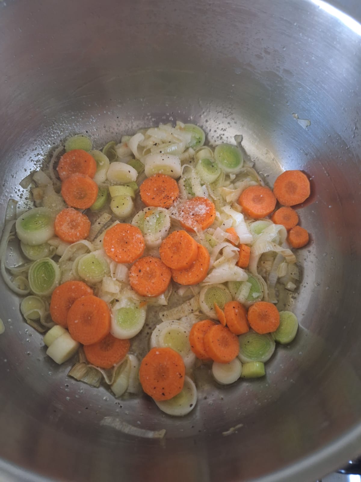 Limpia el puerro, corta en rodajas y pocha unos 5 minutos en una cazuela con poco aceite. Pela la zanahoria, corta en rodajas más o menos finas e incorpora al puerro. Sazona.