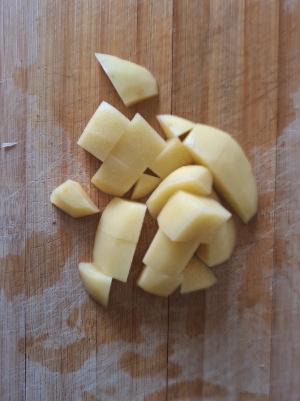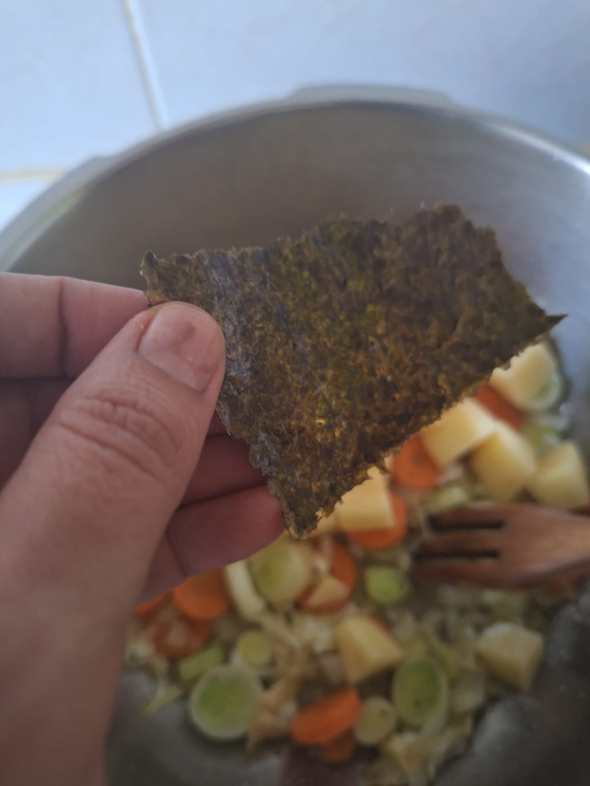 Pela la patata, corta en cubos medianos y agrega a lo anterior. Añade también el alga desmenuzada y mezcla bien unos minutos. Incorpora el caldo de verduras, cubre con una tapadera y deja cocer a fuego bajo unos 25-30 minutos o hasta que las verduras estén tiernas.
