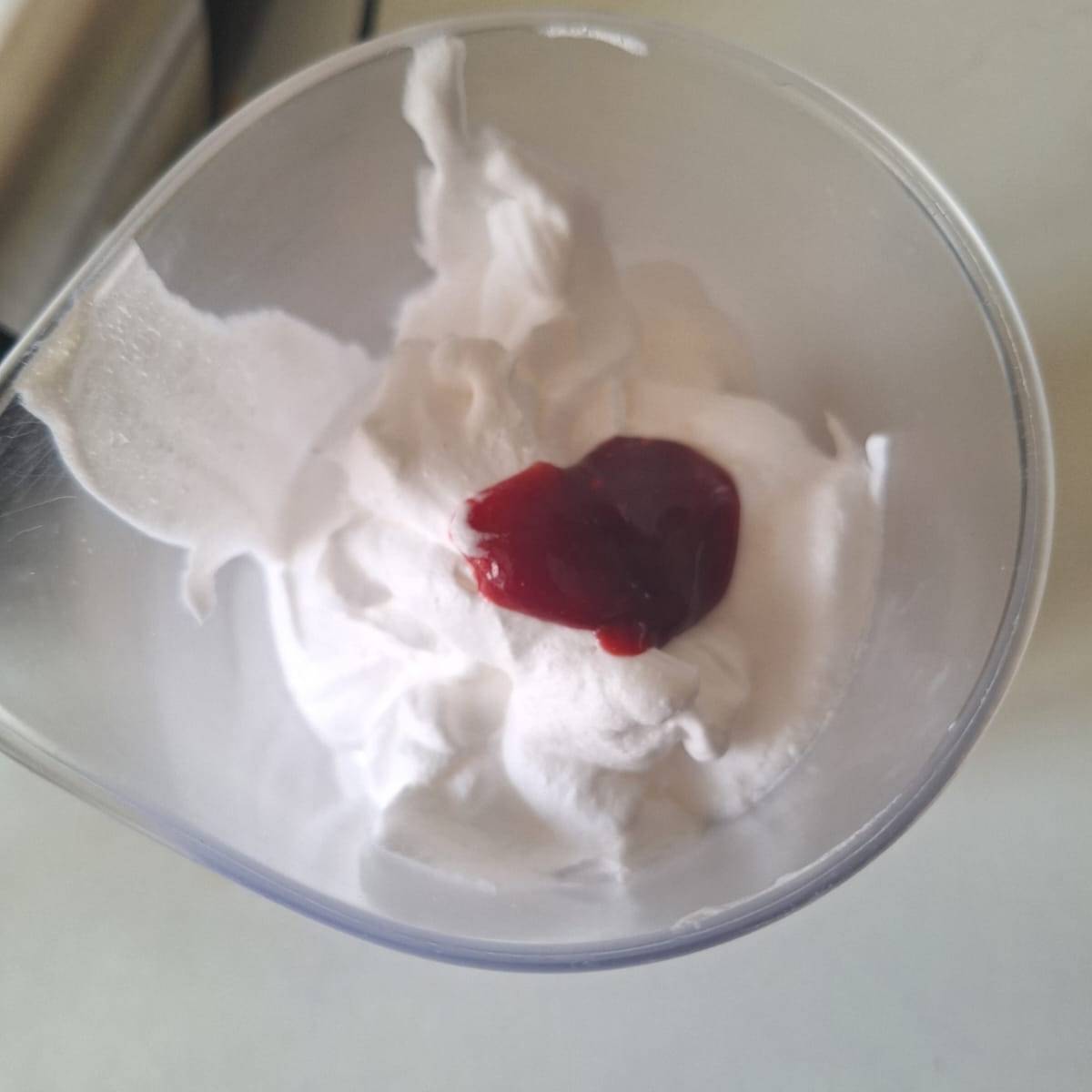 Prepara la nata: vierte el puré de frambuesa junto con el eritritol y el agar agar en una sartén y lleva a ebullición. Hierve 2 minutos removiendo. Retira del fuego y deja atemperar. Monta la nata (puedes añadir un poco más de eritritol si lo deseas). Agrega poco a poco la frambuesa e integra. Lleva al frigo hasta el momento de servir.