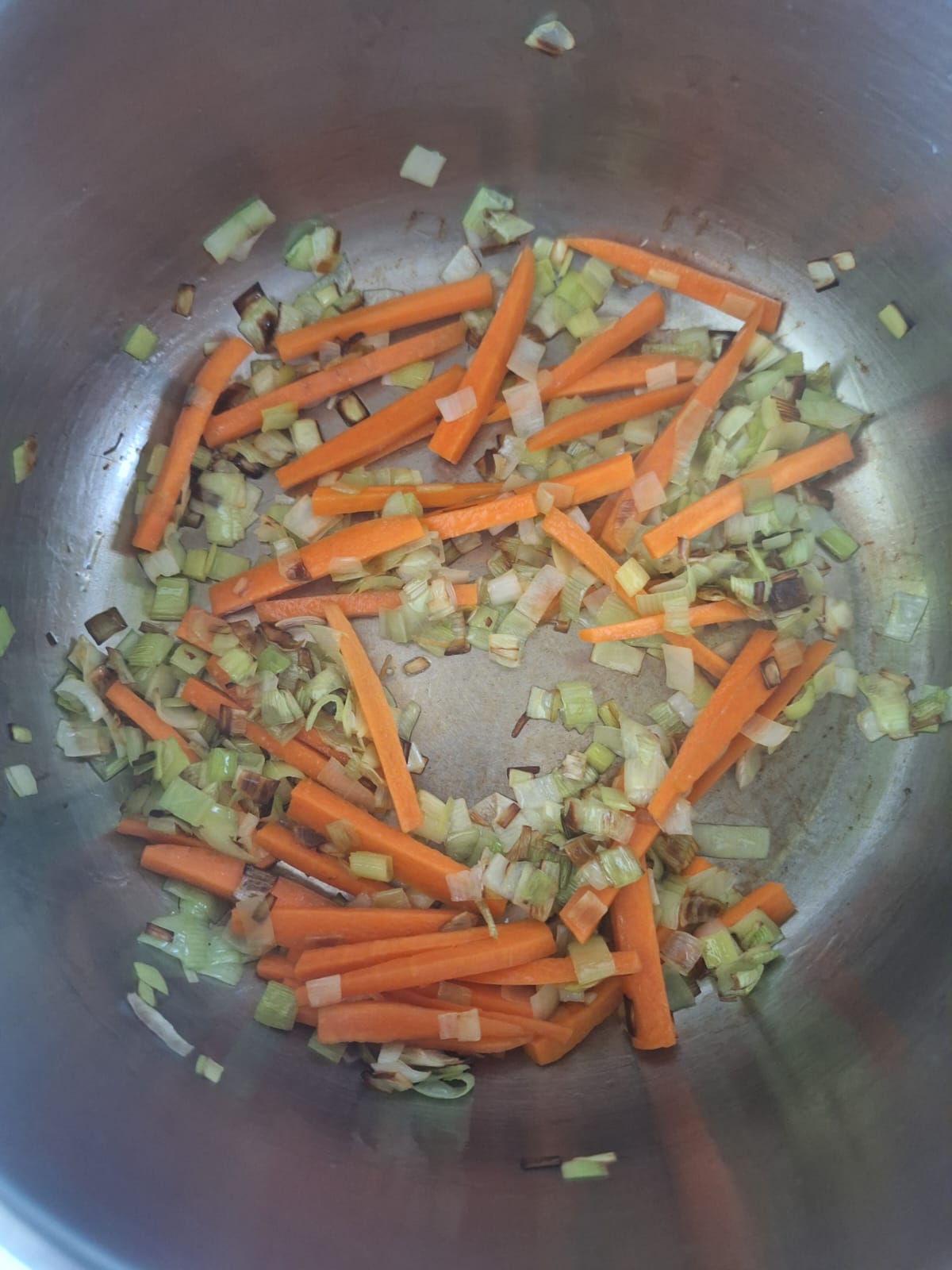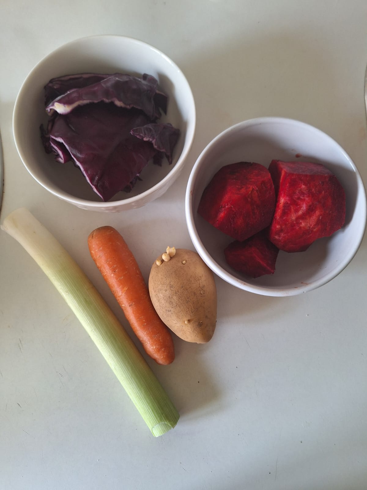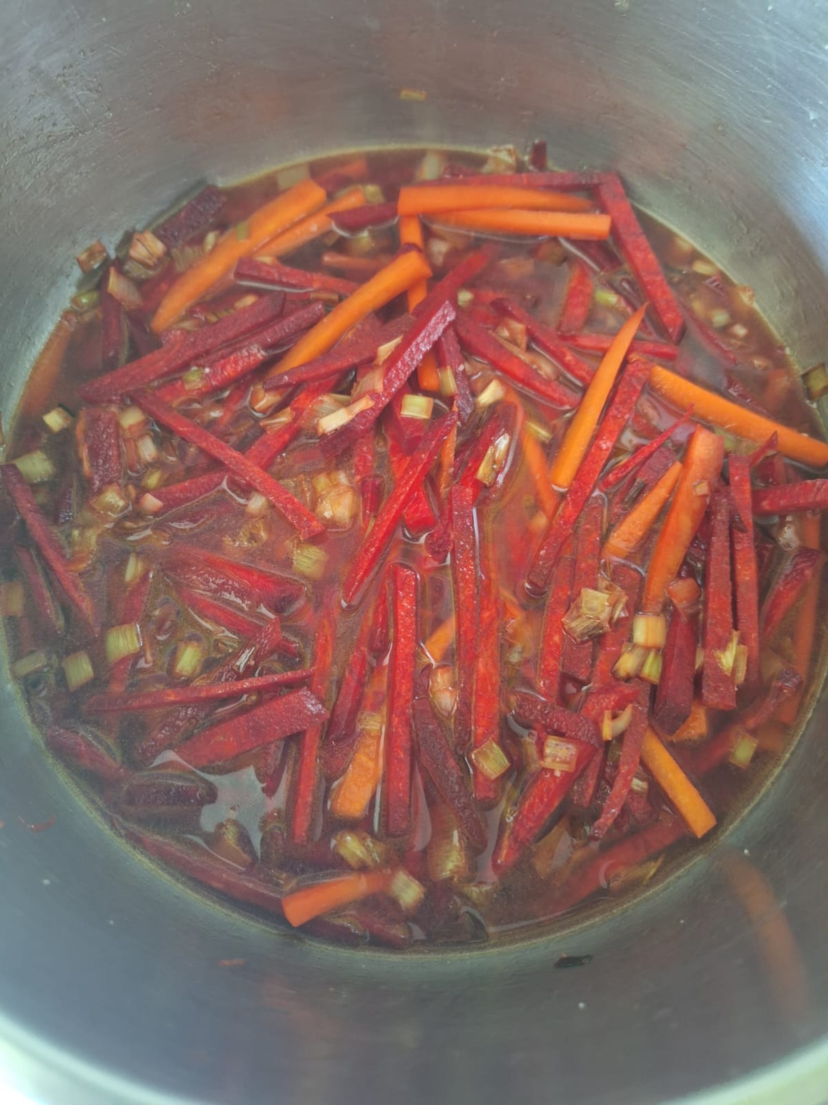 En una sartén con 2-3 cucharadas de aceite dora el puerro. Agrega la zanahoria y cocina un par de minutos. Por último, la remolacha y cocina otros dos minutos más. Agrega 300 ml de agua y lleva a ebullición. Una vez empiece a hervir baja el fuego y cocina unos 50 minutos.