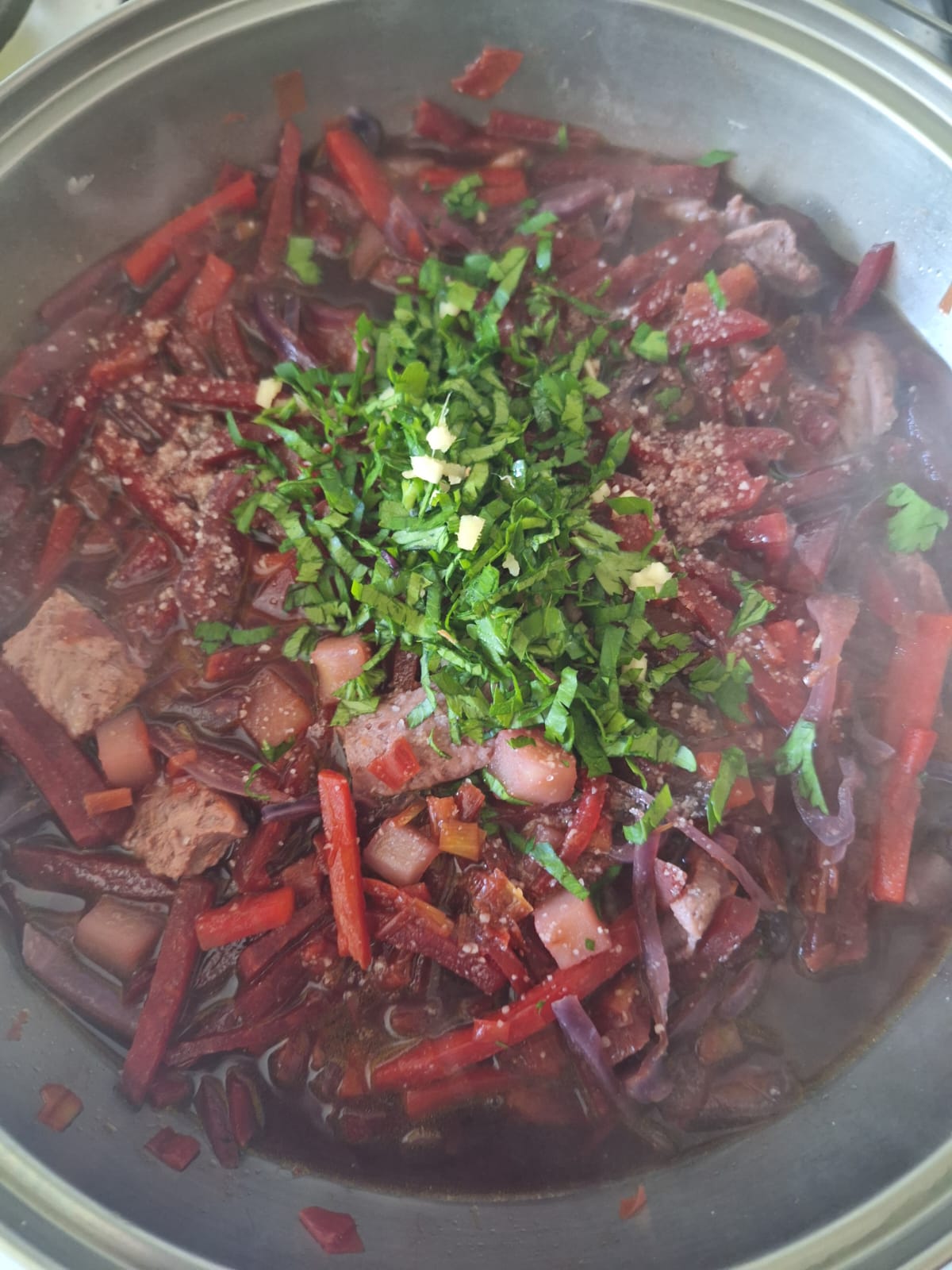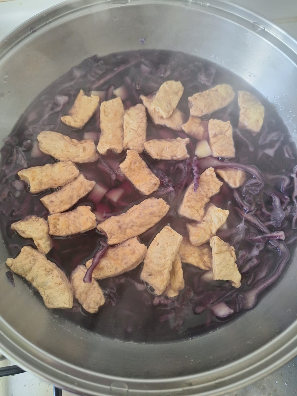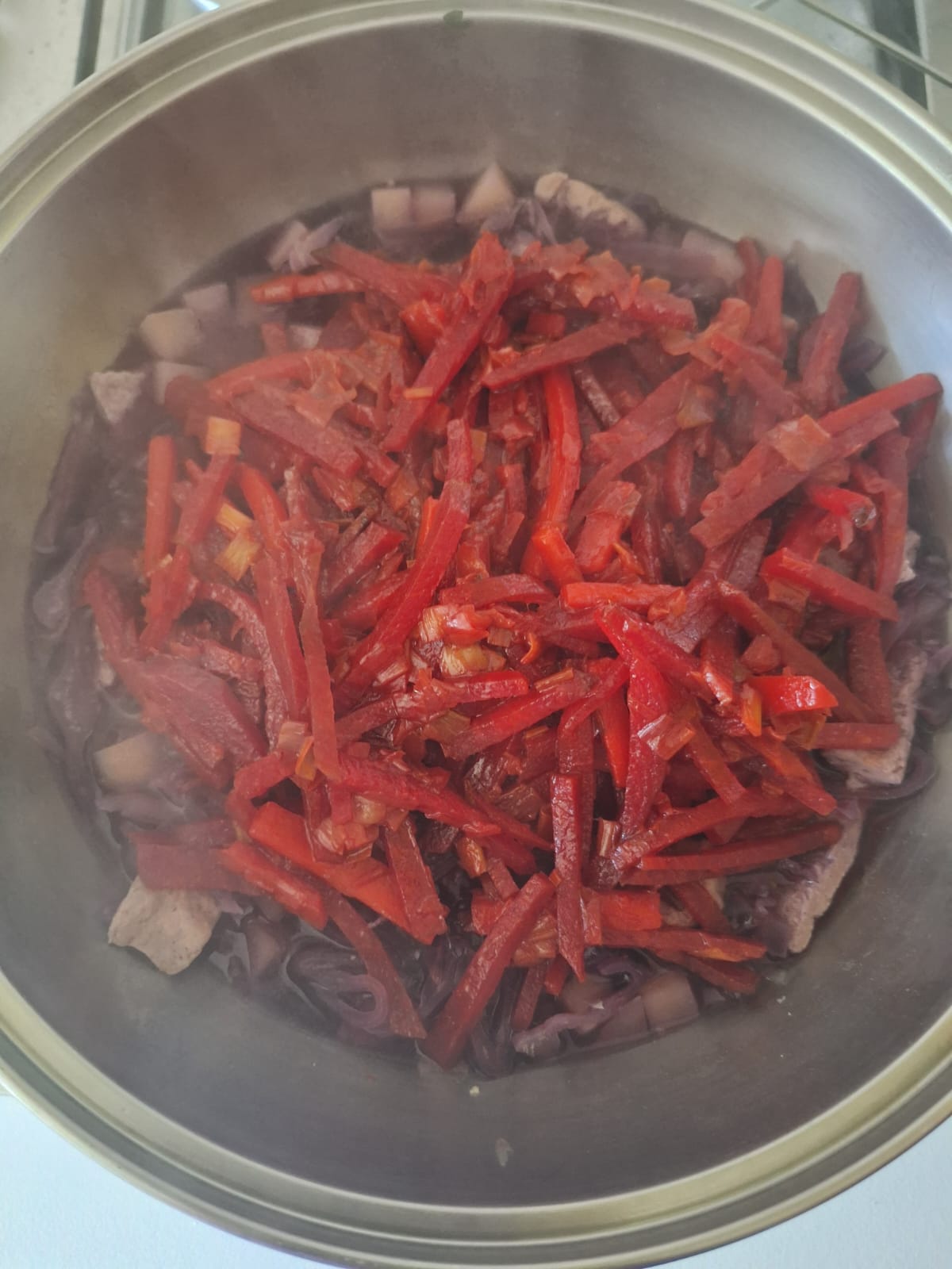 Retira el puerro, el laurel y la pimienta del caldo y lleva a ebullición. Agrega entonces la lombarda y cocina 5 minutos. Después añade la patata y las tiras de carne vegetal y cocina otros 10 minutos. Incorpora a esto la remolacha y la zanahoria. Ajusta la cantidad de caldo (es una sopa espesa). Retira del fuego.