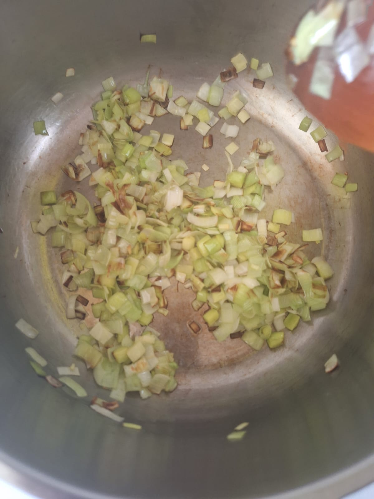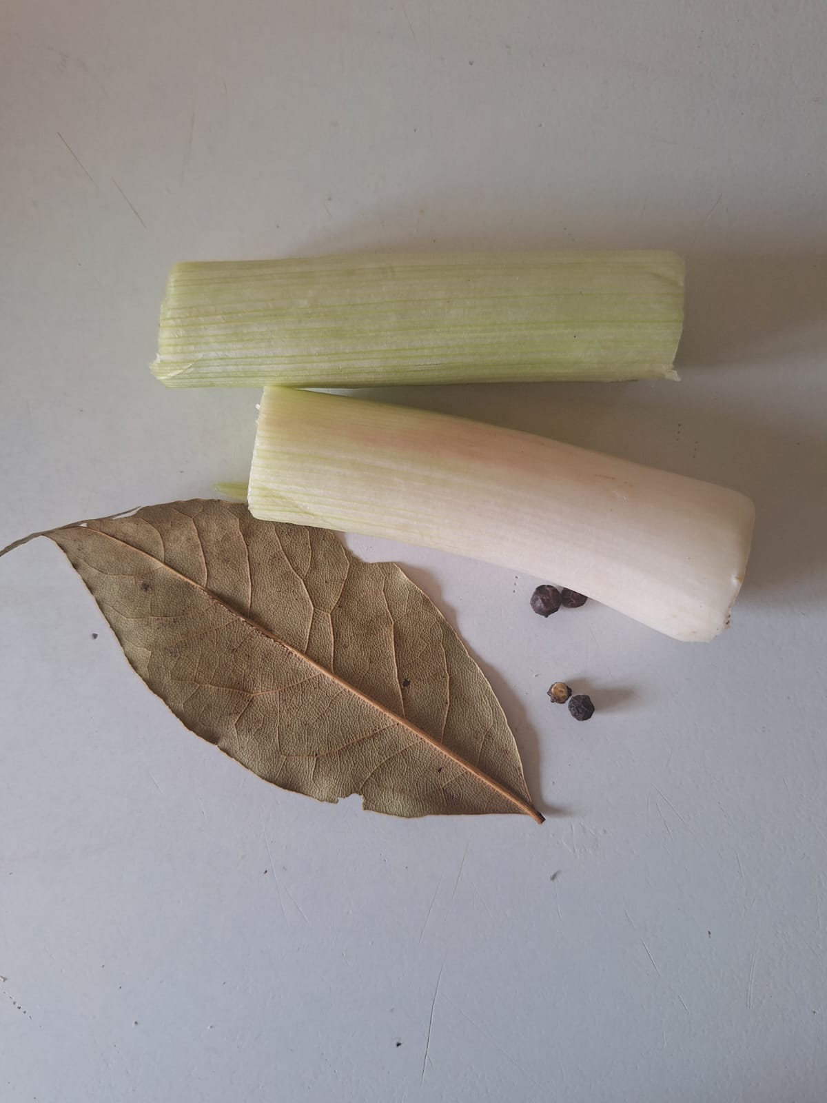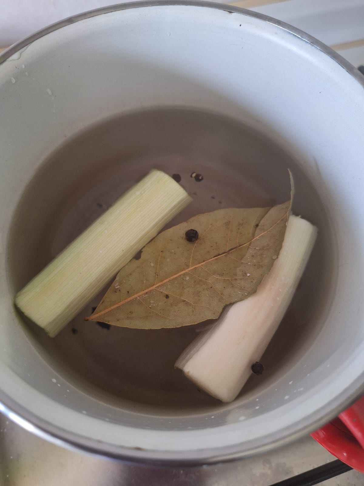 Prepara el caldo, cociendo a fuego bajo el puerro, laurel, sal y pimienta.