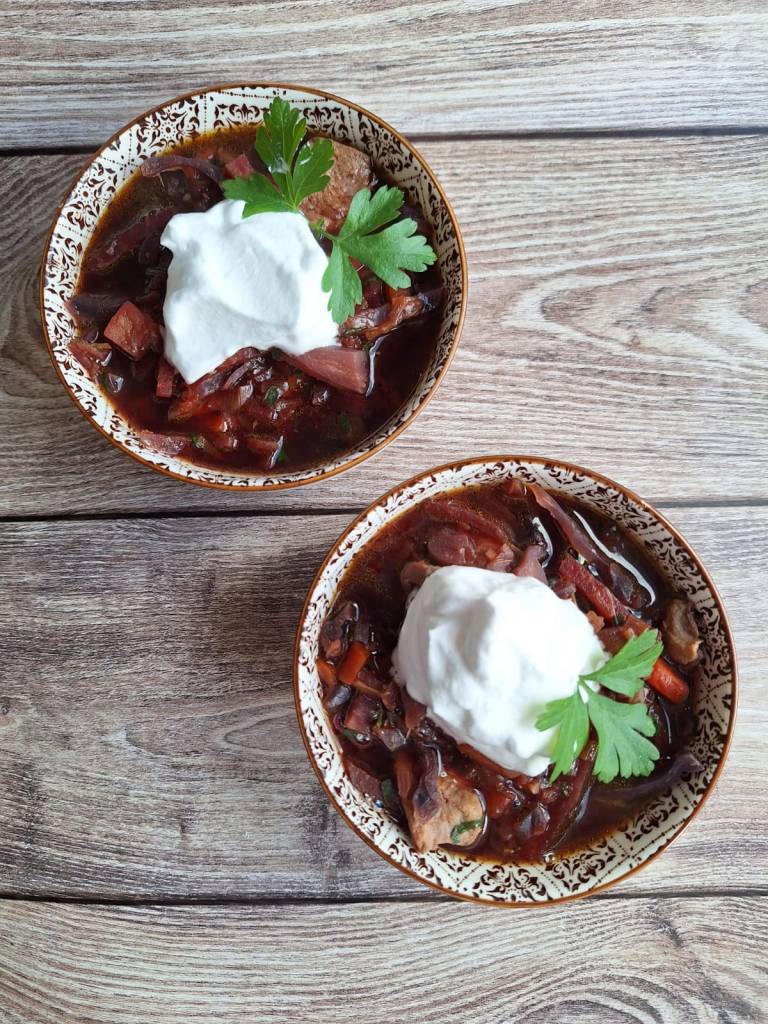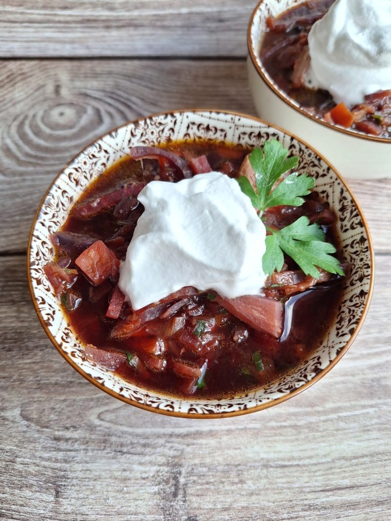 !Buenos días cauliflagüers! El catarro me ha pillado con ganas y mi cuerpo pide descanso y recetas calentitas y cargadas de vitaminas y nutrientes. Hoy os traigo un plato que llevaba mucho tiempo con ganas de probar. Se trata de la sopa Borsch, una sopa ucraniana con un color intenso y todo el sabor de los alimentos del otoño. Seguí el paso a paso de Esbieta, nadie mejor que ella para explicar cómo hacer esta sabrosa sopa, pero ajustada a mis necesidades. Esto significa que no lleva ni carne, ni tomate, ni ajo, ni crema agria,… Ella utiliza repollo, pero yo no tenía, así que utilicé col lombarda. La carne la he sustituido por una alternativa vegetal de haba y guisante.