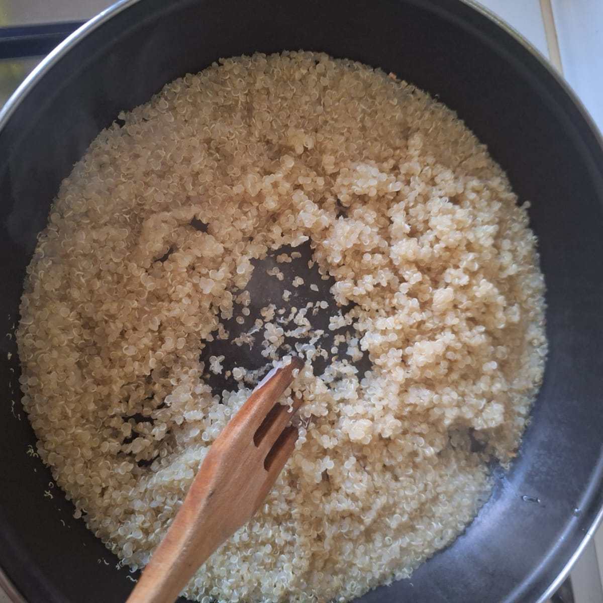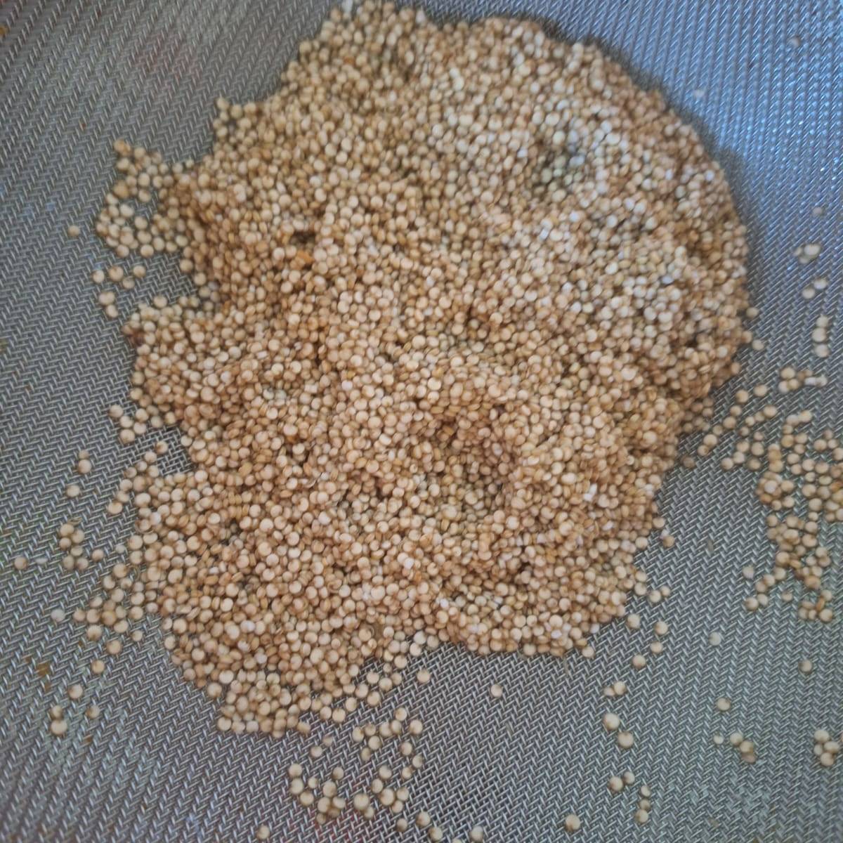 Lava la quinoa hasta que el agua salga clara. Vierte en una sartén sin aceite y cocina a fuego bajo hasta que esté seca (desprende olorcito a nuez). Agrega 3 partes de agua y lleva a ebullición. Baja el fuego al mínimo y cocina 10-15 minutos o hasta que haya absorbido toda el agua. Destapa, separa los granos con un tenedor y deja enfriar. Reserva.