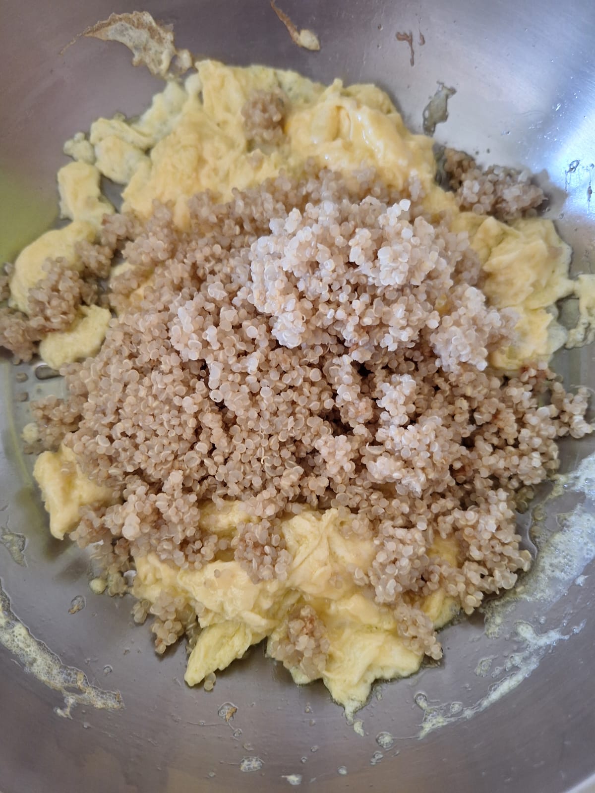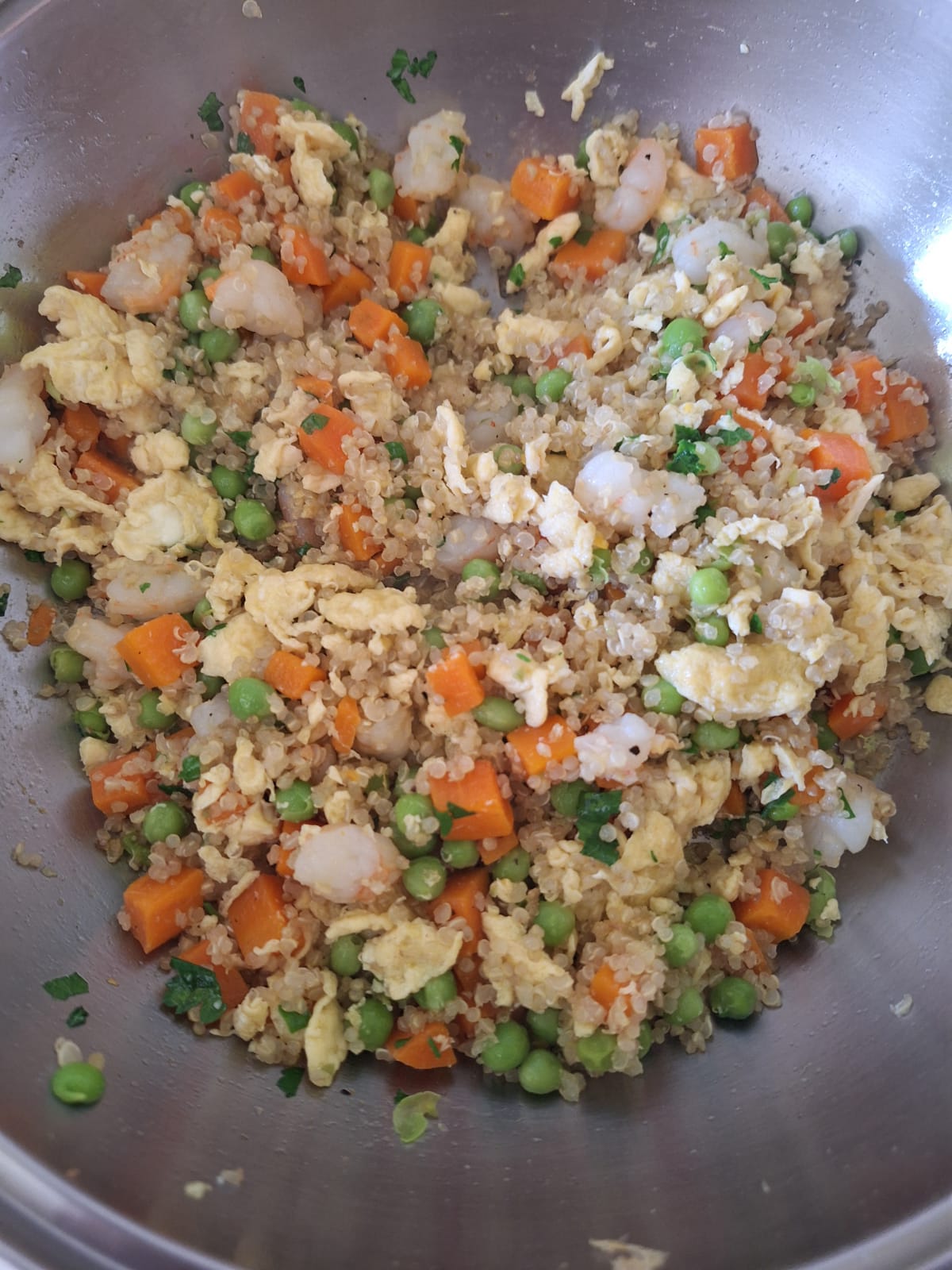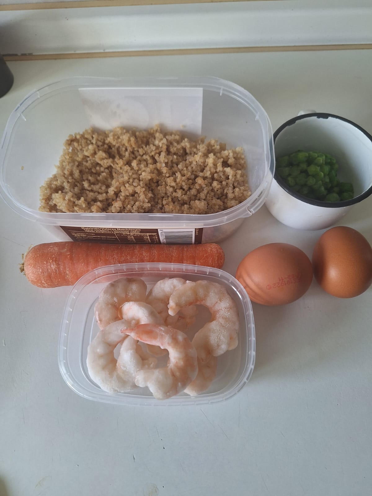 En una sartén calienta un par de cucharadas de aceite y vierte el huevo batido. Mueve con una cuchara de palo para que cuaje. Agrega la quinoa y mezcla todo bien durante unos minutos, que se separen los granos. Por último, añade los guisantes, la zanahoria y las gambas. Sazona y mezcla bien. Sirve bien calentito y disfruta.