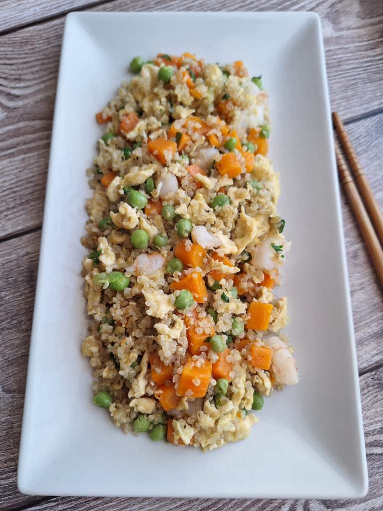 Desde mi cambio de dieta, el arroz se ha convertido en uno de mis básicos y también la quinoa. Así que, como soy un poco retorcida, en lugar de hacer la receta típica con arroz he decidido hacer la versión con quinoa. No os podéis imaginar lo rica que queda. Si os soy sincera, creo que es mi receta favorita de quinoa hasta el momento y ya llevo unas cuantas. No he añadido carne al plato, tan sólo unas gambas, guisantes, zanahoria y huevo. Tampoco he añadido salsa de soja porque no puedo tomar fermentos ni soja. Pero, si a ti no te hace ningún daño, te aconsejo encarecidamente que le añadas un chorrito al final, porque el sabor que le va a dar al plato va a ser auténtico.