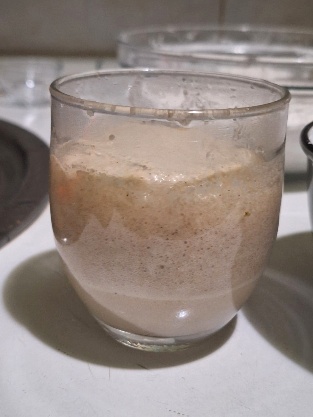 Prepara el prefermento disolviendo la levadura seca, el eritritol y la harina de trigo sarraceno en el agua tibia. Cubre con film y deja reposar hasta que esponje.