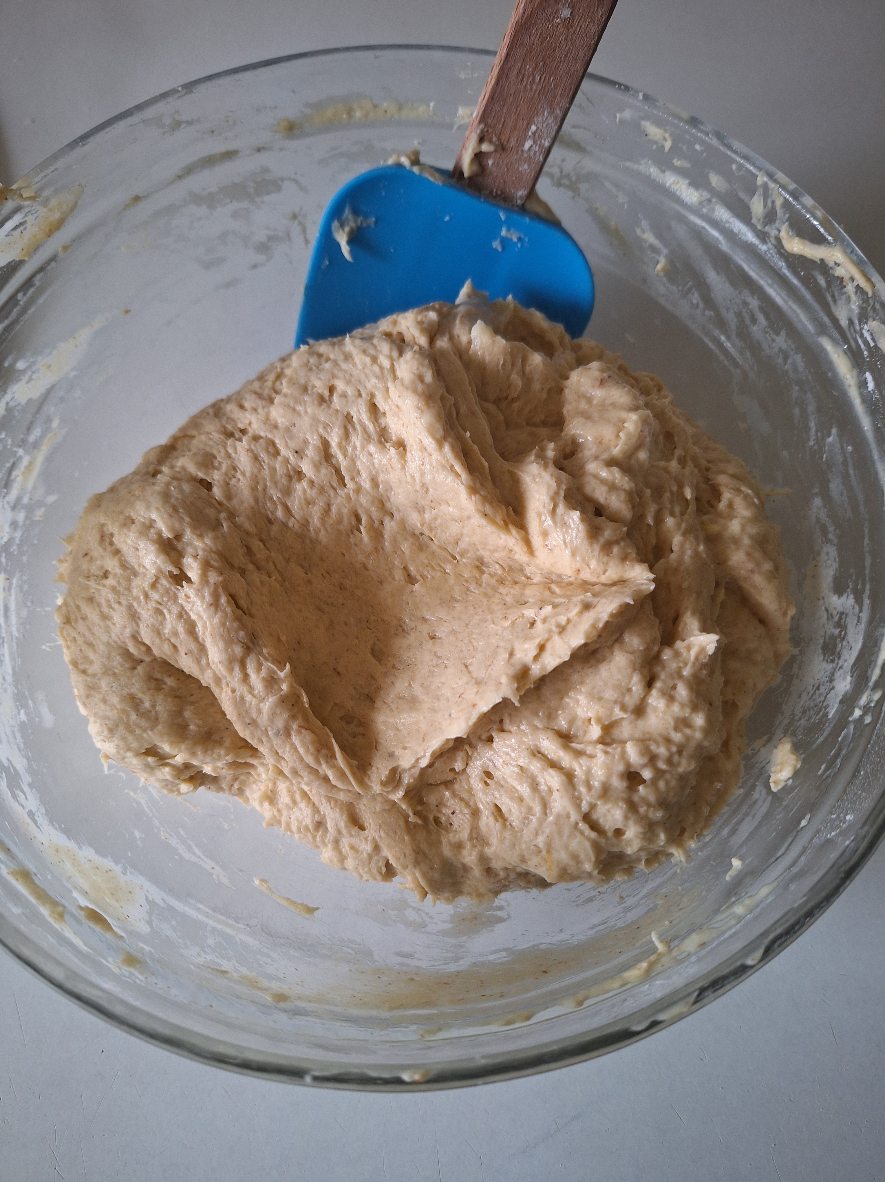 Vierte la masa sobre una superficie y amasa (con ayuda de una espátula) durante unos 10 minutos o hasta que adquiera una textura lisa.