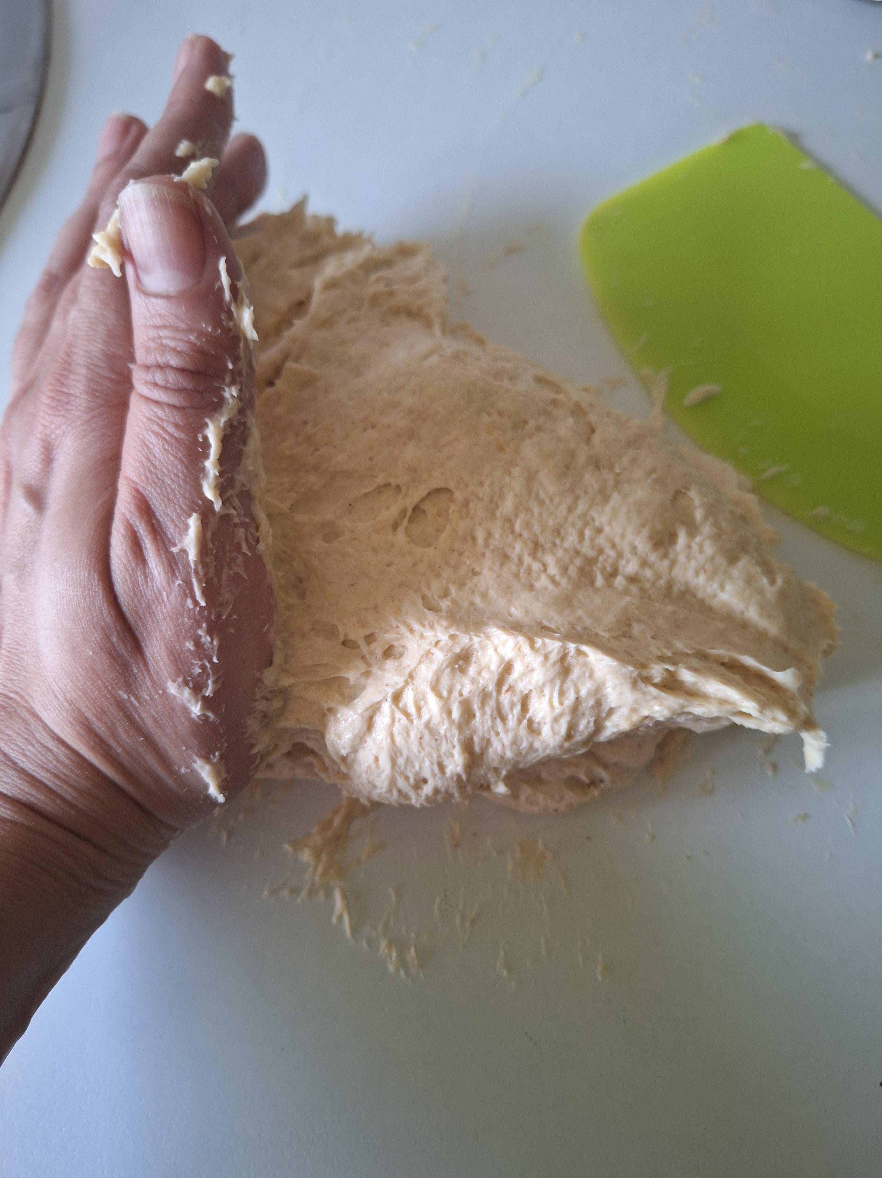 Engrasa la espátula y forma una bolita. Engrasa papel vegetal, extiende la masa haciendo un rectángulo y después enrolla sin presionar demasiado. Cierra el borde y coloca en un molde previamente engrasado. Cubre con film y deja que doble volumen.